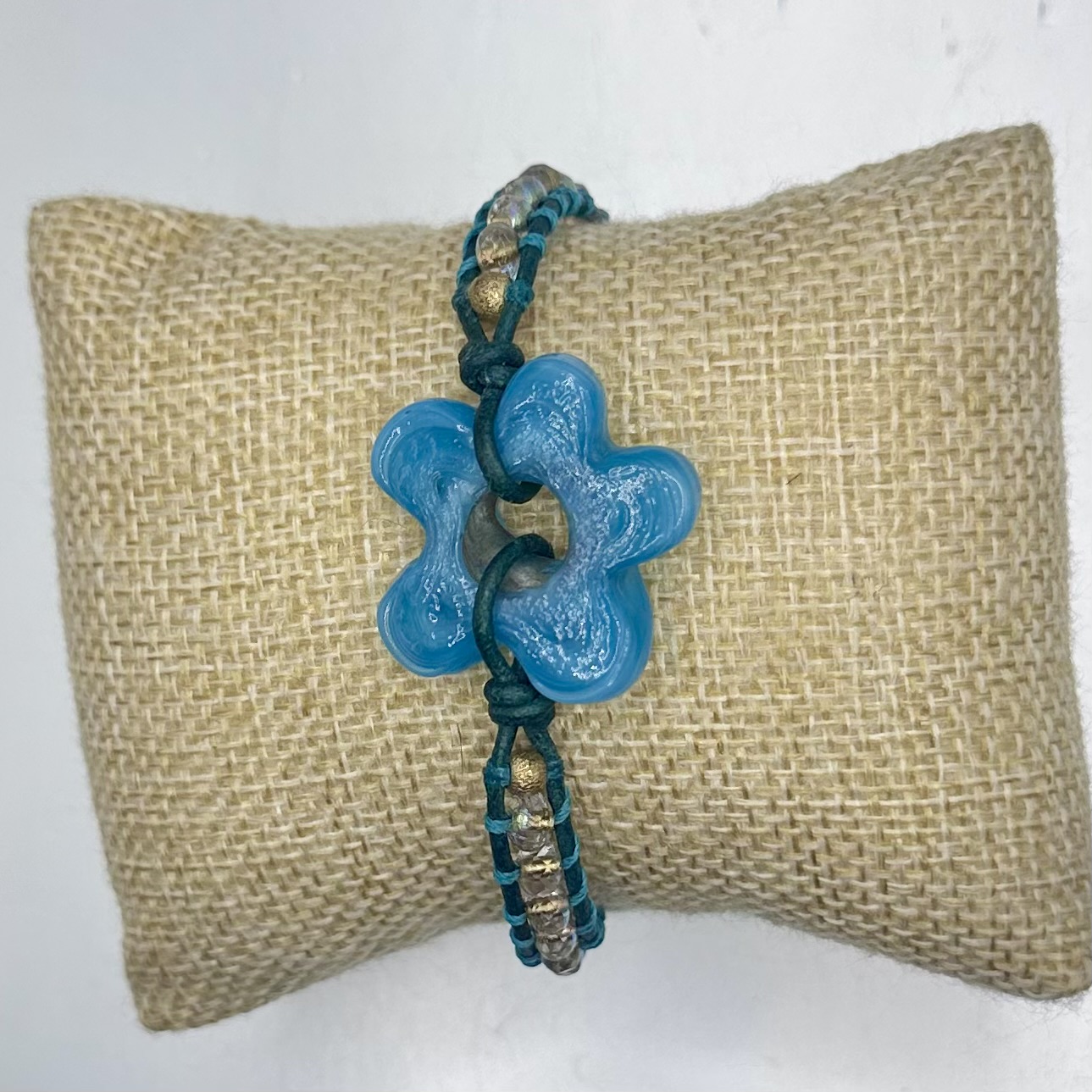This handcrafted wrap bracelet brings together dreamy artisan charm and traditional old world elegance. A bright Turquoise Venetian glass flower takes center stage in this stunning one of a kind bracelet..
