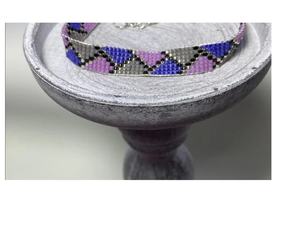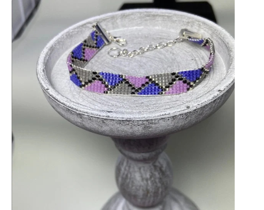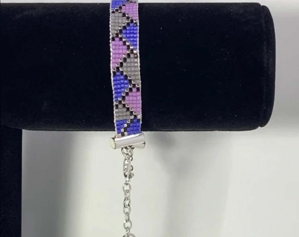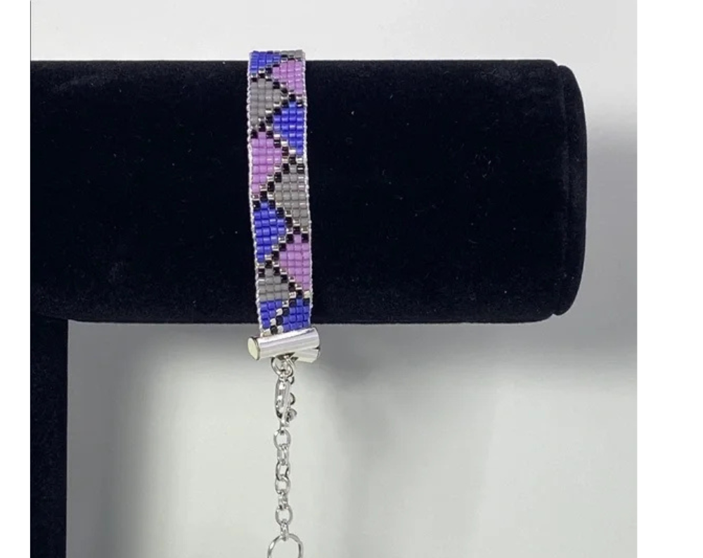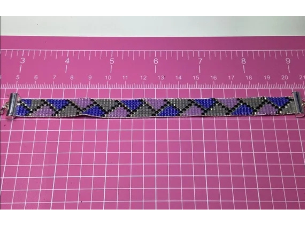 Handcrafted Loom-Beaded Bracelet Geometric Pattern in Purple, Blue, and Gray