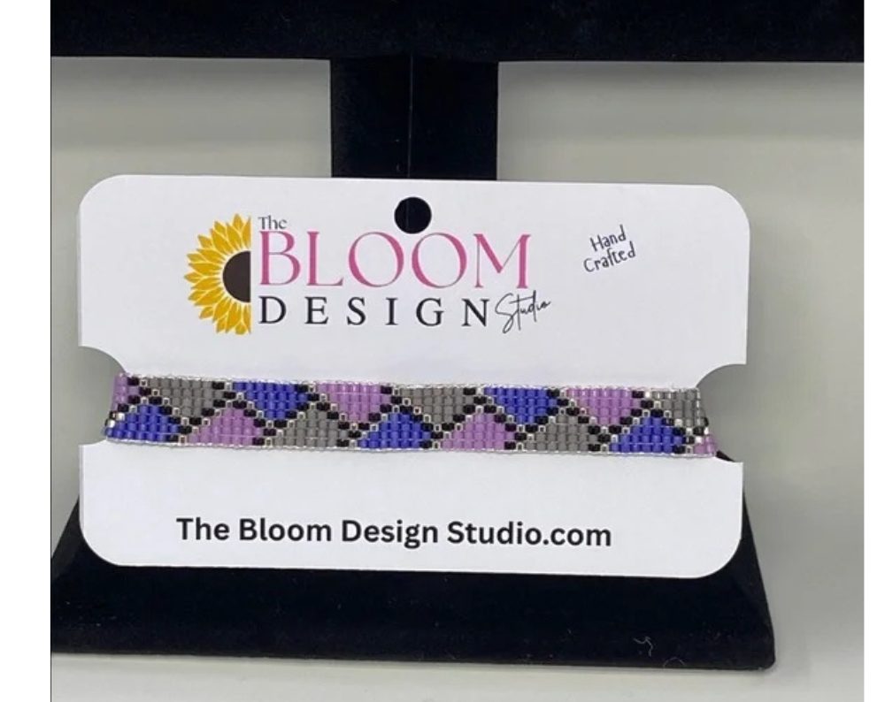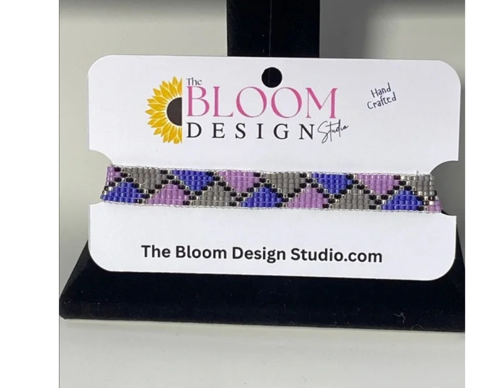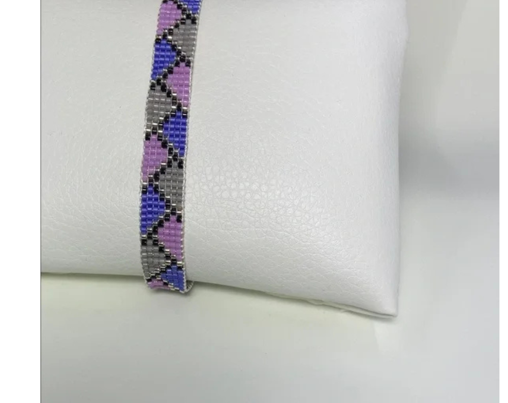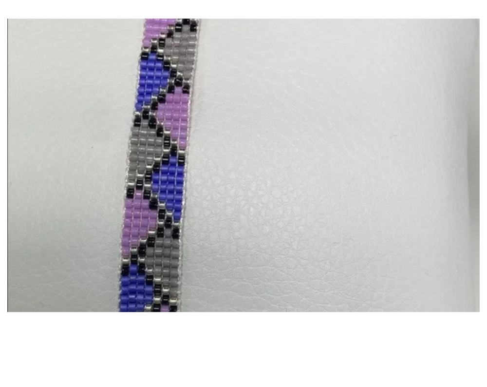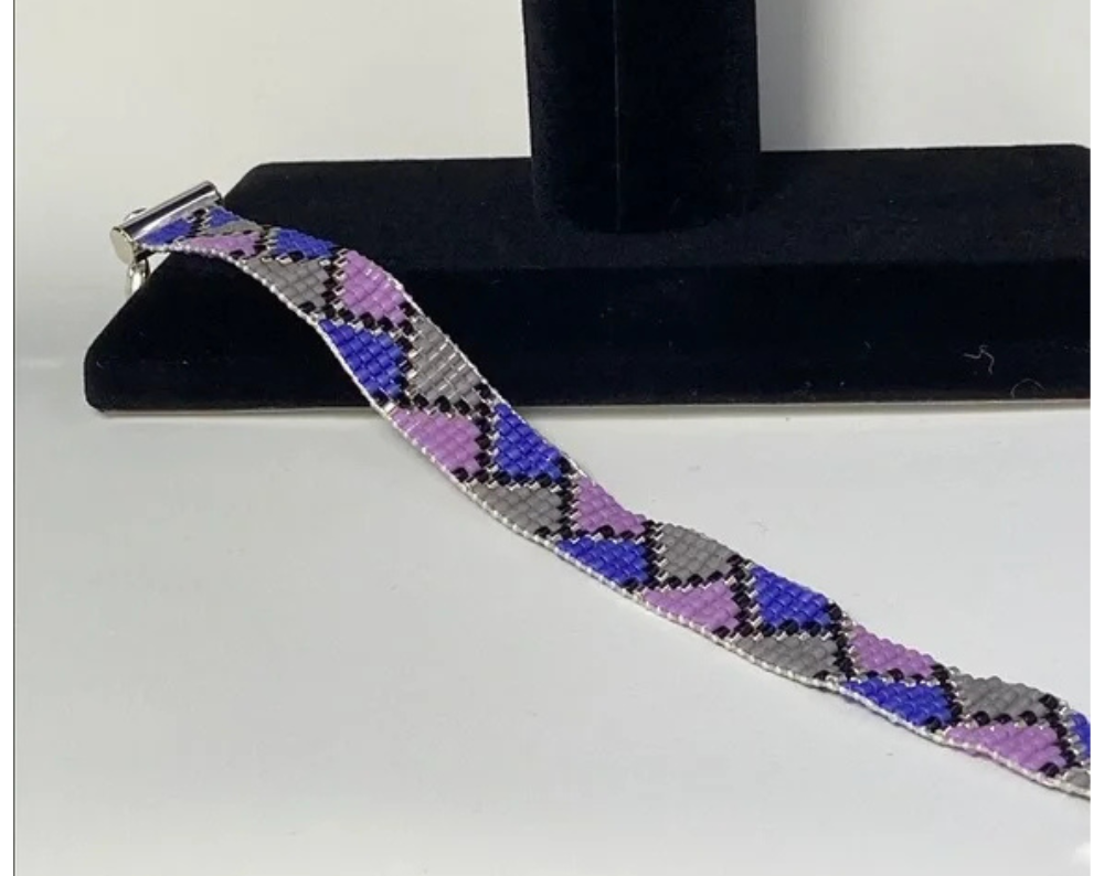 Handcrafted Loom-Beaded Bracelet Geometric Pattern in Purple, Blue, and Gray