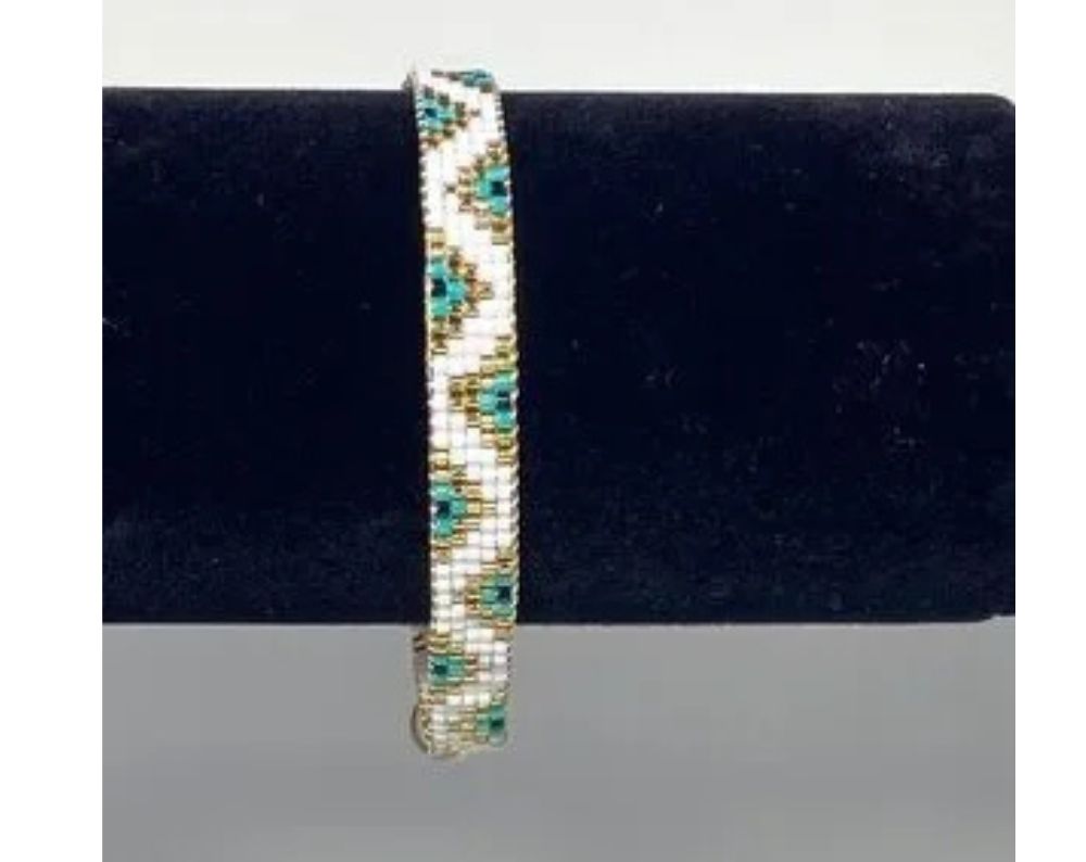 Add a unique touch to your accessory collection with this handcrafted loom-beaded bracelet.