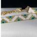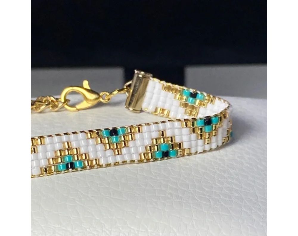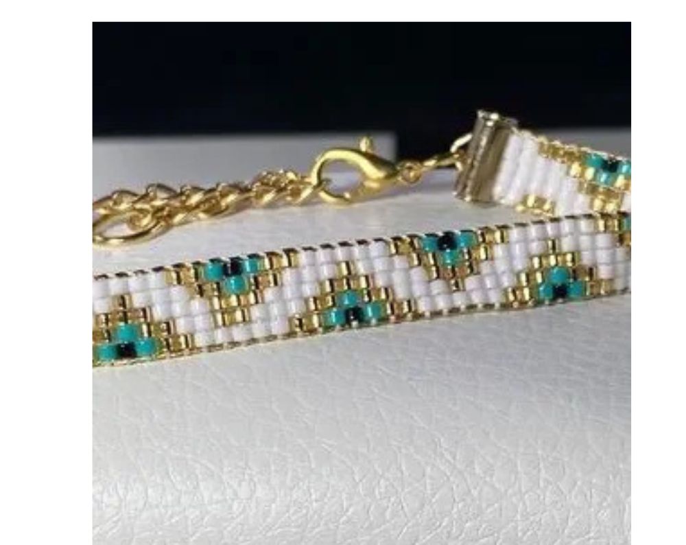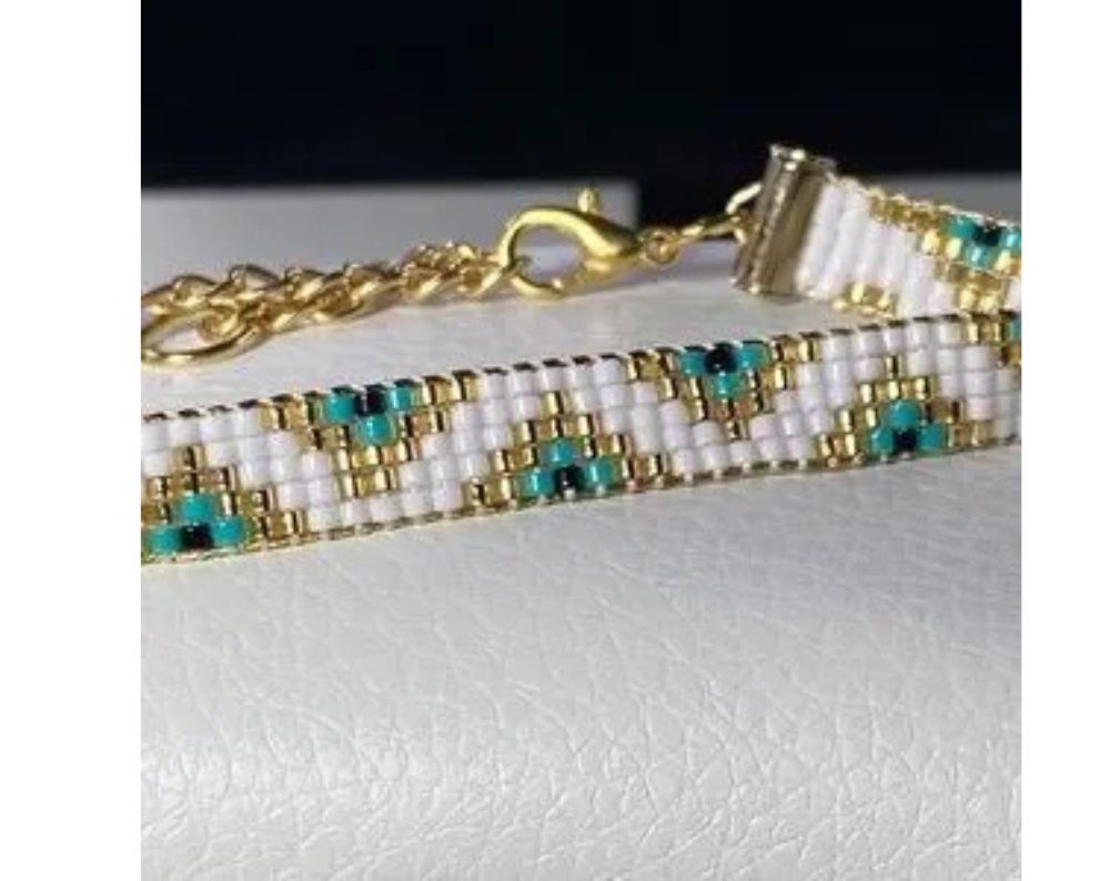 Traditional Native American Indian style beading ,weaving ,woven boho bohemian. Turquoise . Chic bracelet featuring intricate gold and teal beadwork. Stylish and versatile accessory. Great gift idea for her for Mother's Day ,Birthday or Christmas.