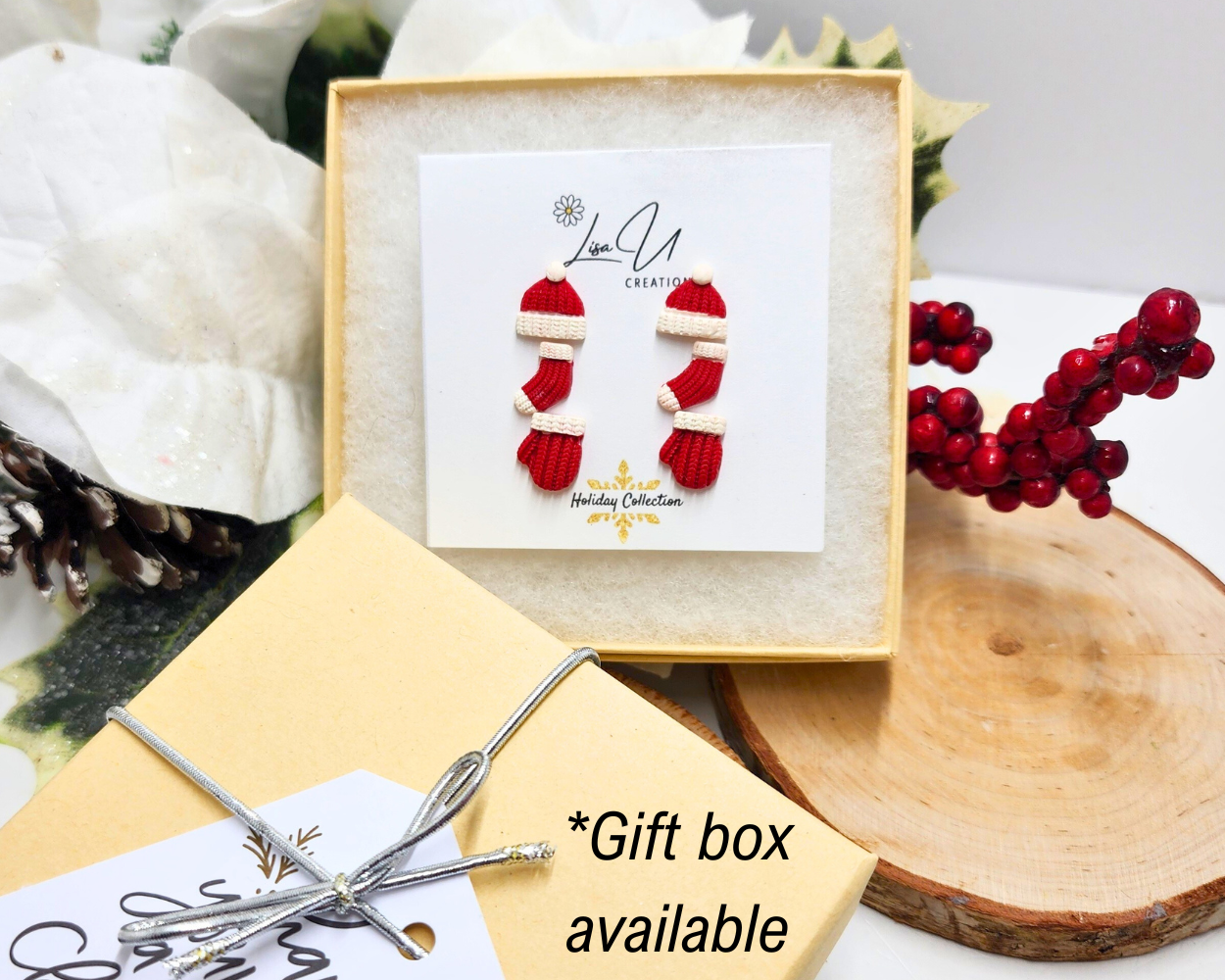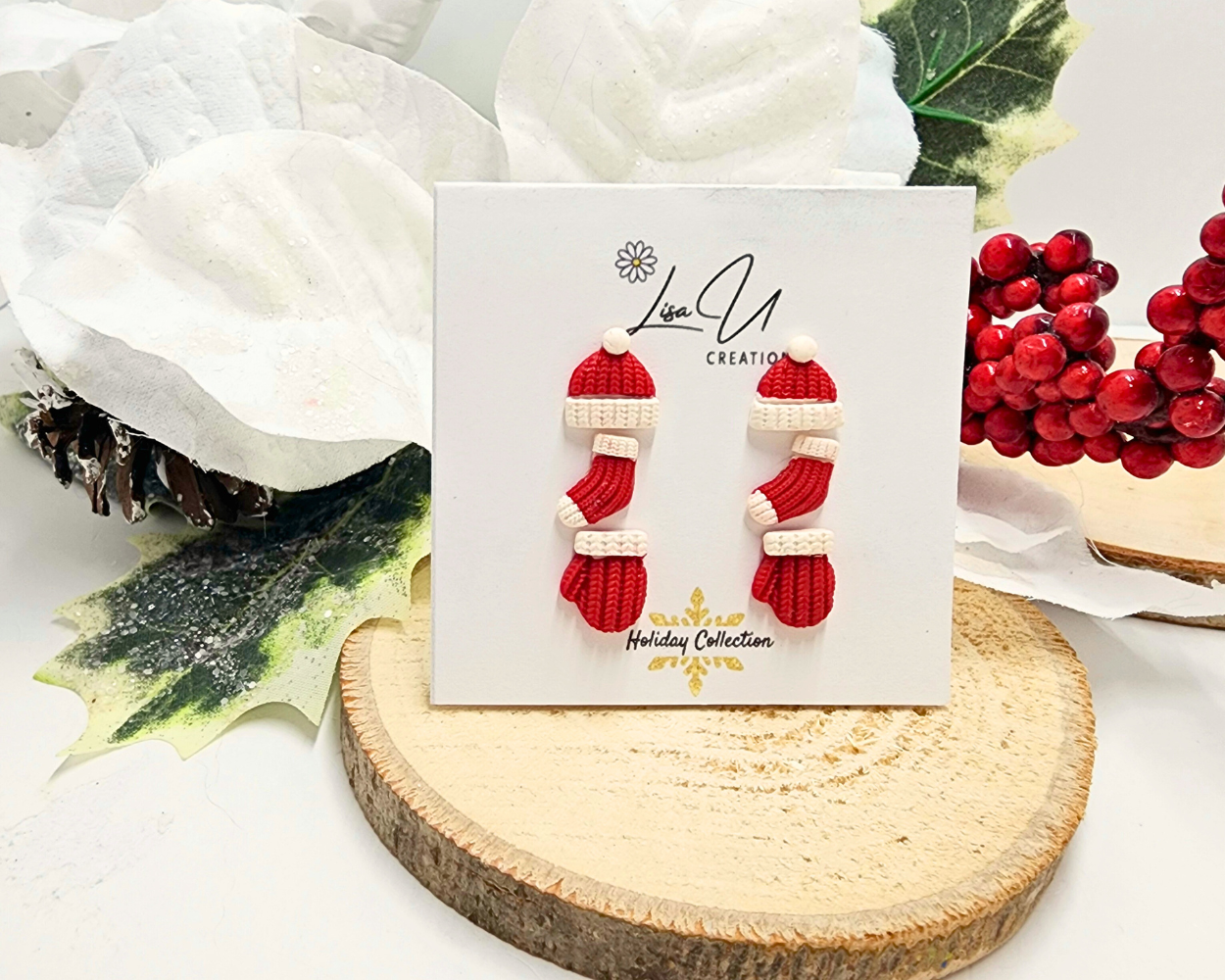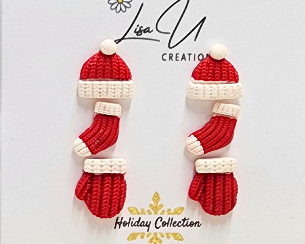 Celebrate the cozy spirit of the holidays with this charming set of three pairs of handcrafted stud earrings. Made from lightweight polymer clay, each piece is meticulously detailed to resemble tiny, knitted winter accessories in classic red and white.