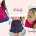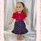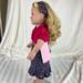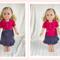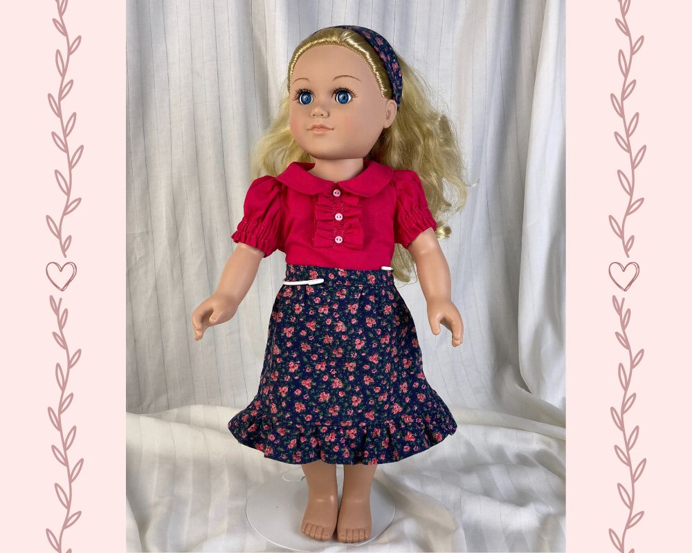 Get ready to giddy up! in this girlish spin on a beloved western staple! The top is made from a brilliant fuchsia cotton fabric and has short puffed sleeves, a peter pan collar, and a ruffle placket detail with three small pink buttons down the front. The top is lined and has a back hook and loop closure. You can never have enough denim, especially in the West, and this skirt brings a fresh and feminine approach. Made from a light weight deep blue denim with a pink and fuchsia floral print, this skirt has a waistband and features tiny bits of gathering that almost appear as tiny pin tucks. The skirt hits mid-calf and ends in a ruffle. Skirt has a hook and loop closure in the back. The headband matches the skirt.