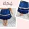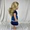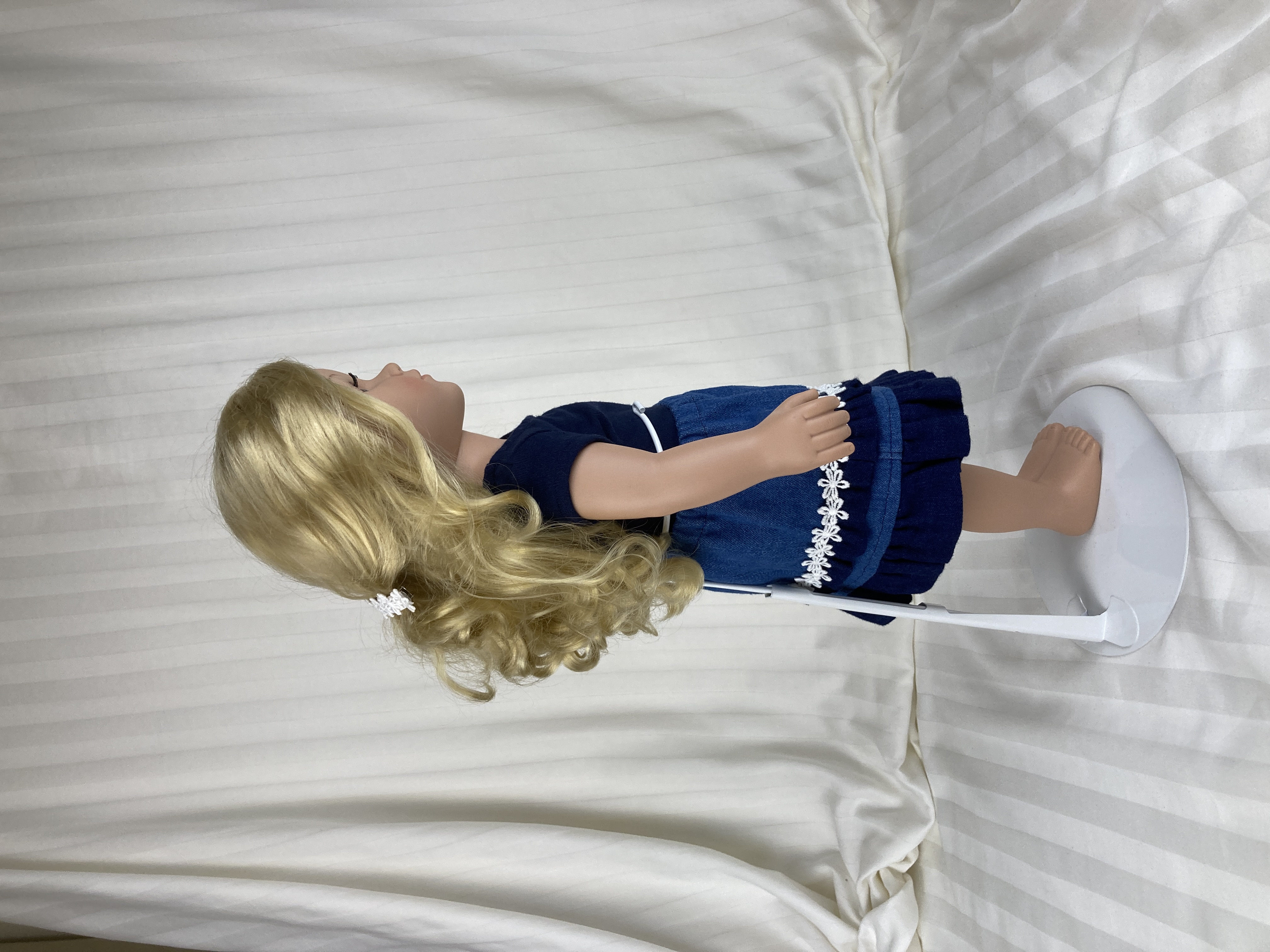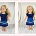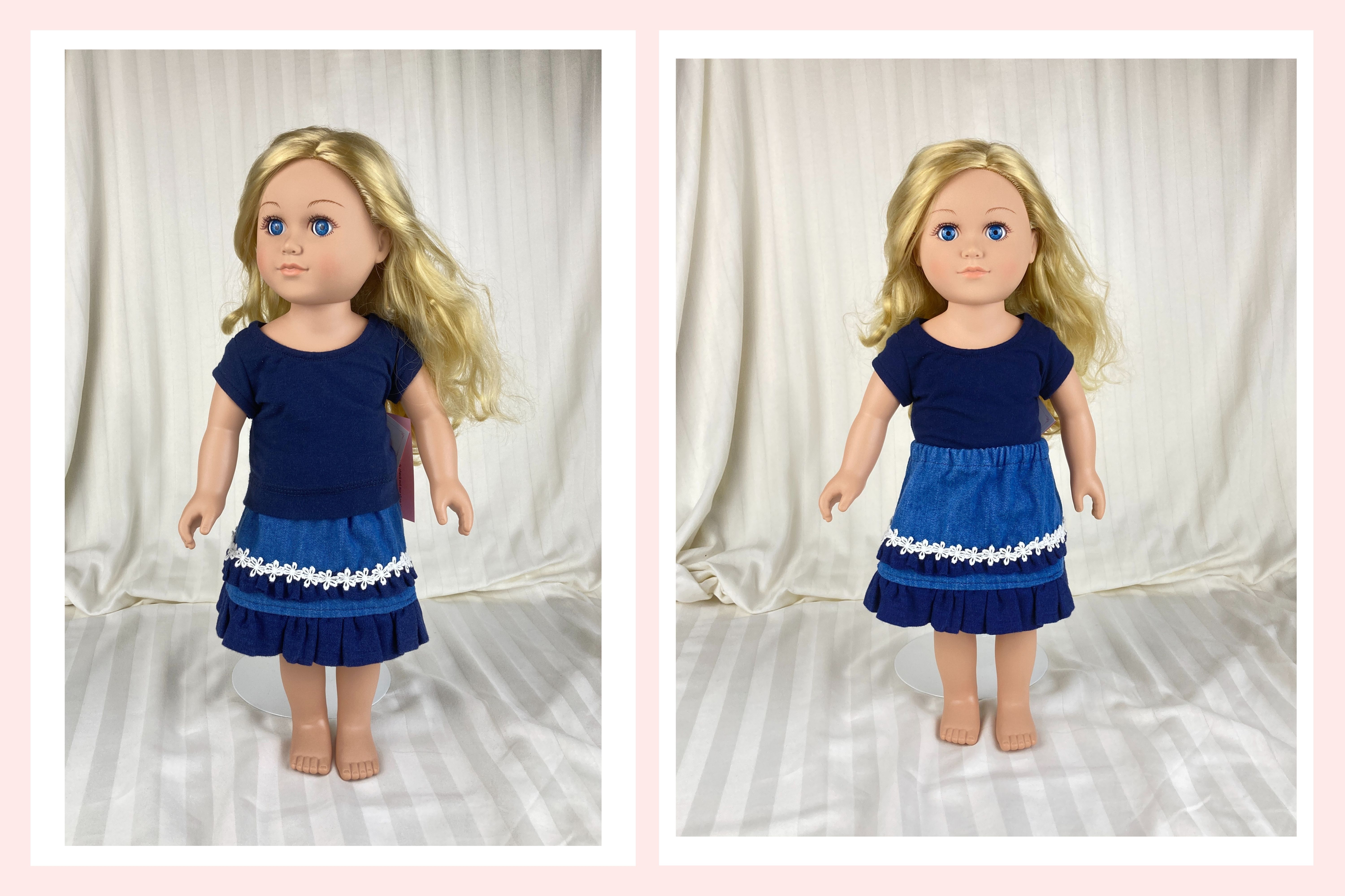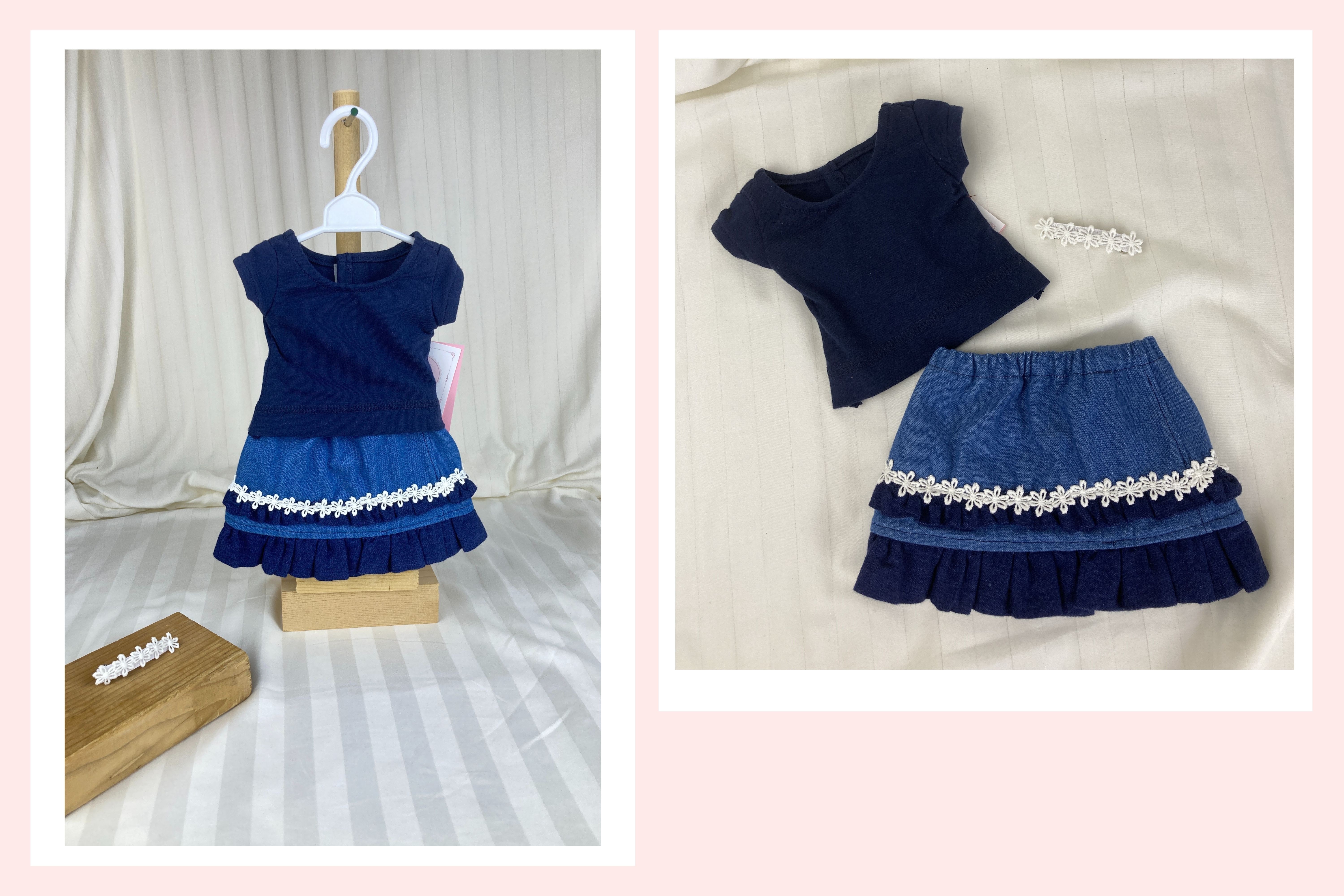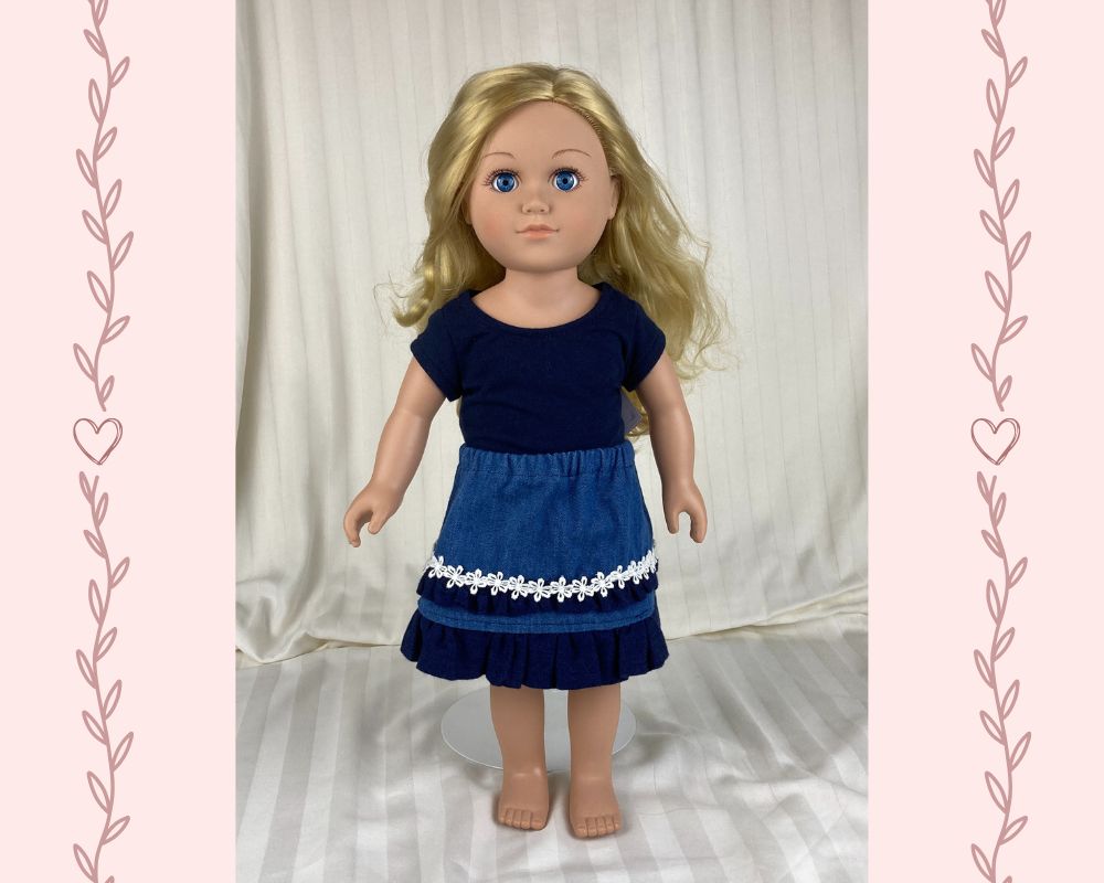 Upgrade your doll's casual blue jeans to casual cute with this t-shirt and denim skirt combo! The t-shirt is made from navy knit and is made in the fitted modern style with a scoop neckline and cap sleeves. The shirt has a hook and loop back closure. The skirt body is made from a medium wash denim and ends in a dark blue lightweight denim ruffle. A tiny ruffle, matching the hem ruffle, topped by a white daisy flower trim embellishes an otherwise simple skirt. The skirt has an elastic waist and falls below the knee. A barrette, embellished by more white daisy flower trim, completes this essential summer wardrobe basic.