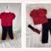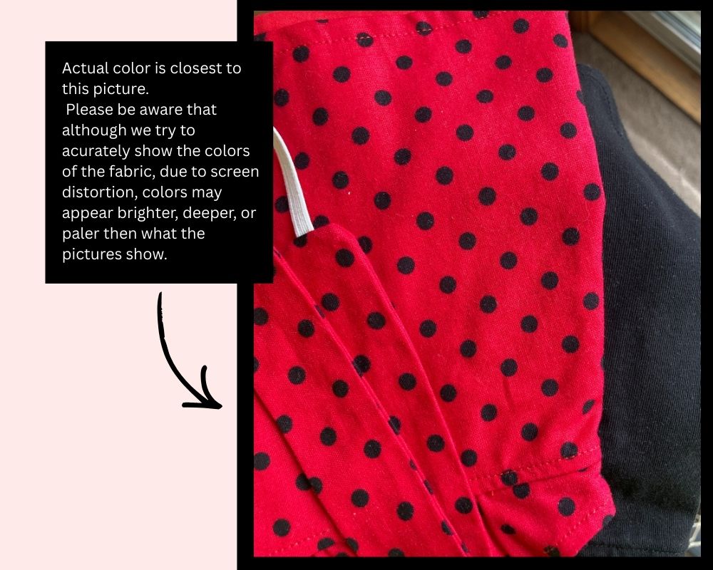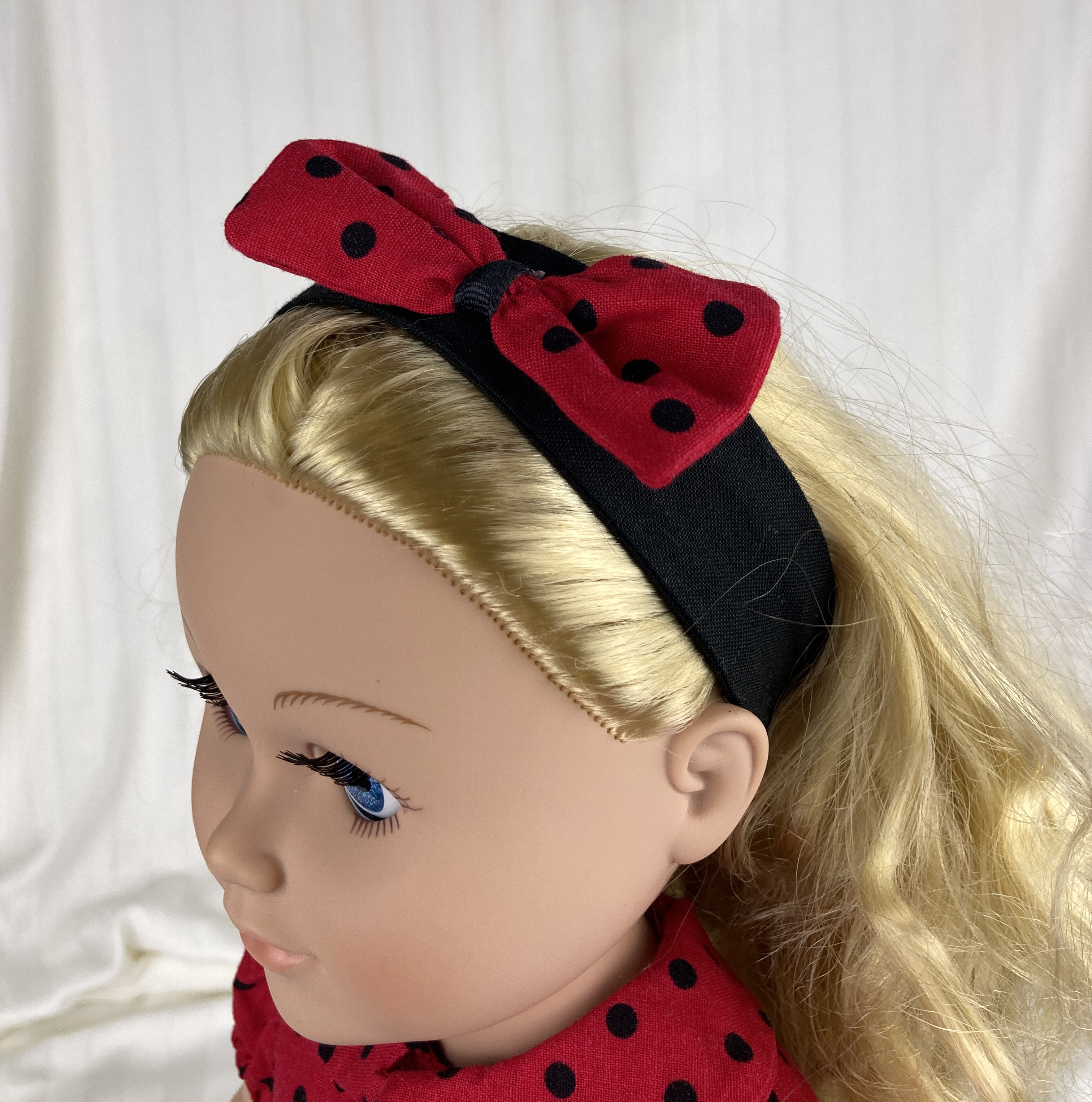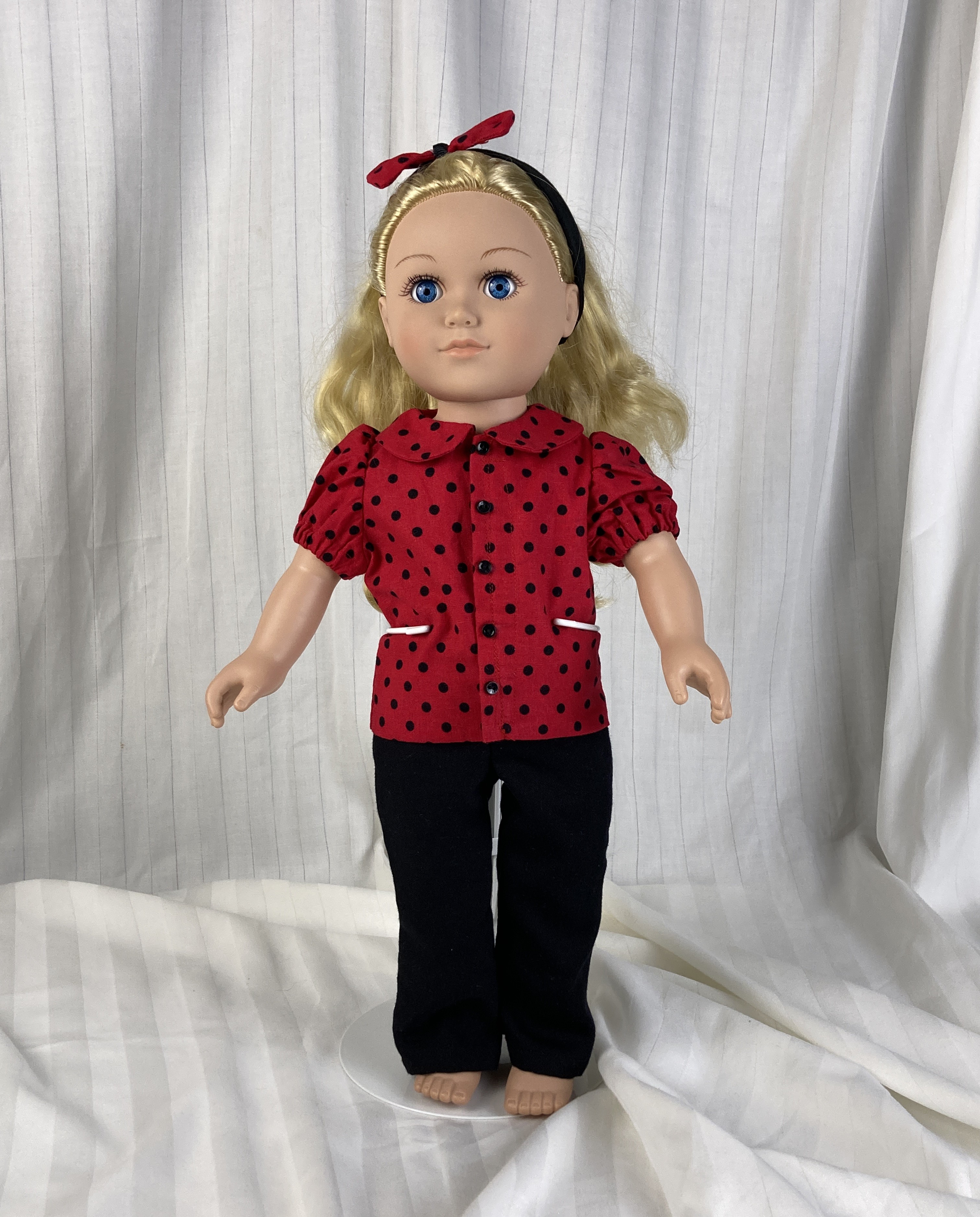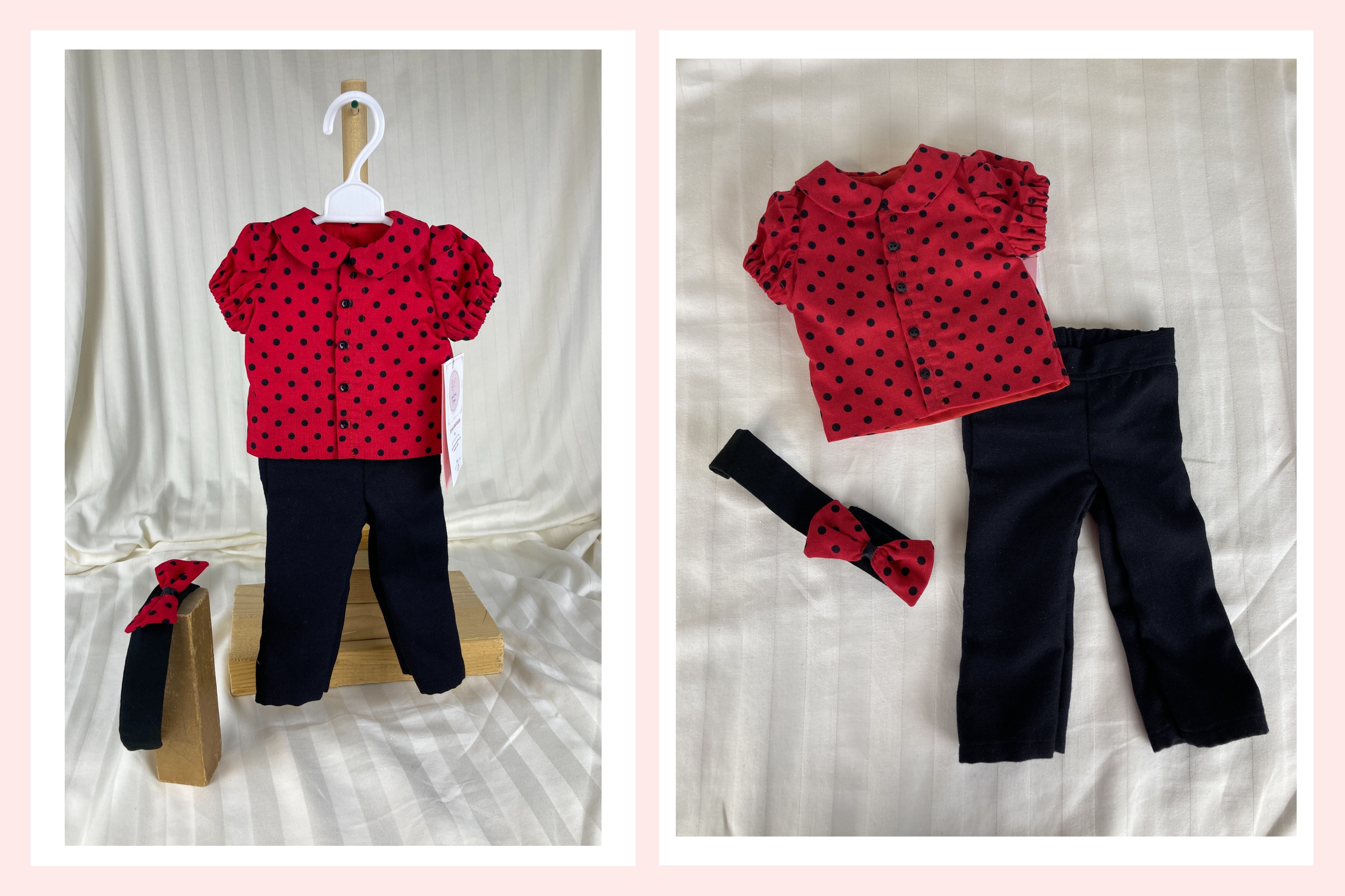 This adorable outfit was inspired by ladybugs! The blouse is made from a red and black polka dot cotton fabric. It has a peter pan collar, short puffed sleeves, and five small black buttons marching down the front. The blouse is lined and has a front hook and loop closure. The pants are made from a soft black pants weight fabric and have a smooth front waistband and elastic in the back. Pants are not lined. The headband is made from black cotton fabric and has an off kilter medium red and black polka dot bow for decoration.