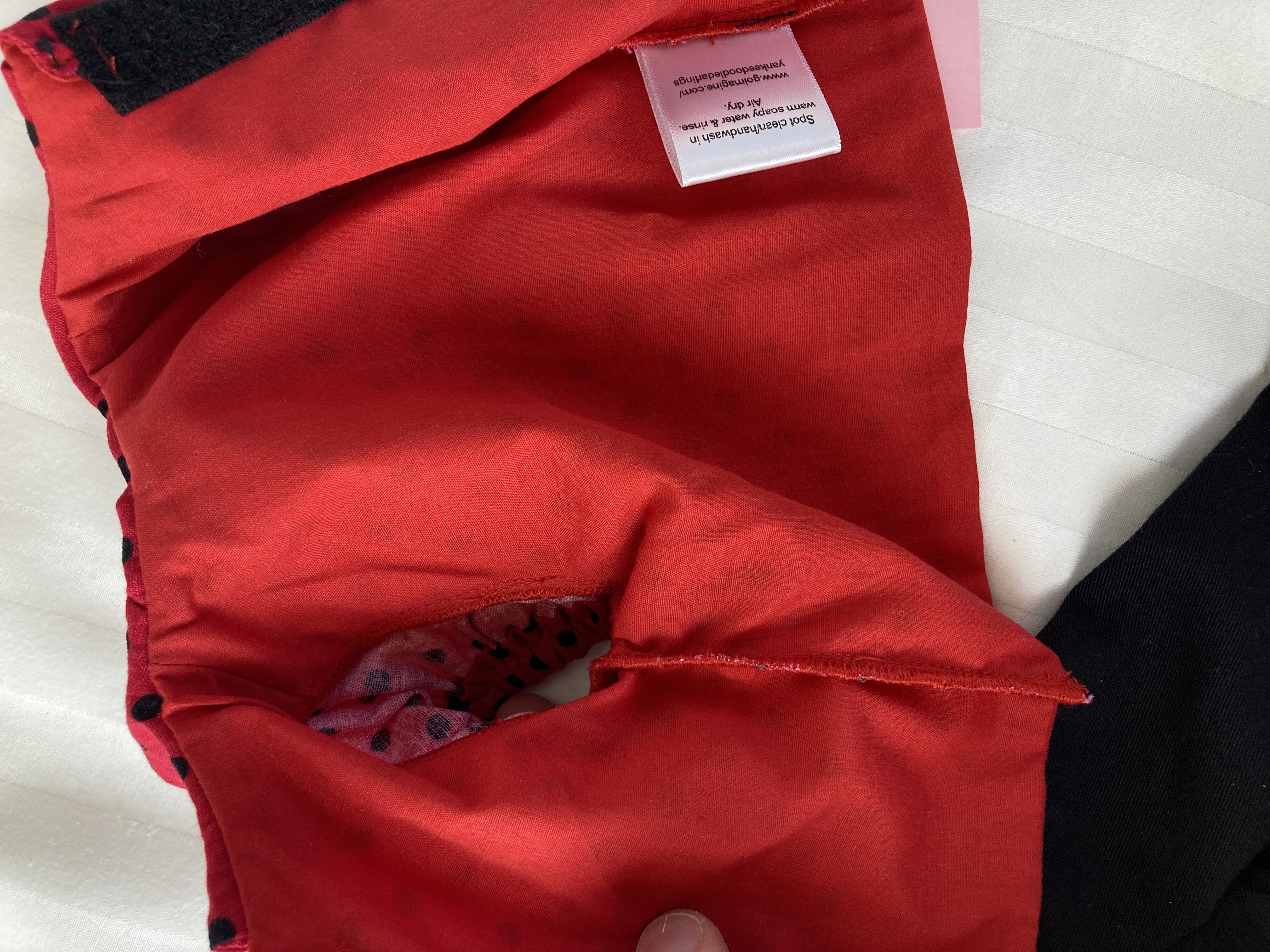 Care Instructions: For small dirt spots use a clean wash cloth or rag and rub the spot out with lukewarm soapy water. For heavy duty cleaning, gently swish/lightly scrub dress together in warm soapy water. Empty water and rinse in a tub of clean water. Pat dry with a towel and let air dry. Iron on low setting if desired, watching out for lace and trims that might melt. If dress has red fabric or super pigmented fuchsia or coral fabric, DO NOT do heavy duty cleaning. Spot clean dirty area with a lukewarm soapy wash cloth or rag. Otherwise fabric may bleed onto other fabric colors.