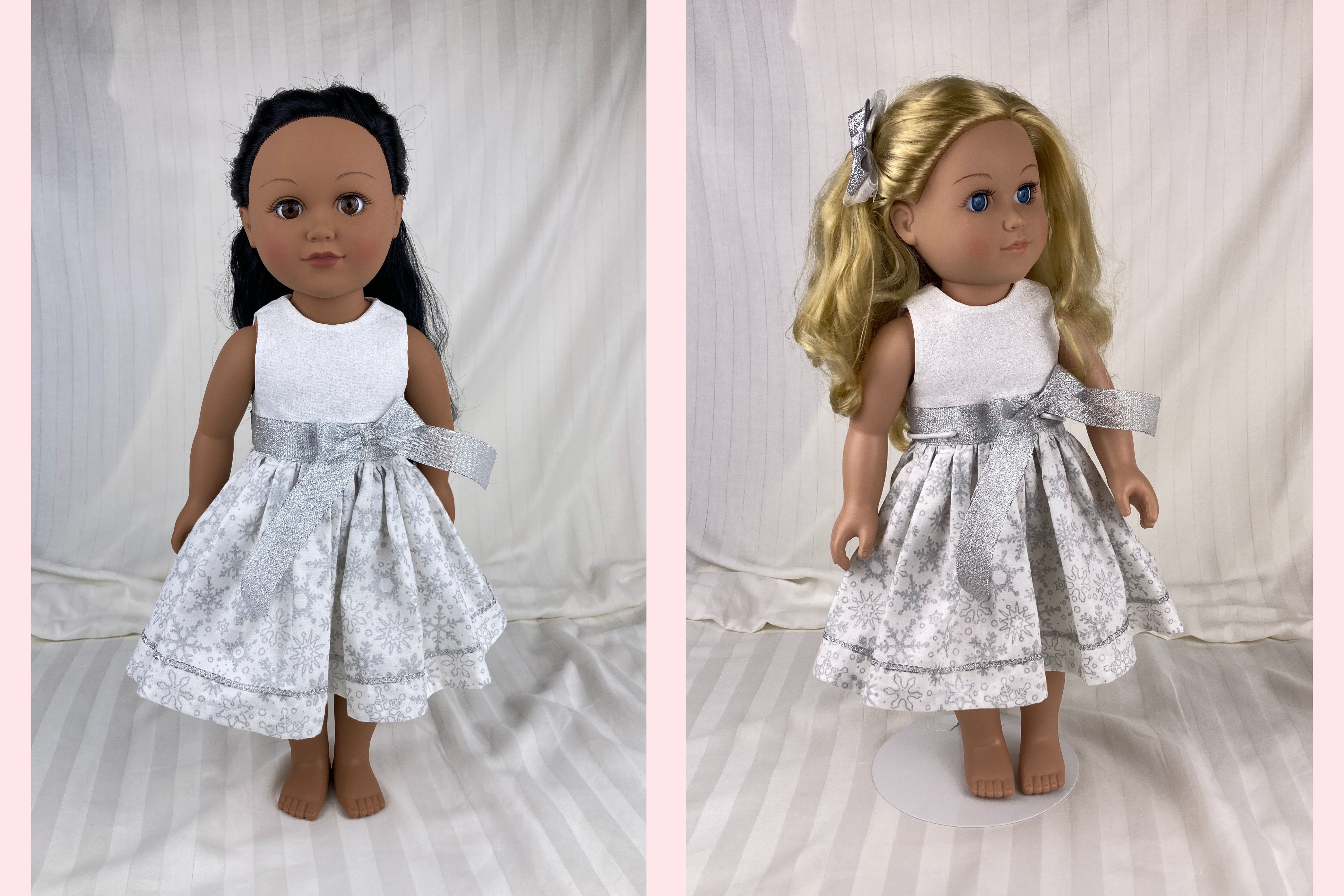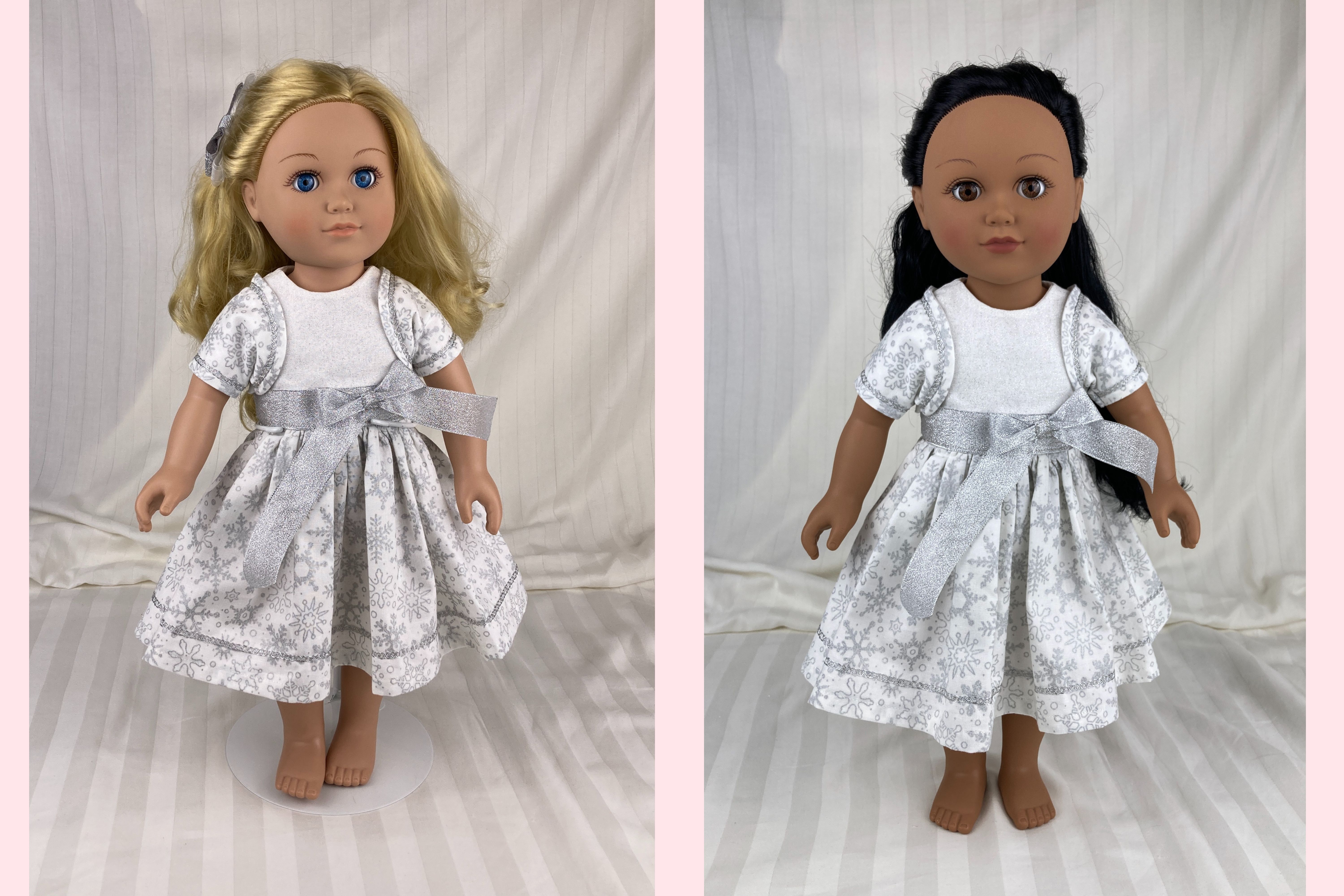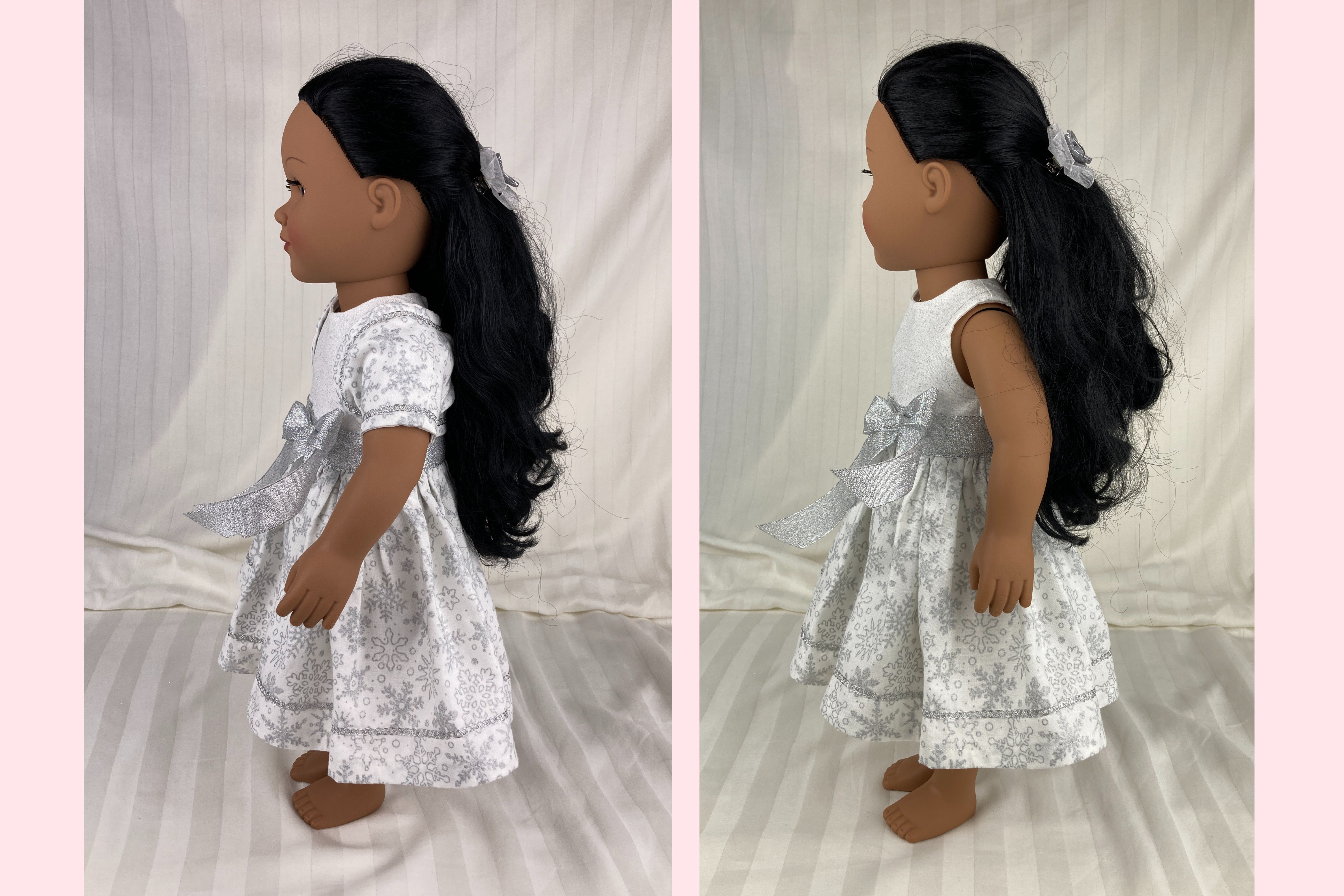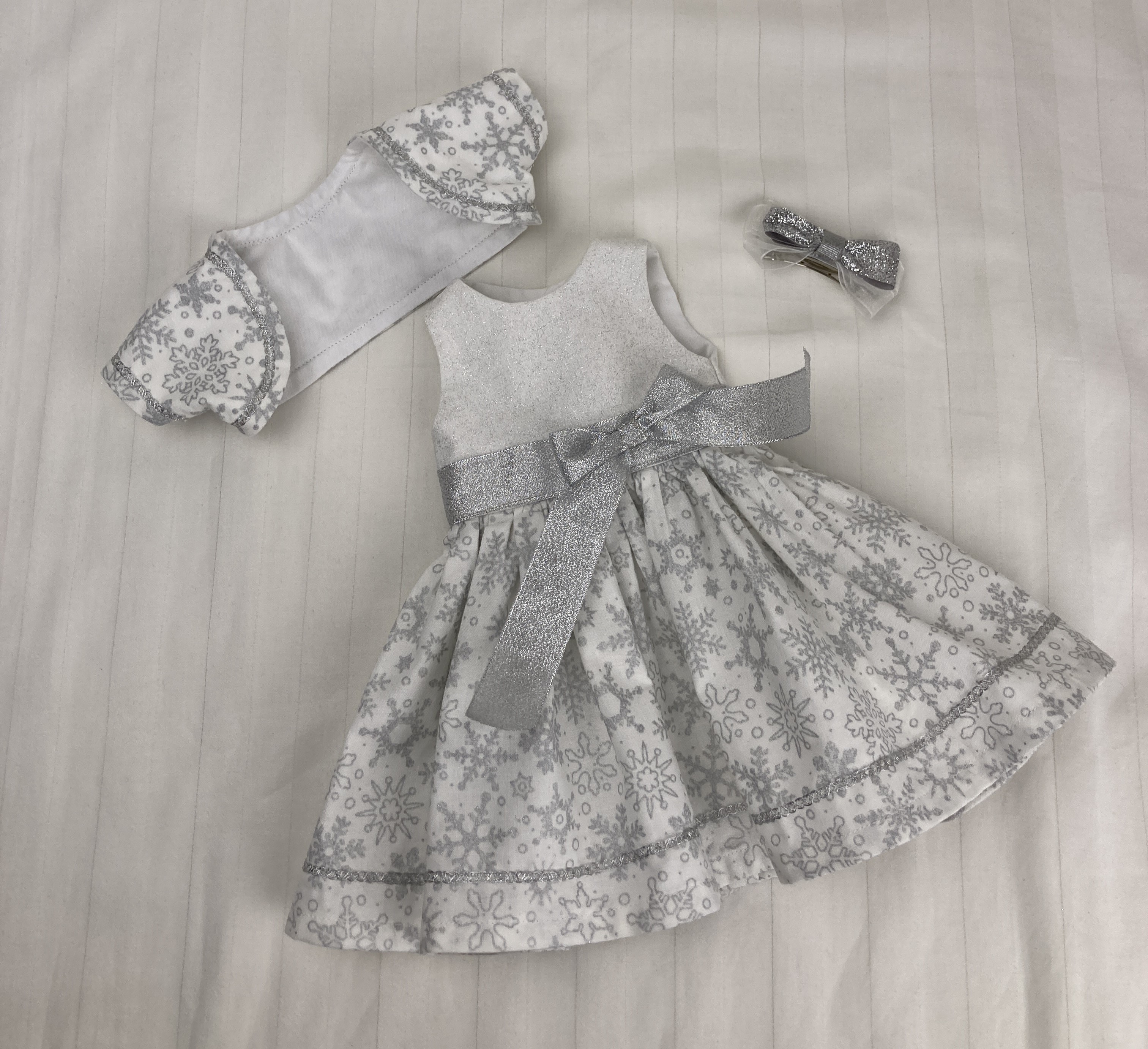 Looking for the perfect winter party outfit for your 18 inch dolls? This beautiful snowflake ensemble features three pieces: a dress, a bolero jacket, and a hairbow.