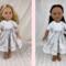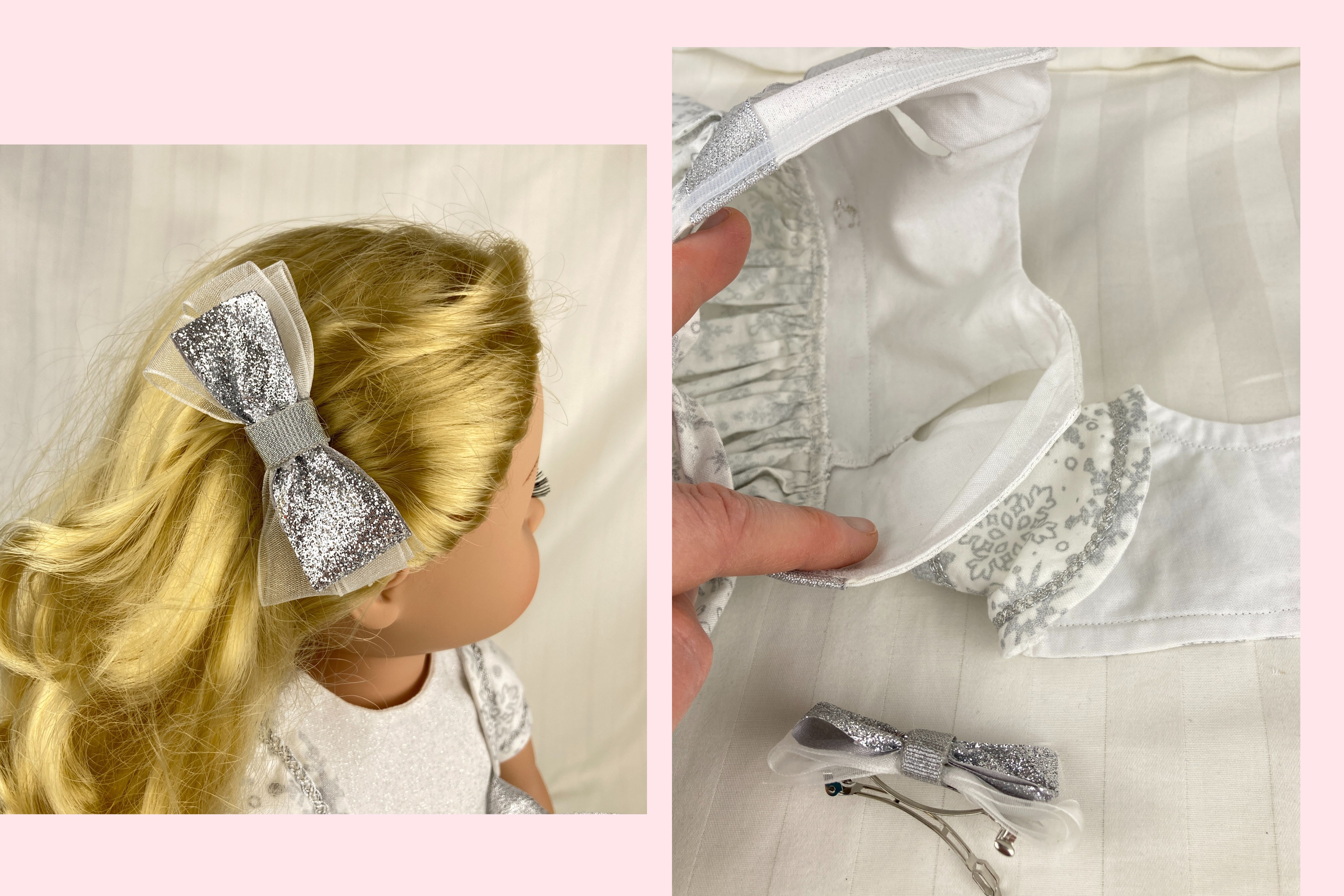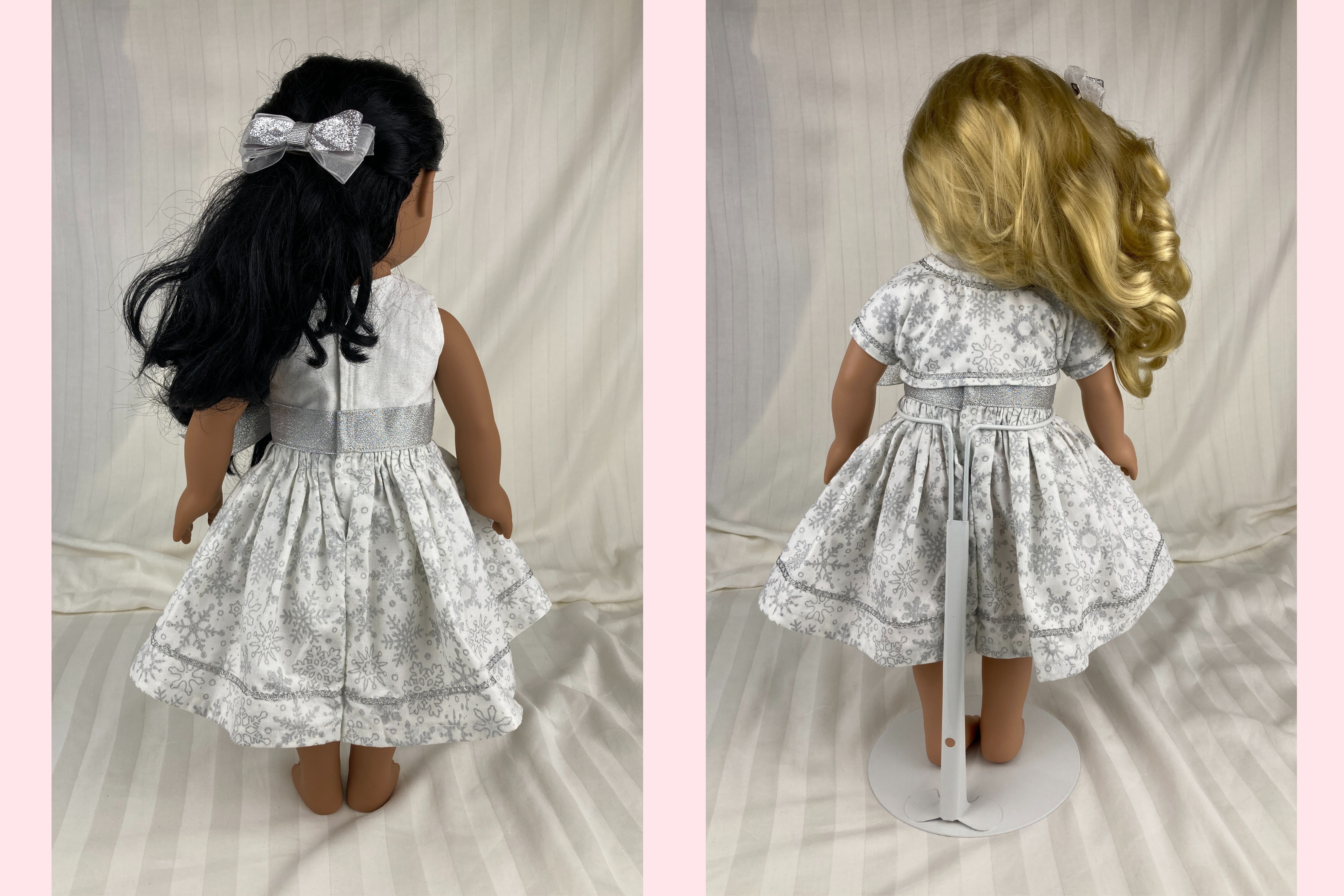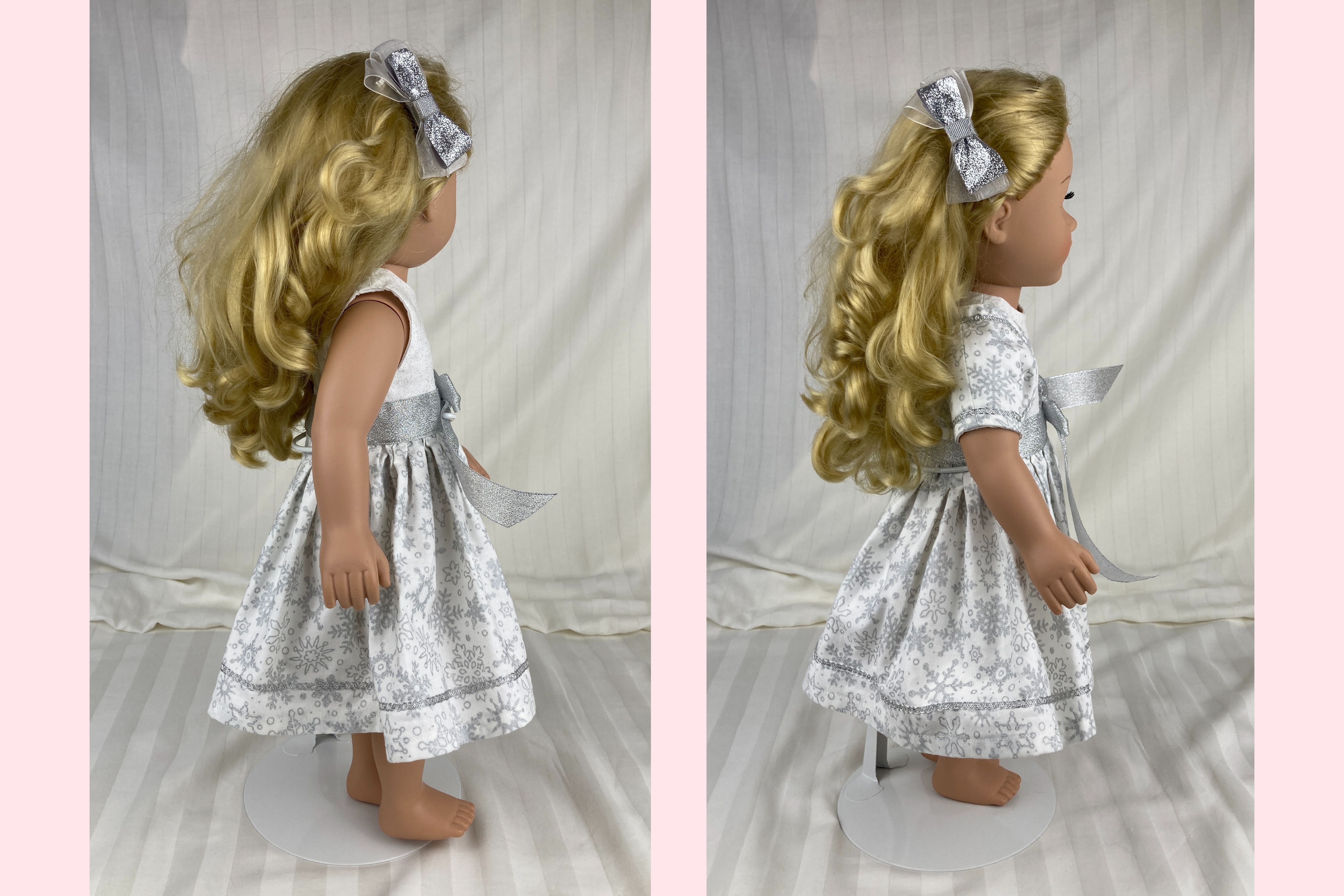 Looking for the perfect winter party outfit for your 18 inch dolls? This beautiful snowflake ensemble features three pieces: a dress, a bolero jacket, and a hairbow.