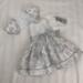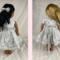 The dress is made from cotton and has a full gathered skirt made from a gray and silver sparkle snowflake print upon a snowy white background. The lined, sleeveless bodice is made out of a lovely white sparkly fabric that gives the look of new fallen snow under the morning sun. An attached silver sash and bow sits playfully at the left side of the waist. Silver trim provides the perfect amount of interest along the hem of the skirt. The dress features a hook and loop back closure.