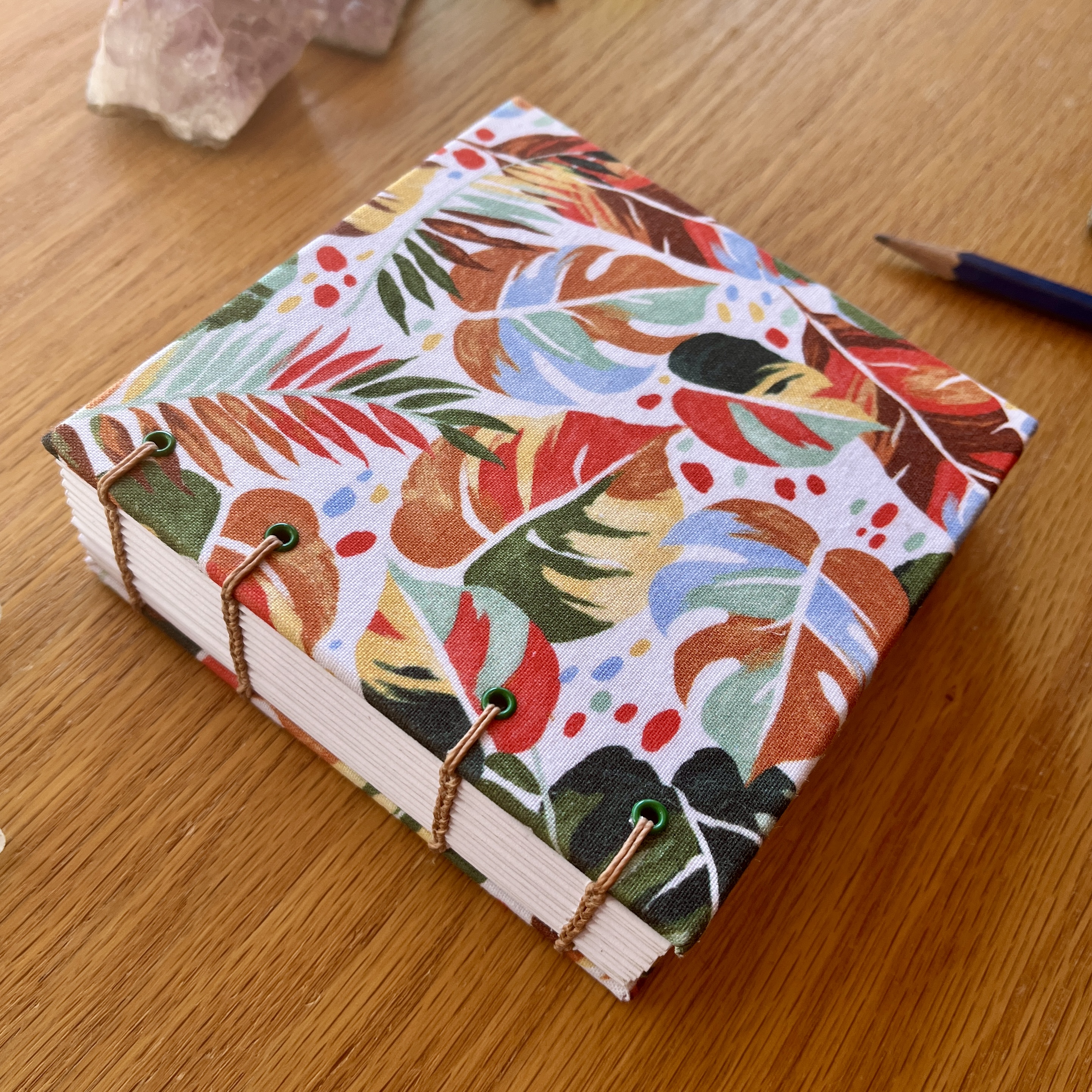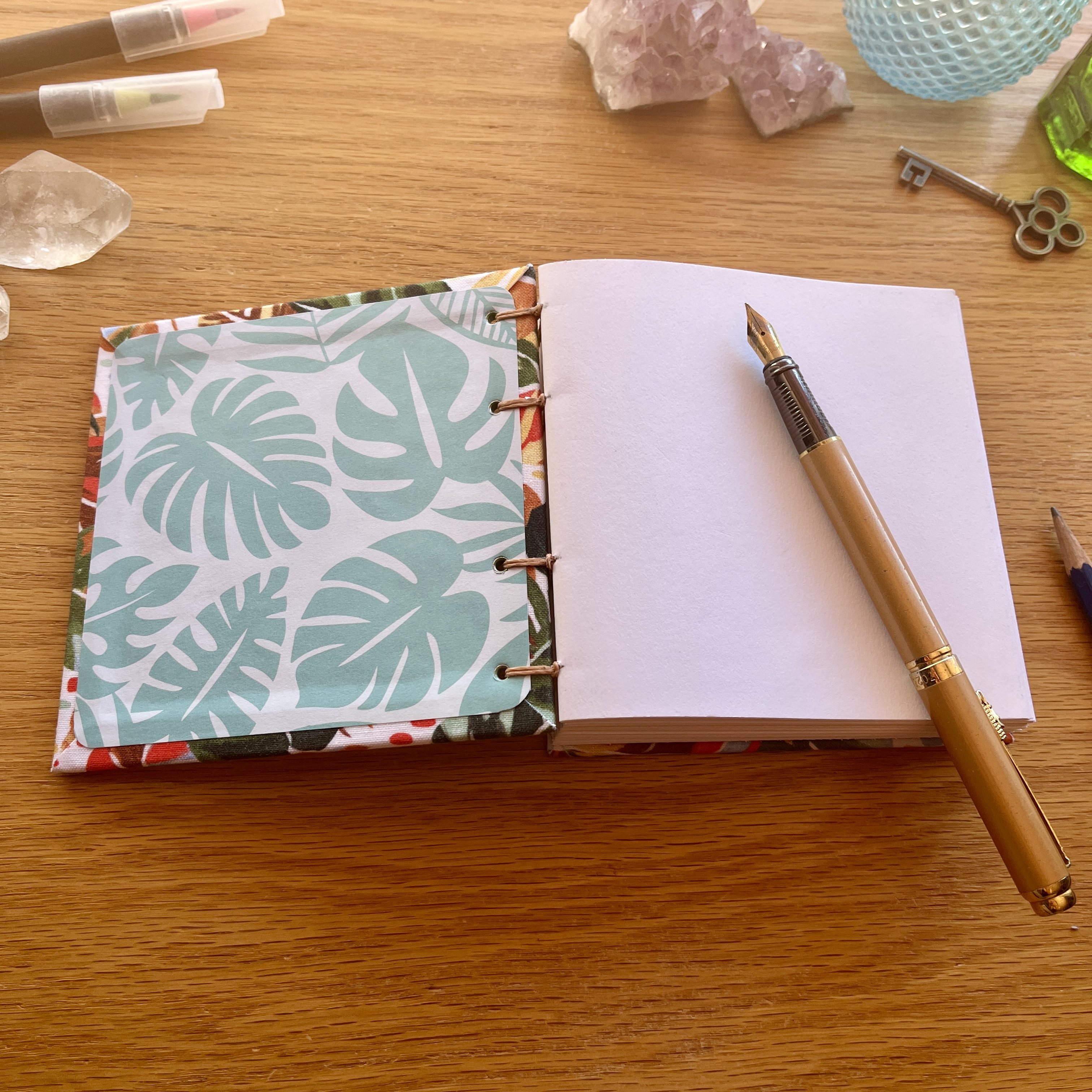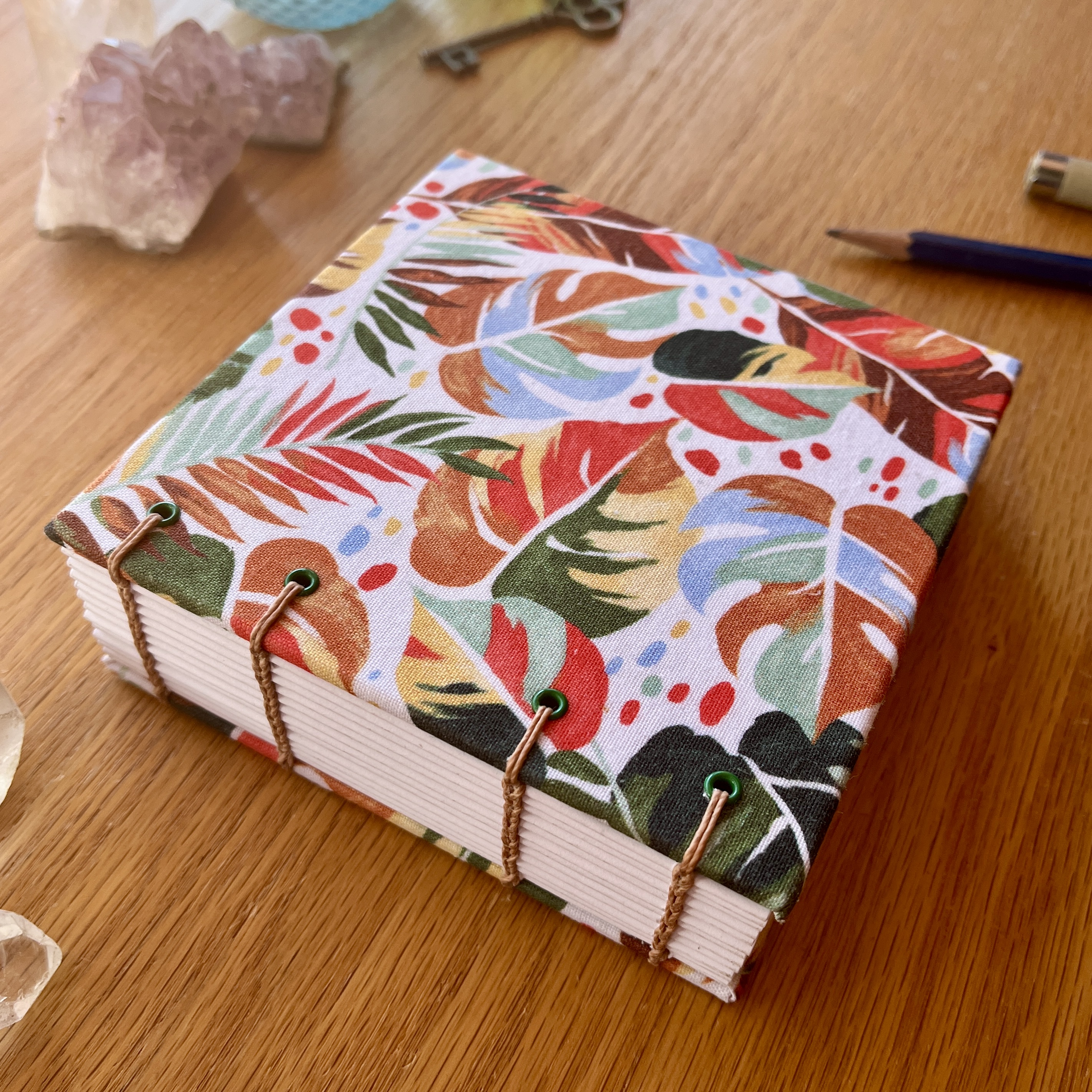 I've created the hardcovers in a colorful monstera leaves pattern book cloth, and meticulously handbound using the coptic binding technique which allows the book to lay perfectly flat when open for ease of use.