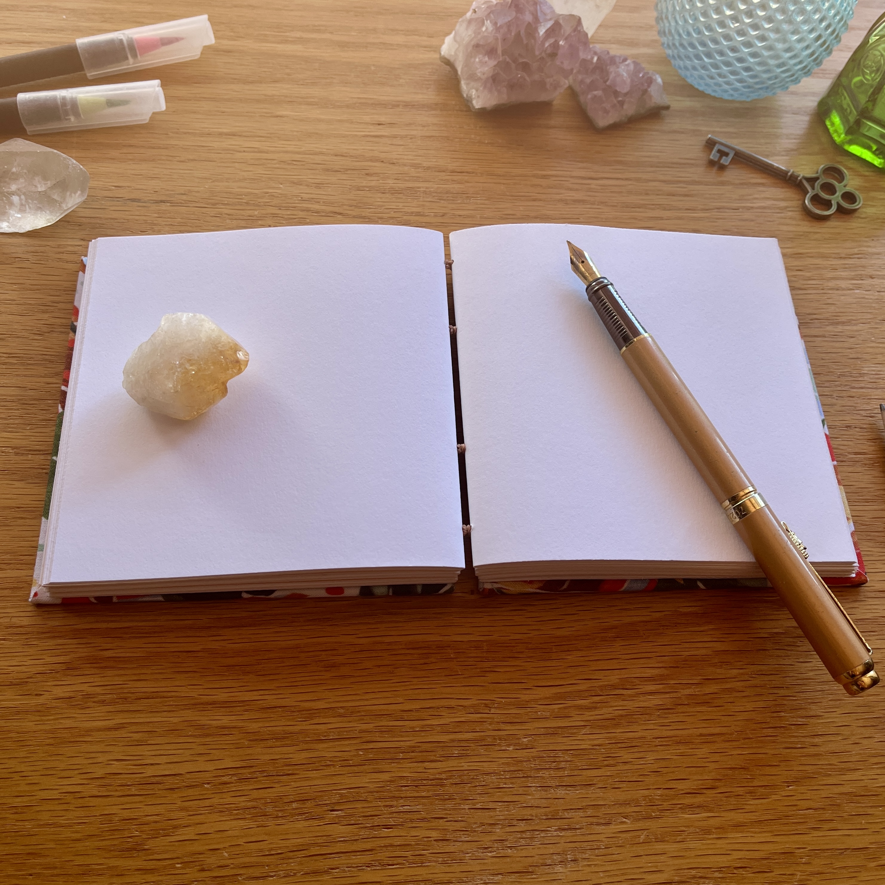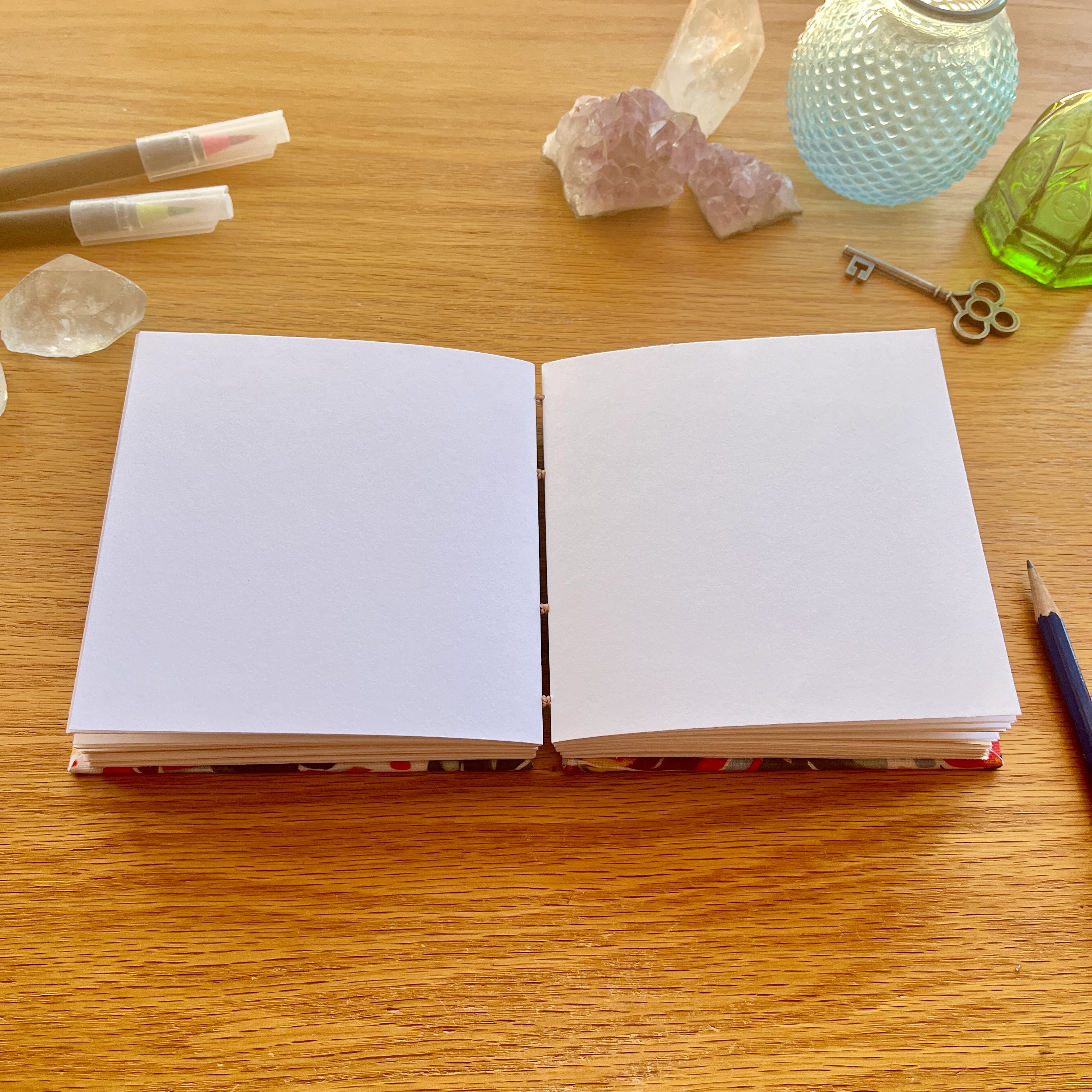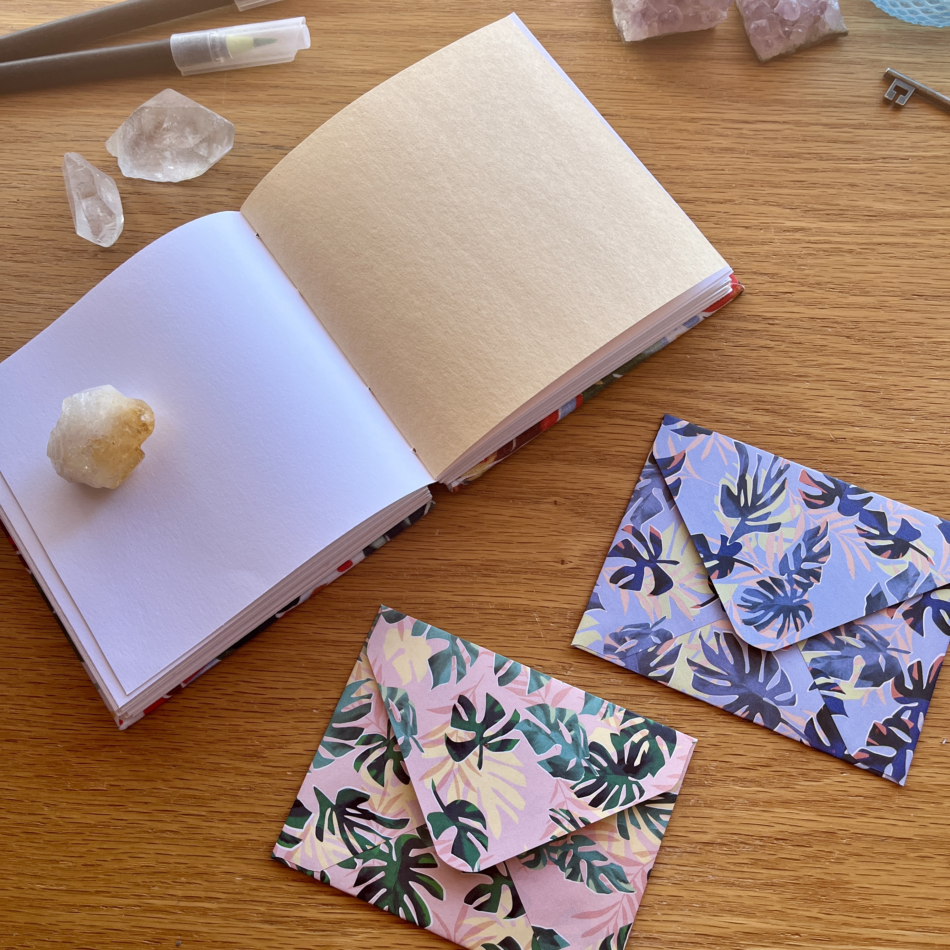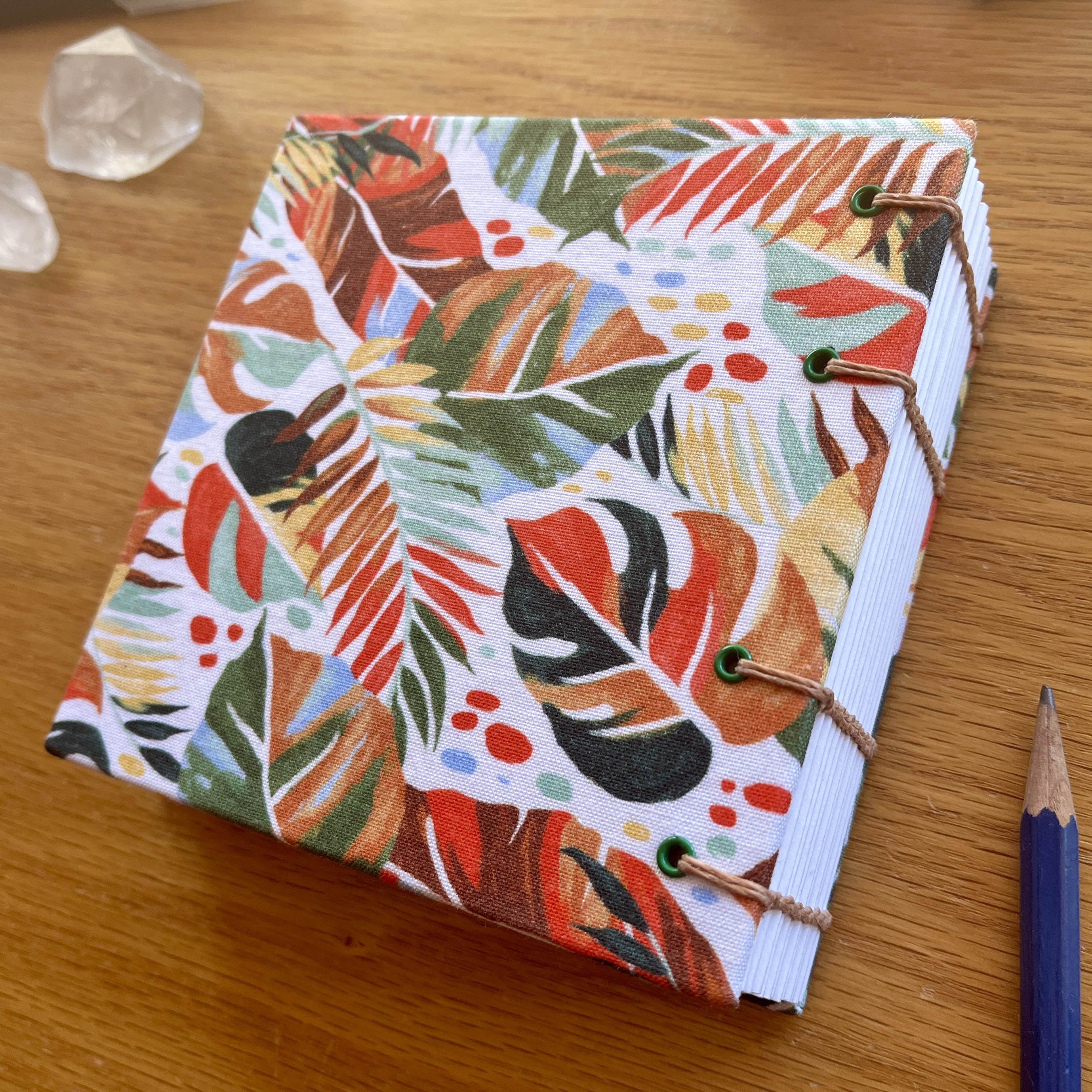 I've created the hardcovers in a colorful monstera leaves pattern book cloth, and meticulously handbound using the coptic binding technique which allows the book to lay perfectly flat when open for ease of use.