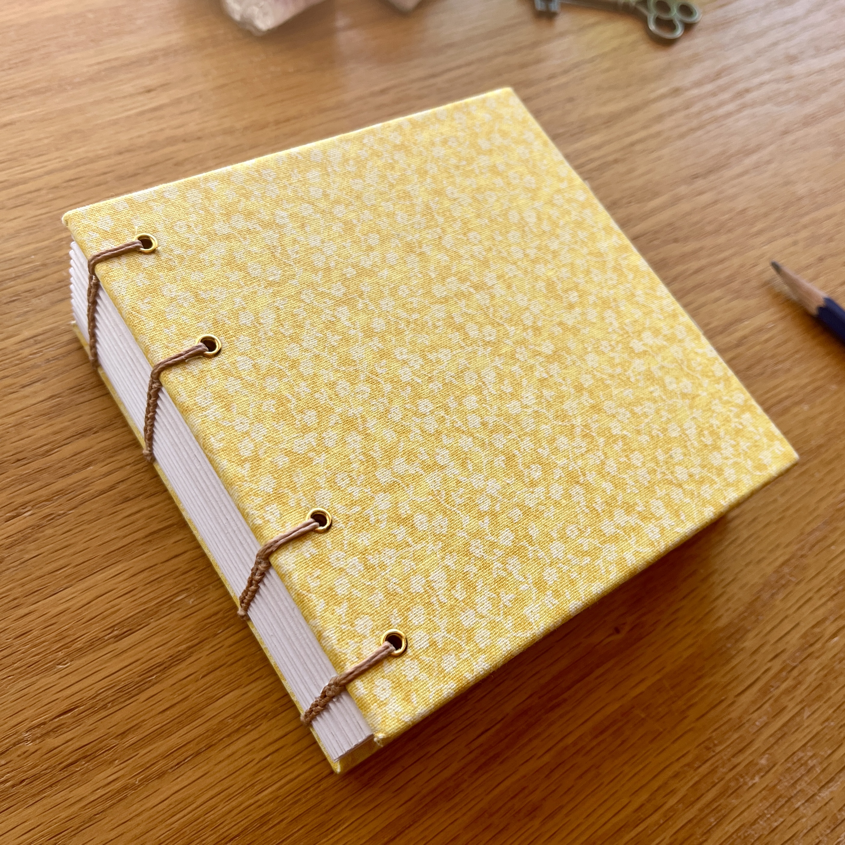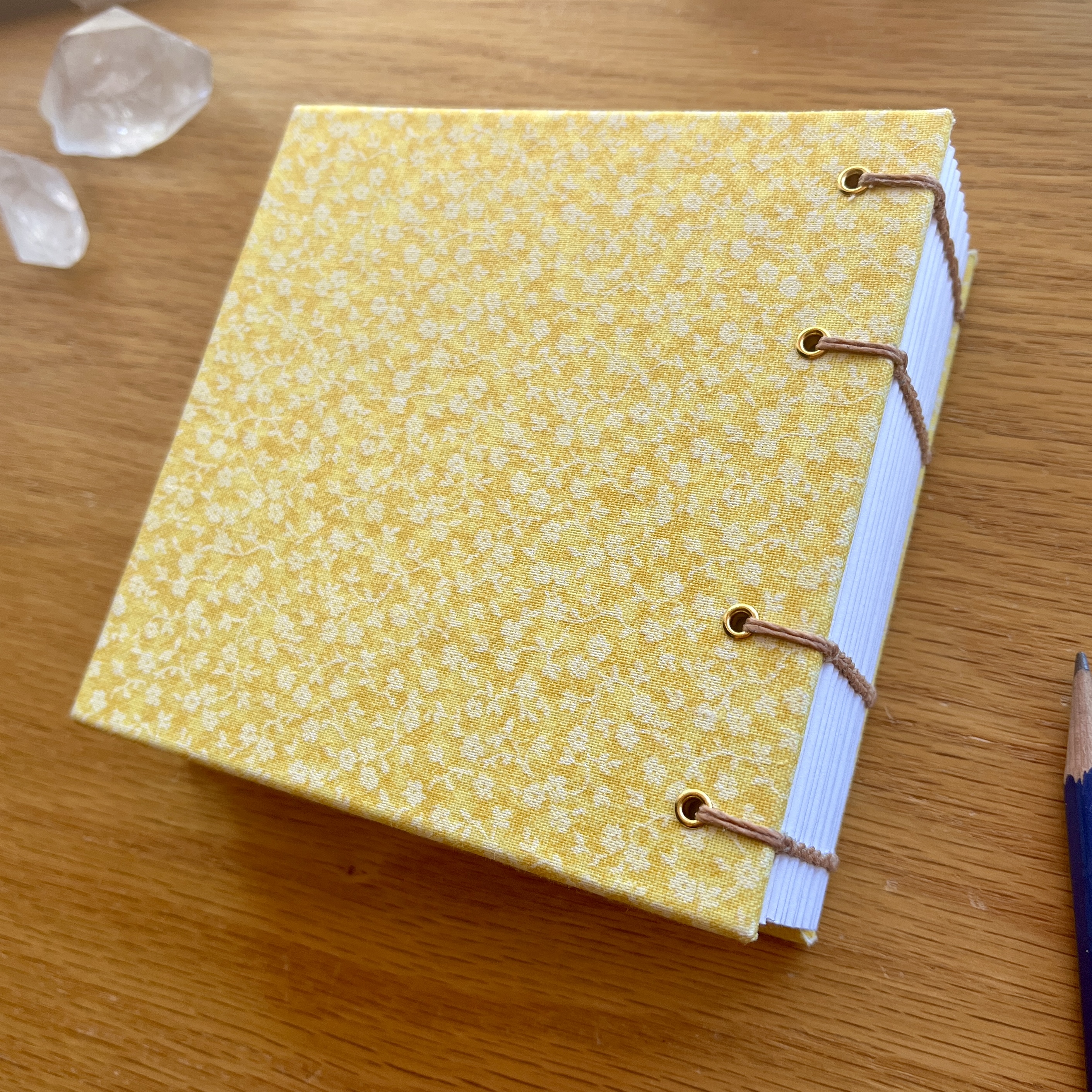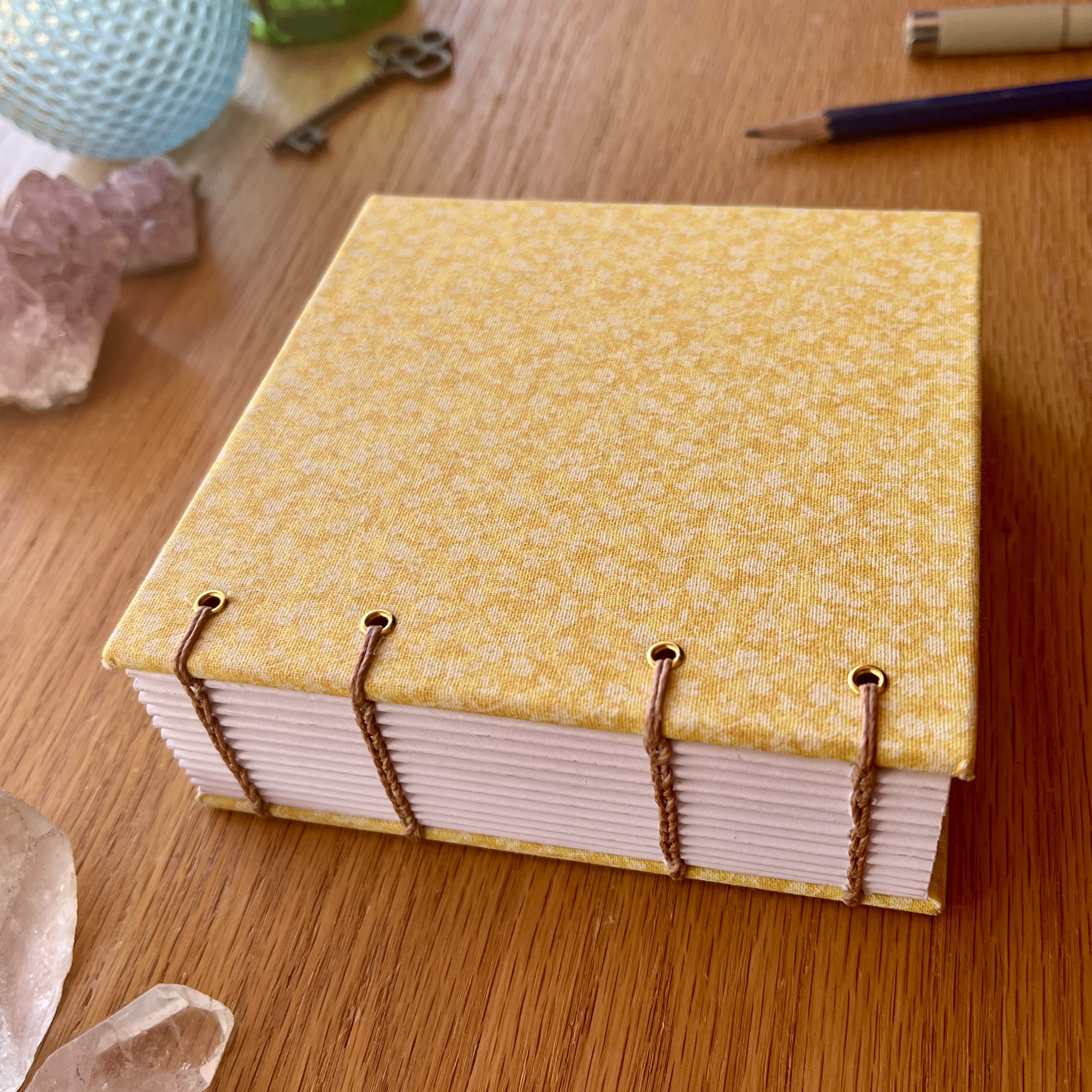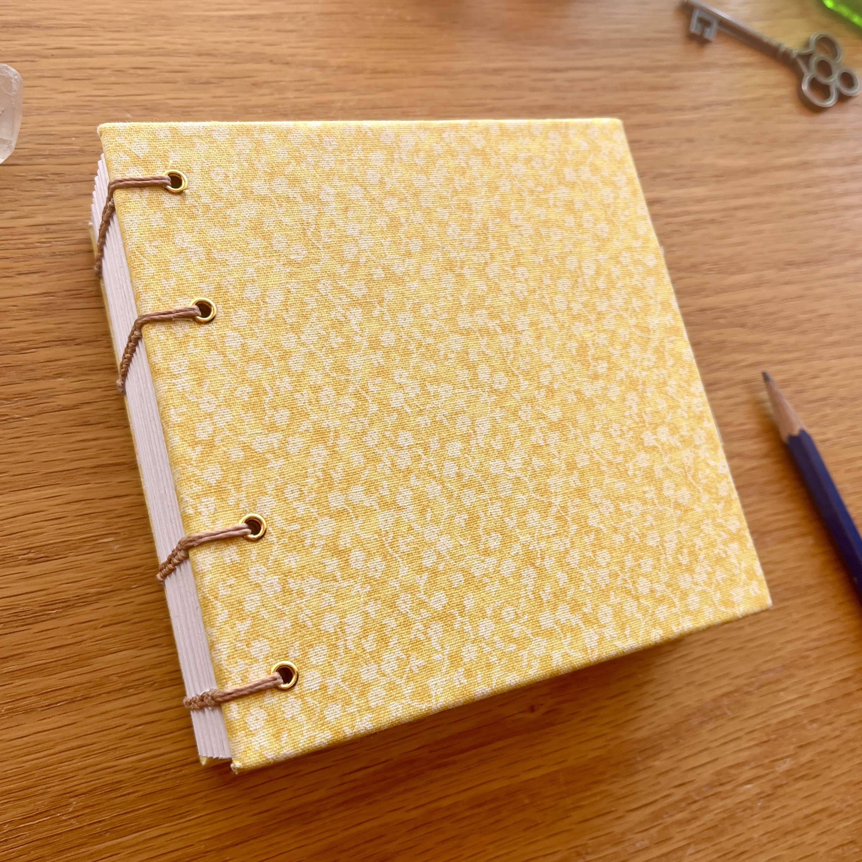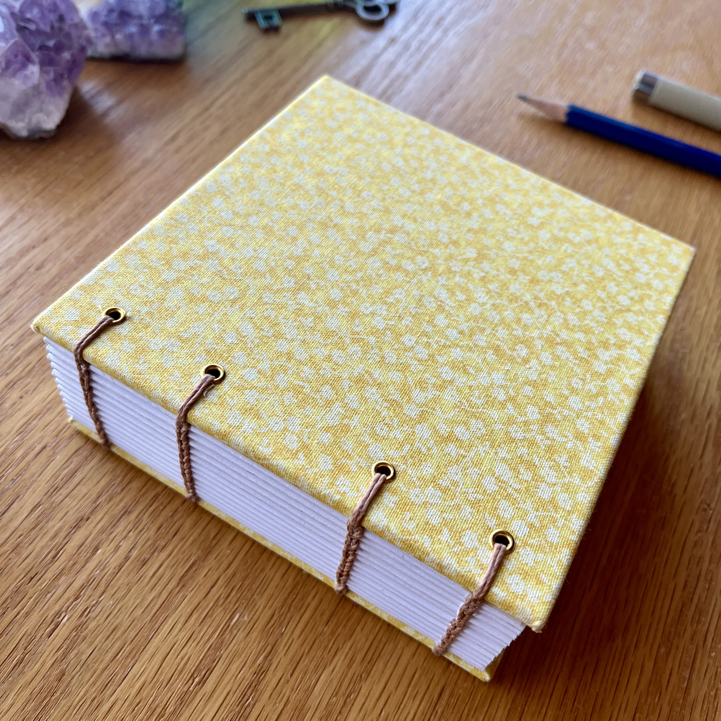I've created the hardcovers in a vintage style yellow floral chintz book cloth, and meticulously handbound using the coptic binding technique which allows the book to lay perfectly flat when open for ease of use.
