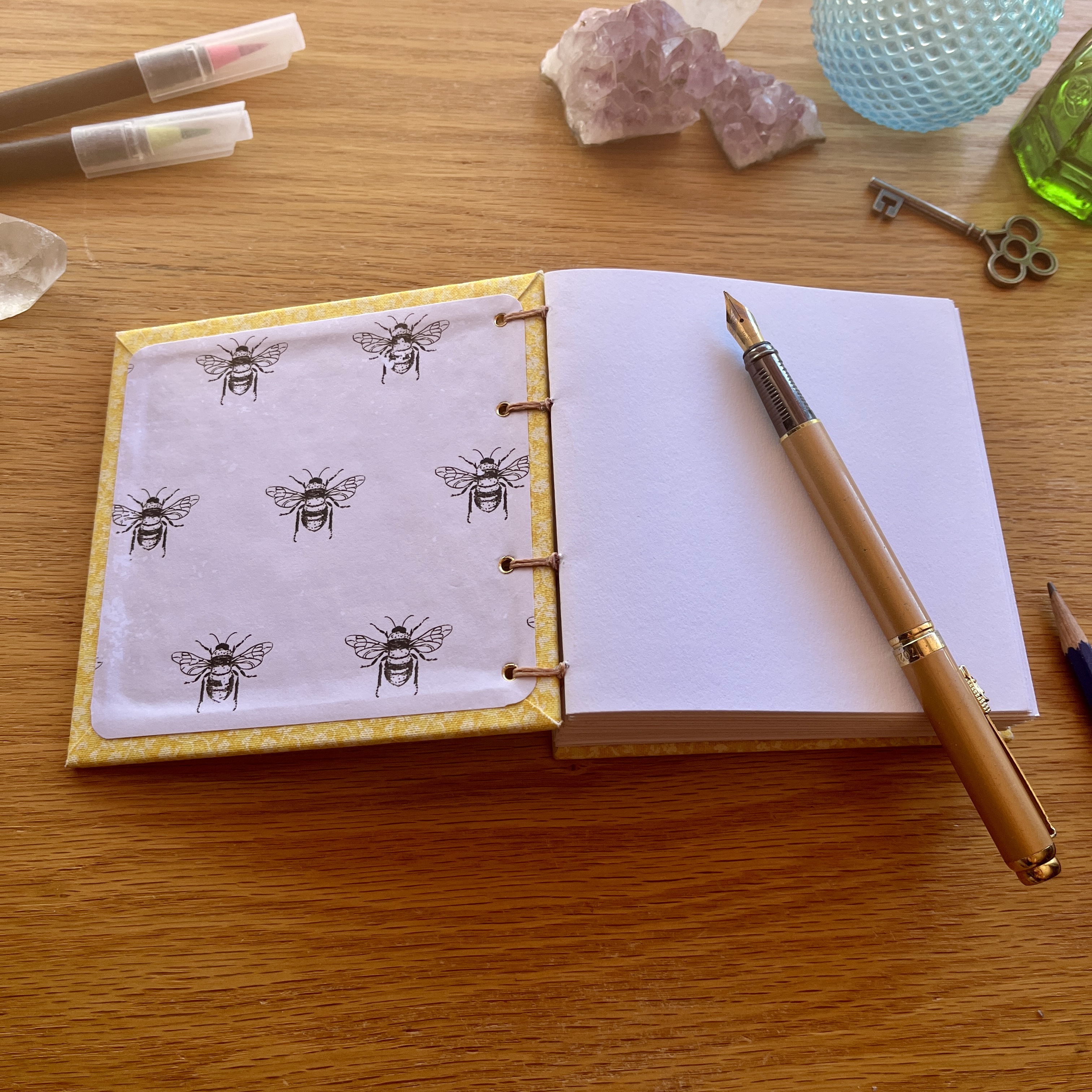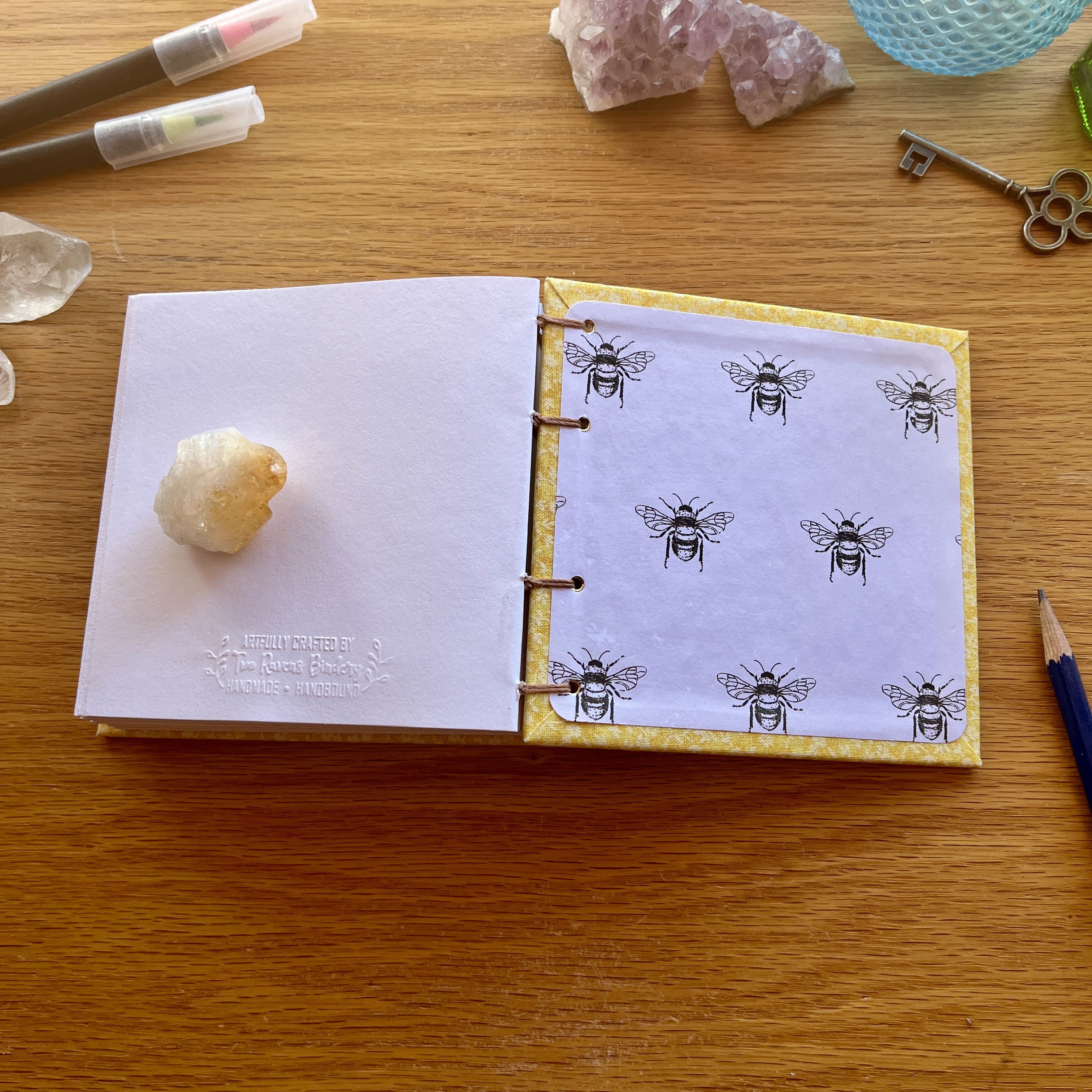 - finished with coordinating bee print endpapers and gold metal eyelets