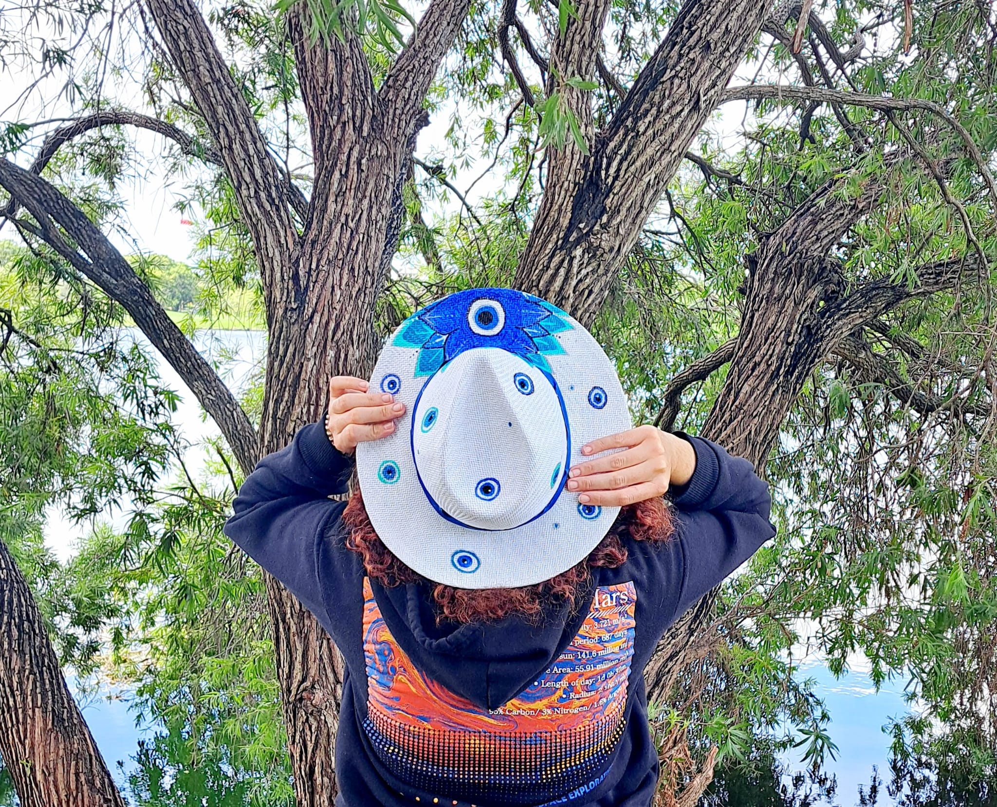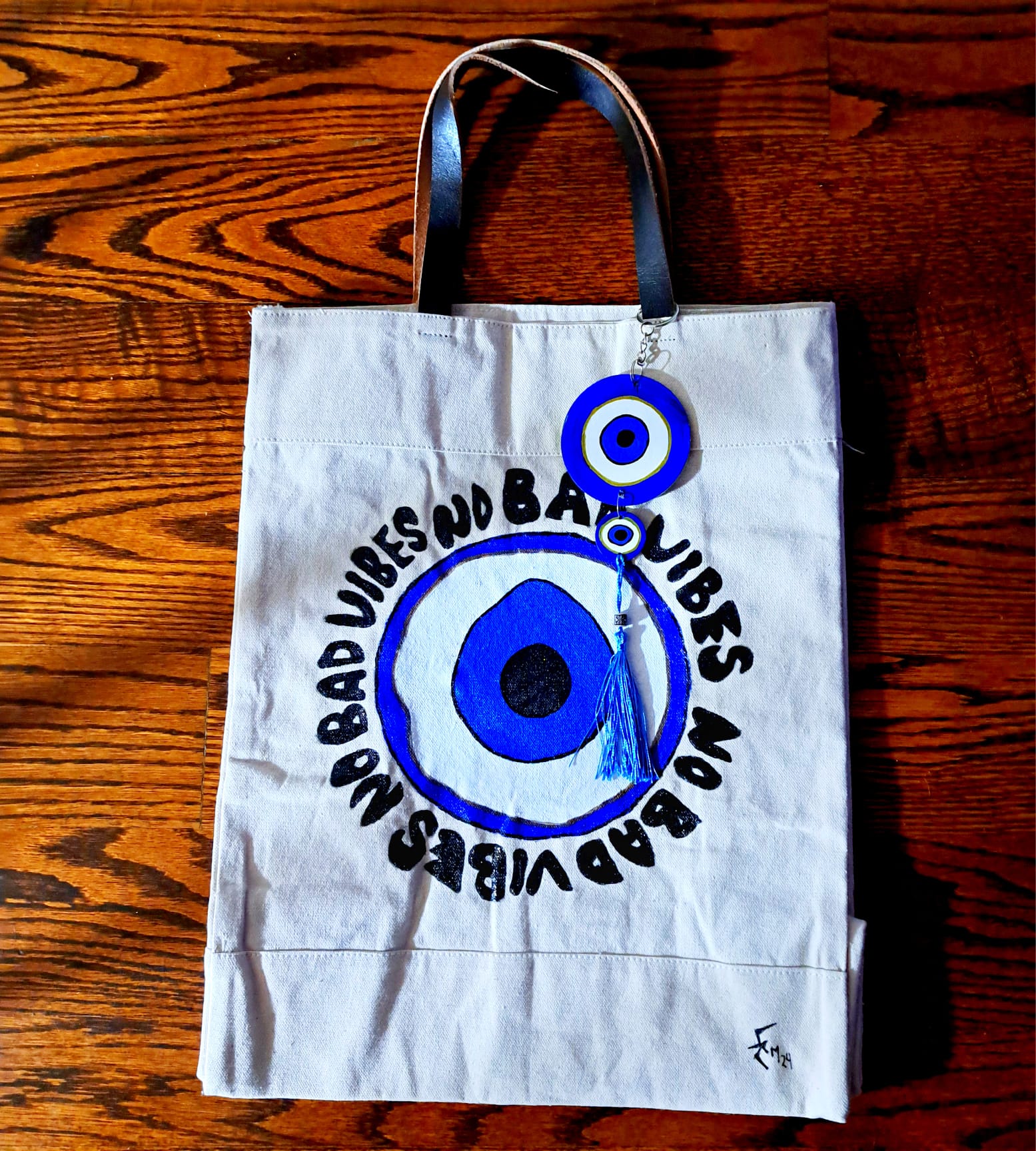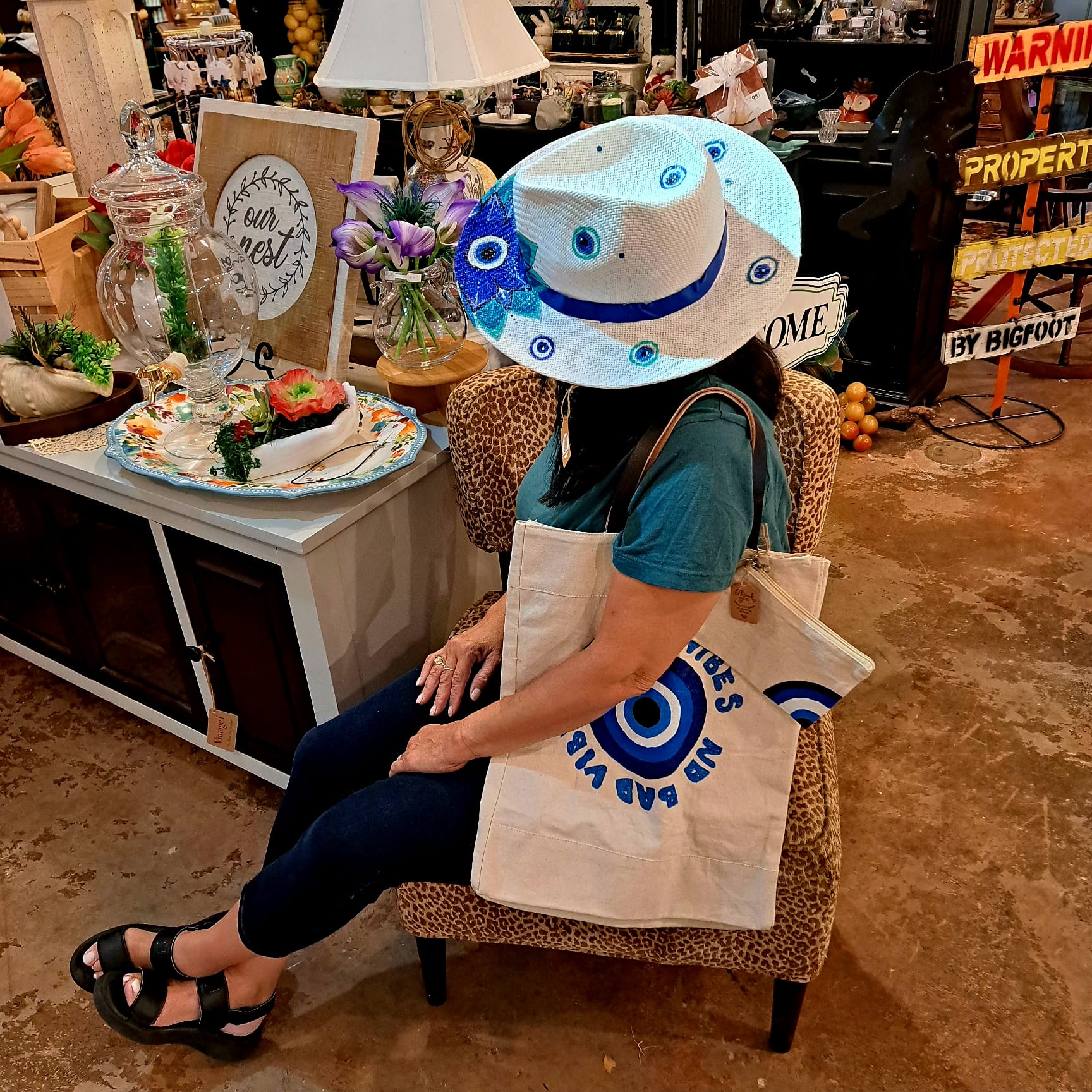 This unique handmade artisan set includes a decorated straw hat and a matching canvas tote bag, designed to create a bold, artistic, and cohesive look. Perfect for those who love handcrafted accessories with character and meaning.