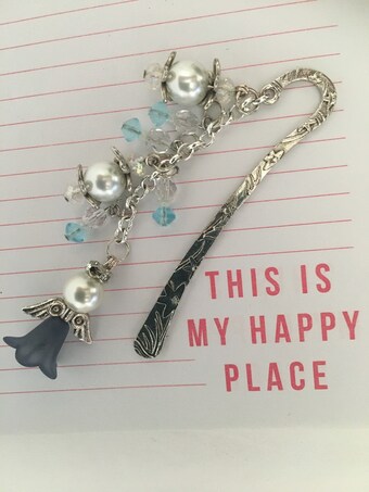 Each bookmark is handcrafted using silver-tone metal hooks with etched floral or textured designs. Charms hand strung with care using quality materials like glass pearls, faceted crystal beads, frosted glass flower petals, and detailed metal accents. The pink rose design features a hand-painted floral bead paired with angel wings, while the blue angel style includes layered bead caps and crystal dangles for added sparkle. Every piece is assembled by hand with attention to detail and durability, making each one a unique gift.