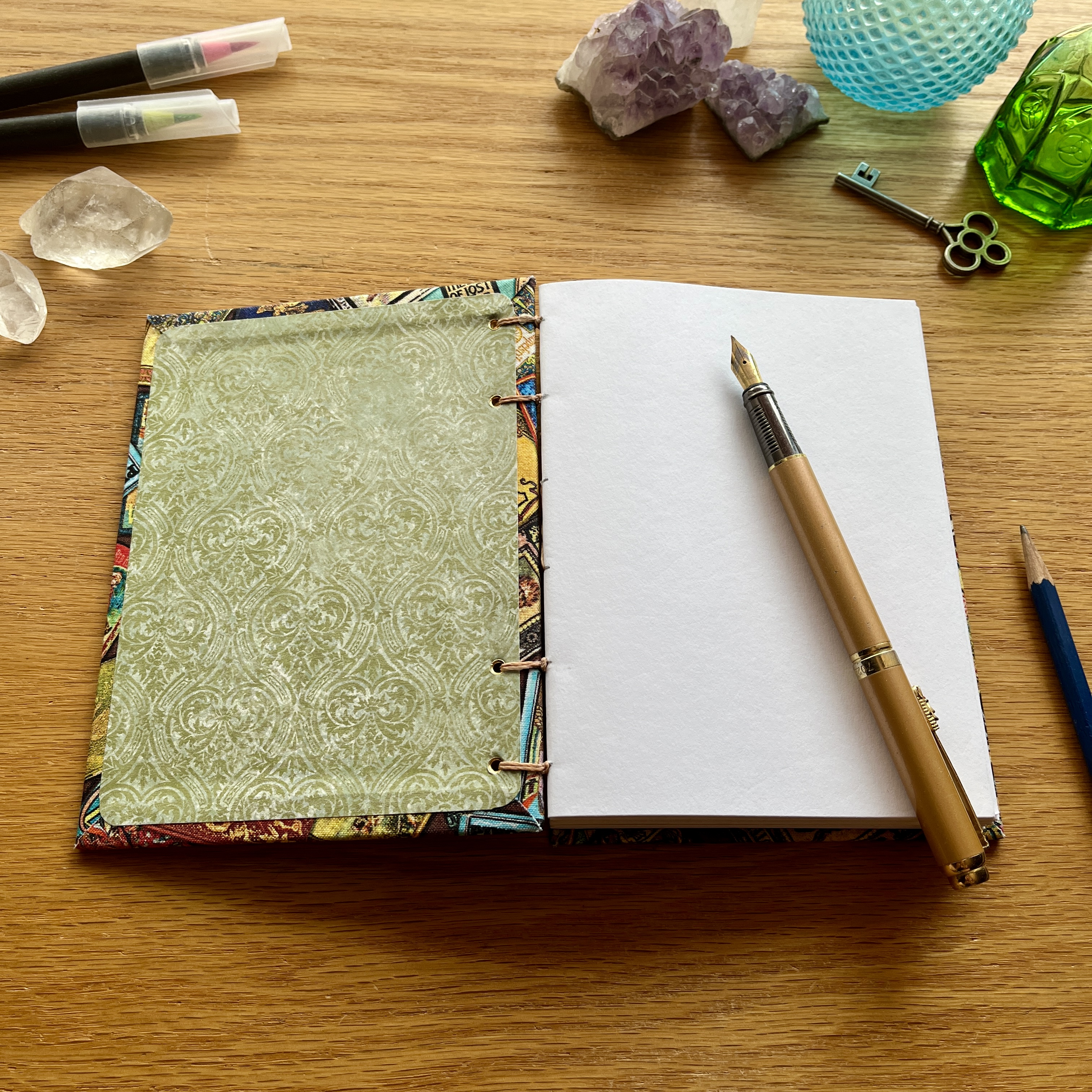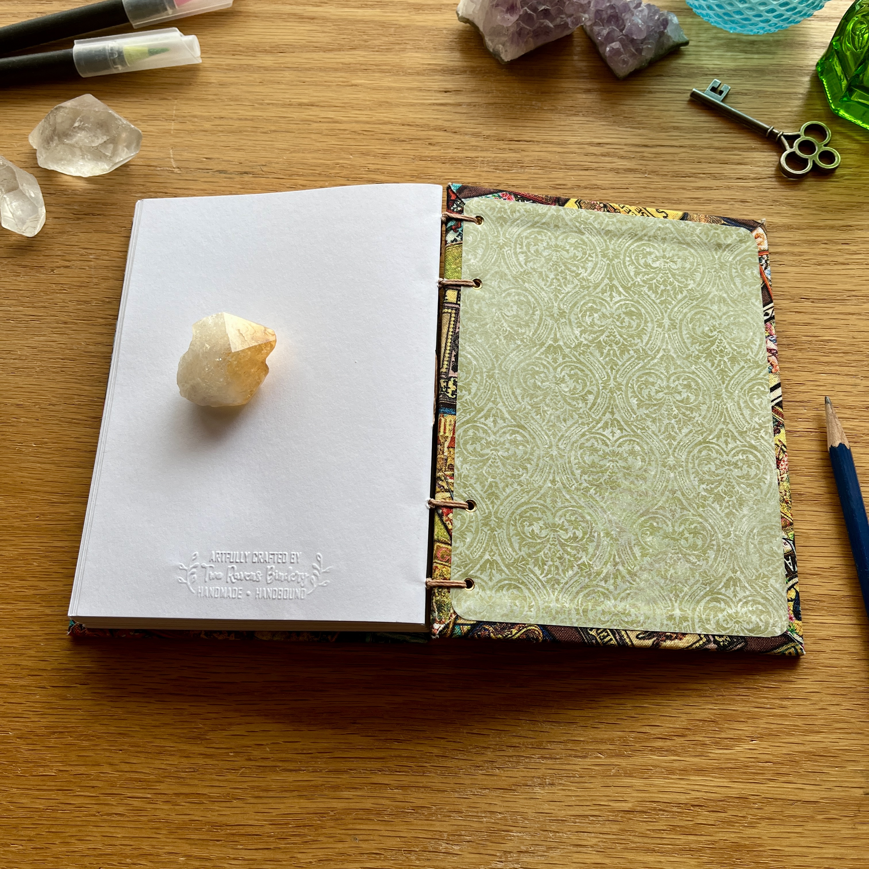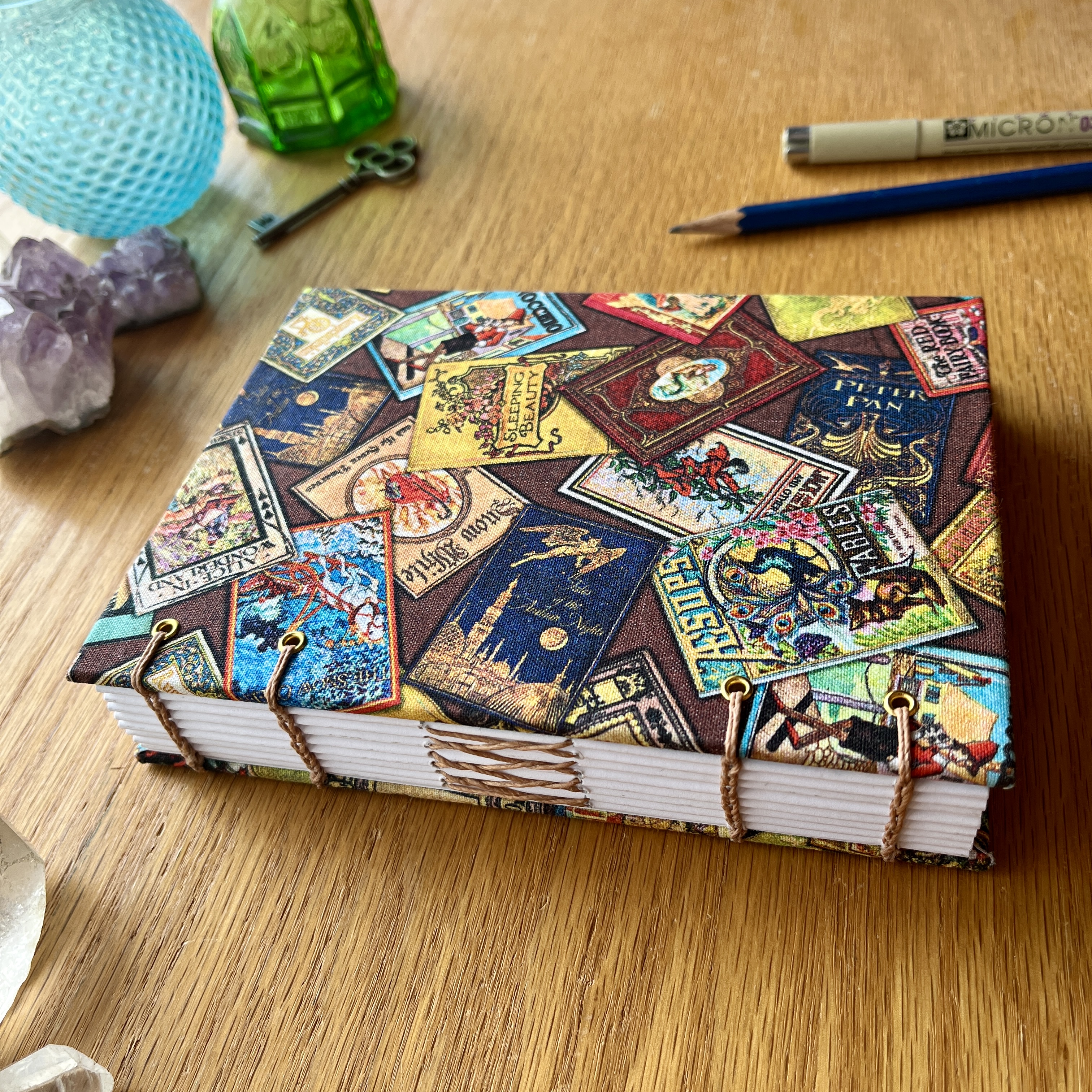 I've created the covers in a gorgeous classic fairytale book covers book cloth. Then meticulously handbound using the coptic french link binding technique which allows the book to lay perfectly flat when open for ease of use.