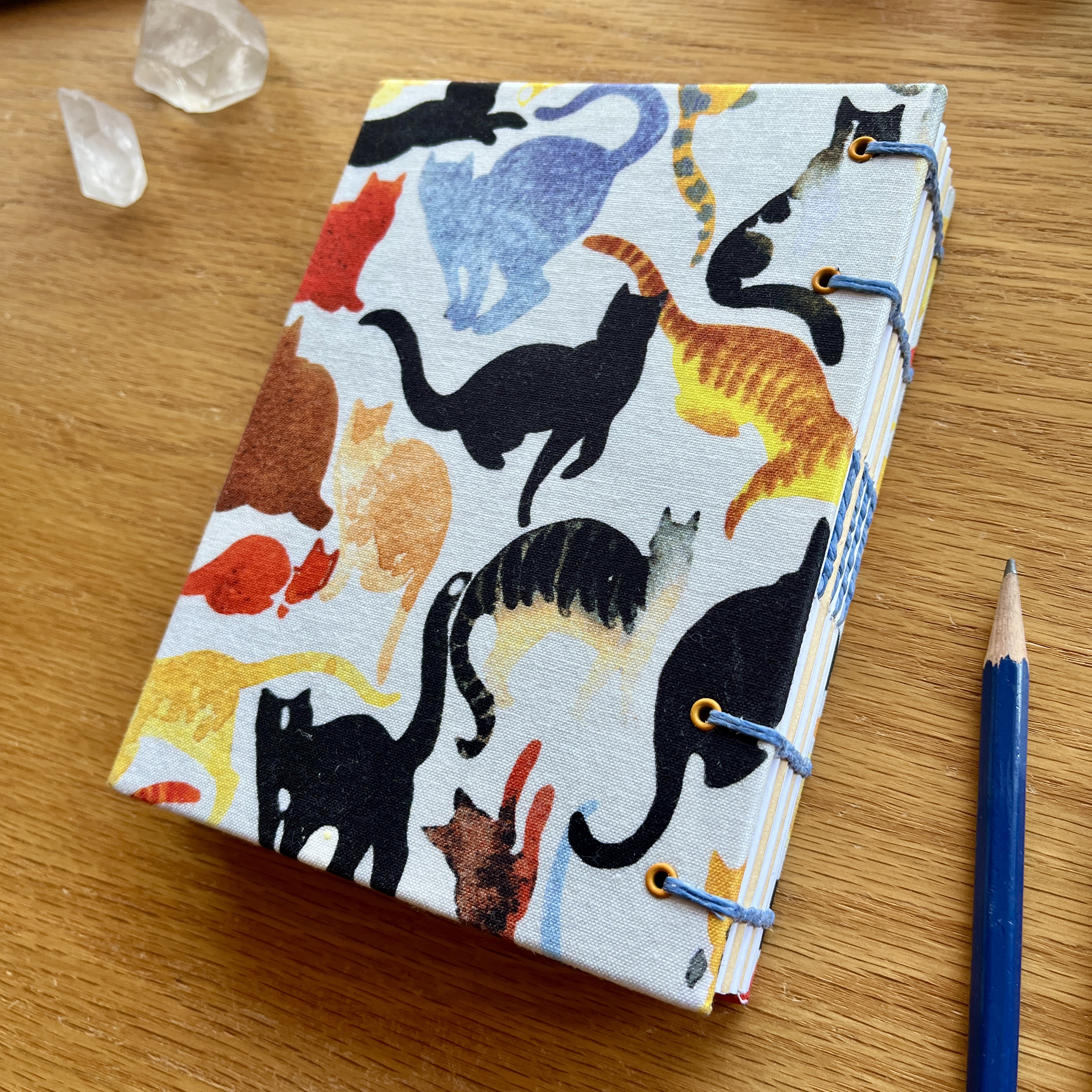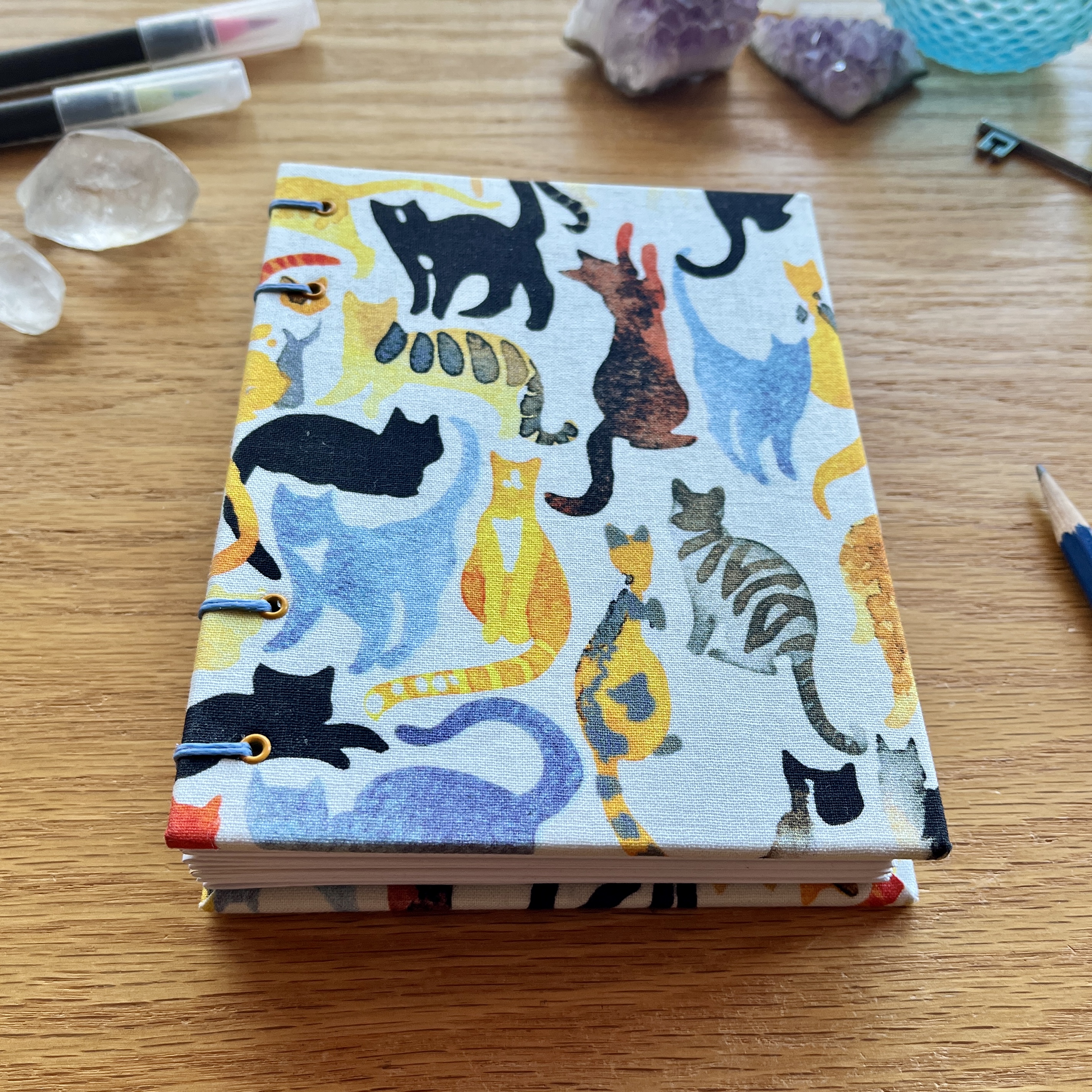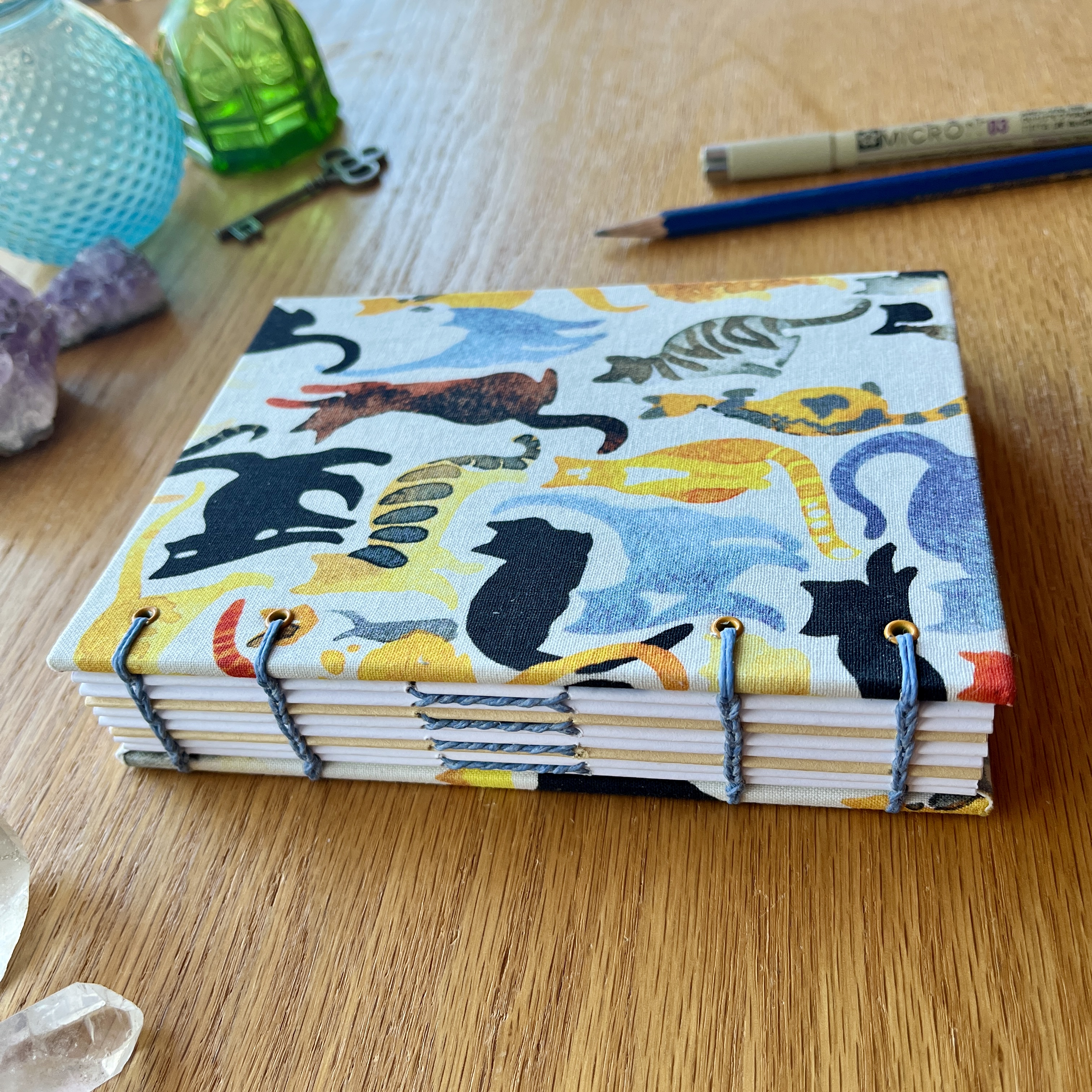 I've created the covers in a gorgeous watercolor cats patterned book cloth and meticulously handbound using a stylized coptic french twist binding technique which allows the book to lay perfectly flat when open for ease of use.