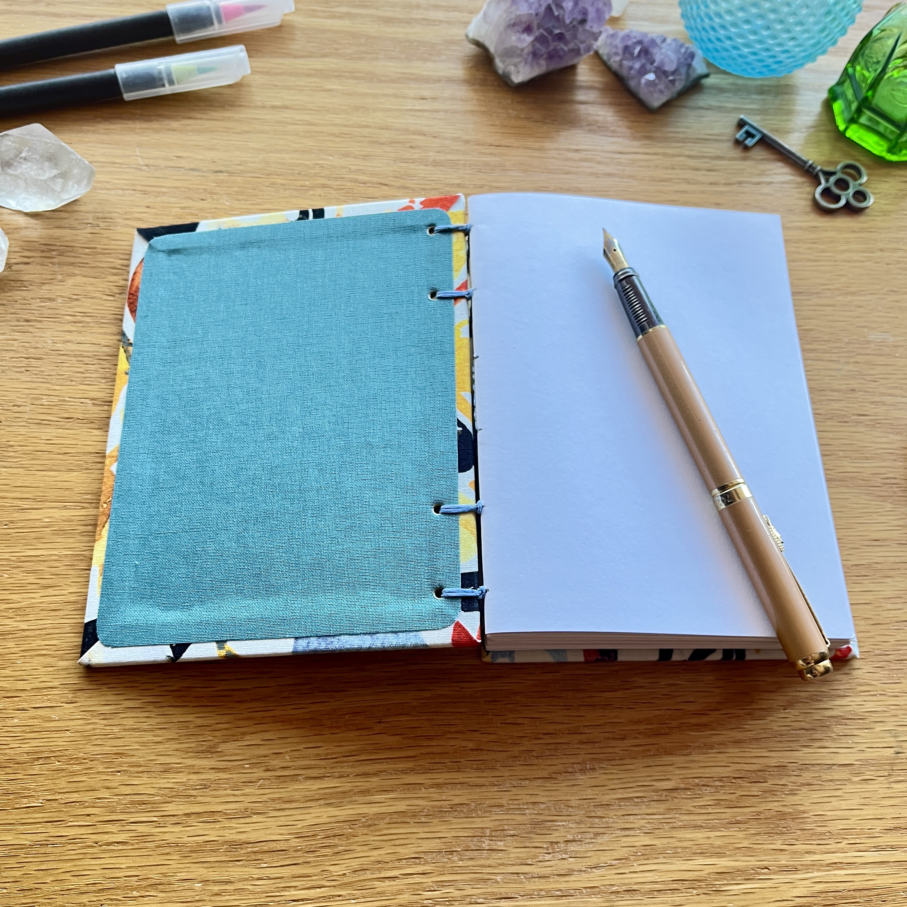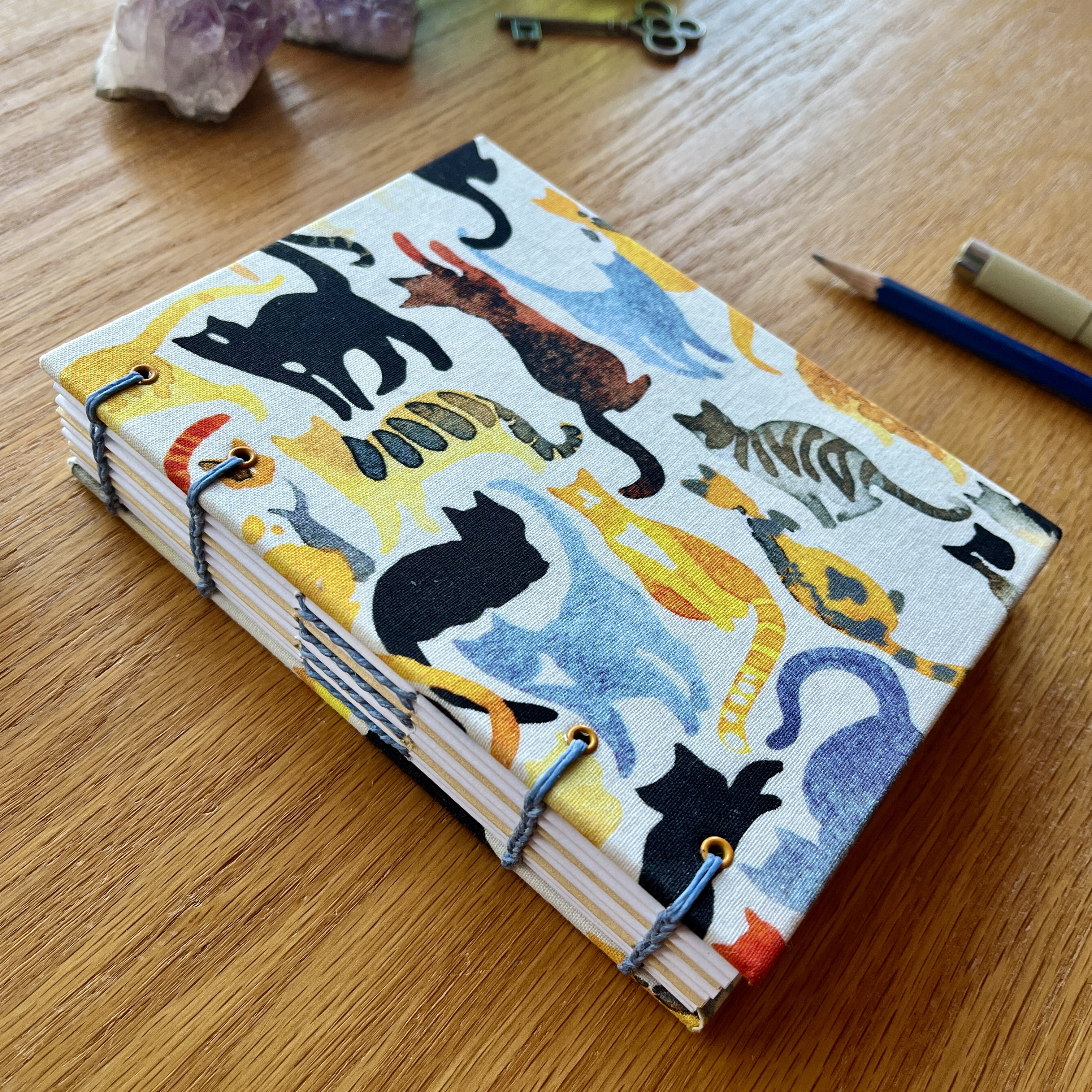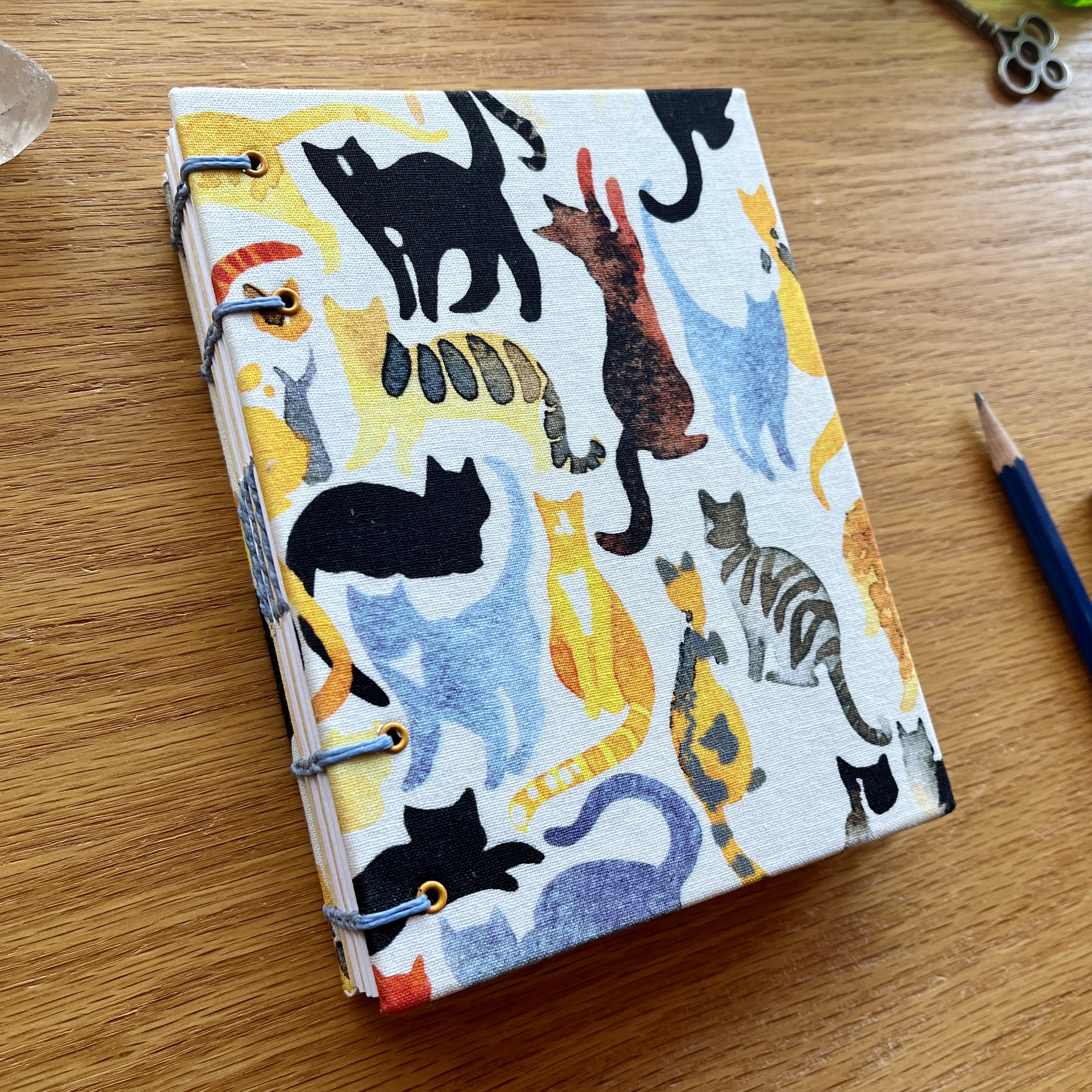 I've created the covers in a gorgeous watercolor cats patterned book cloth and meticulously handbound using a stylized coptic french twist binding technique which allows the book to lay perfectly flat when open for ease of use.
