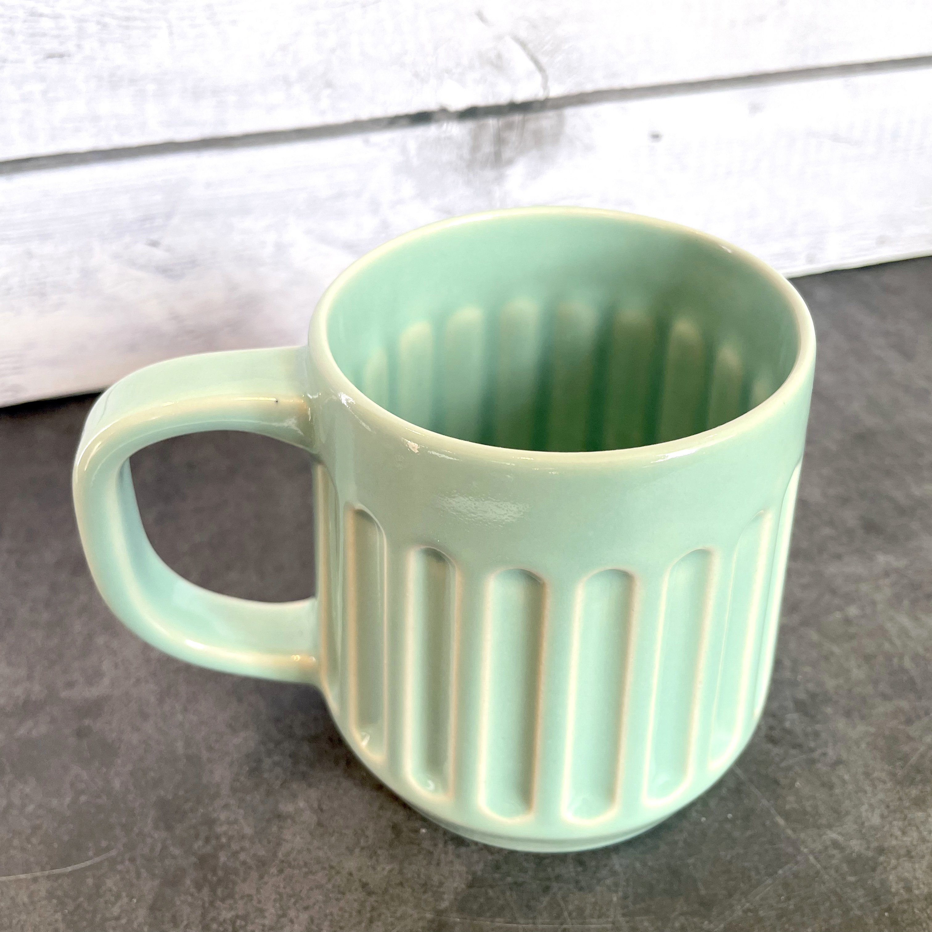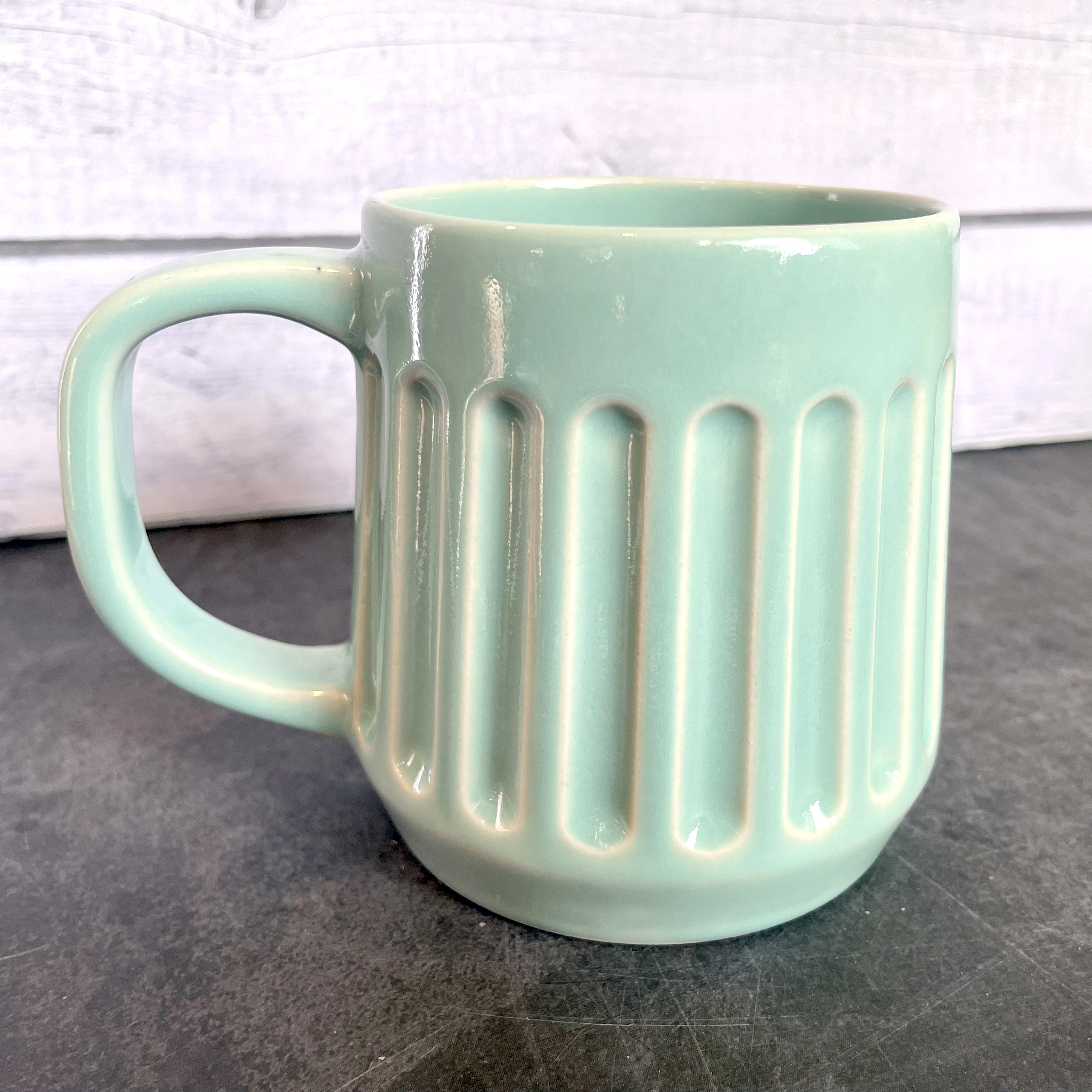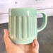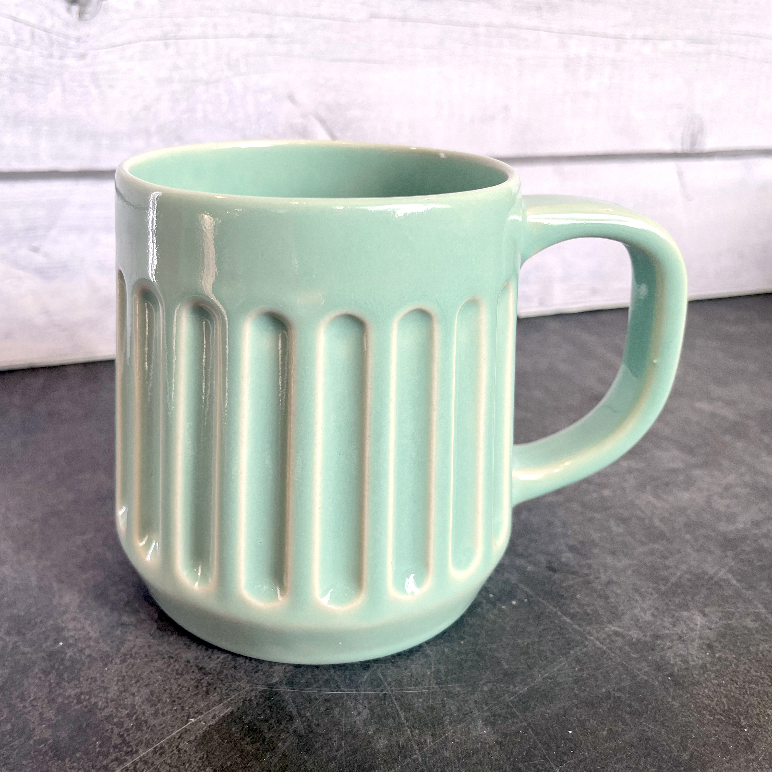 Ceramic Mugs in a stylish look. Our mugs are 15+oz capacity, which is the perfect middle size to enjoy your coffee or tea. Stoneware Clay fired to cone 6 with a Celadon green glaze. Lead free, food safe, microwave and dishwasher safe! Ships securely with lots of padding to make sure you get it with no issues.