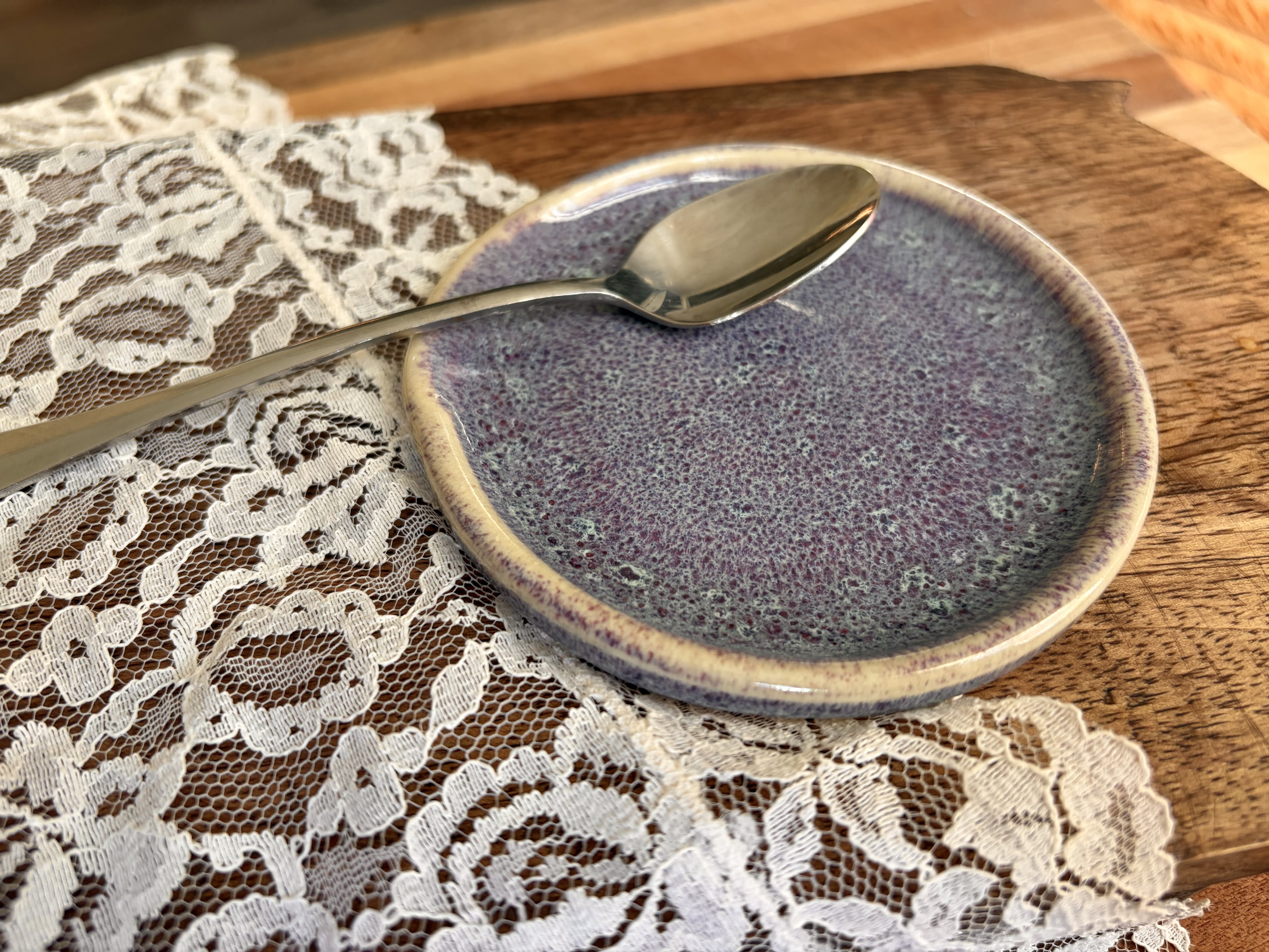 Wheel thrown spoon rest, glazed with multiple glazes, and fired to a glossy finish