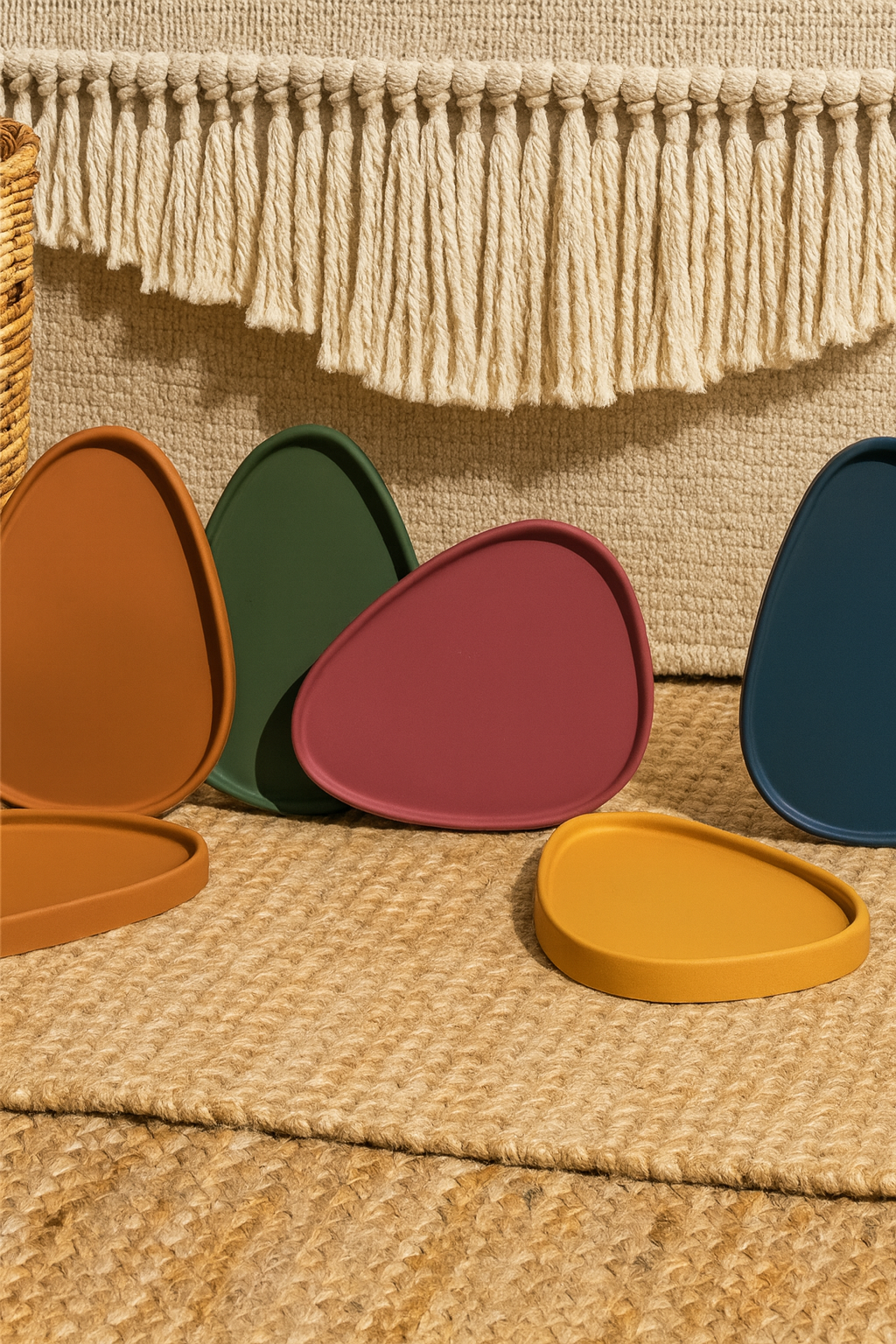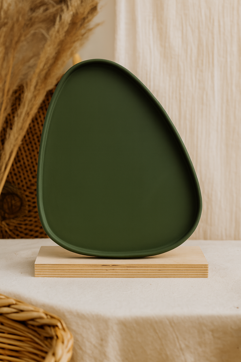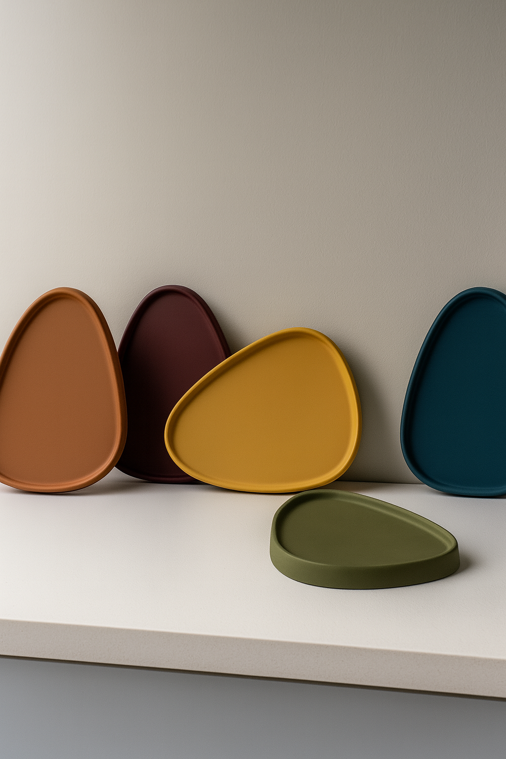 After curing, each tray is hand-sanded to remove rough edges and create a refined surface. I then apply hand-mixed pigments or painted finishes in rich, earthy, or jewel tones. To complete the process, I seal each piece with a non-toxic, water-resistant coating to protect against moisture and make it long-lasting.