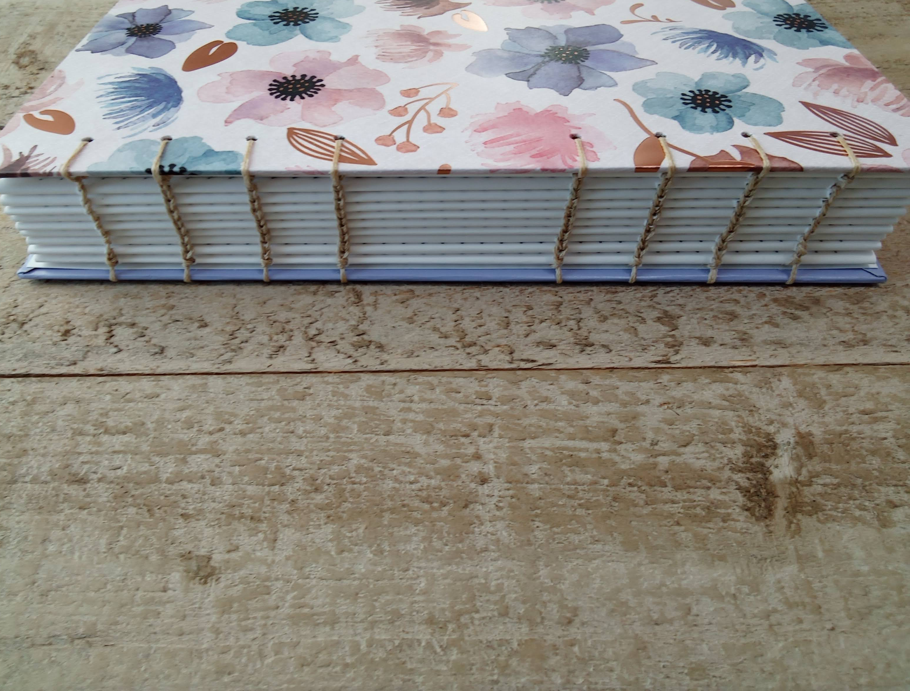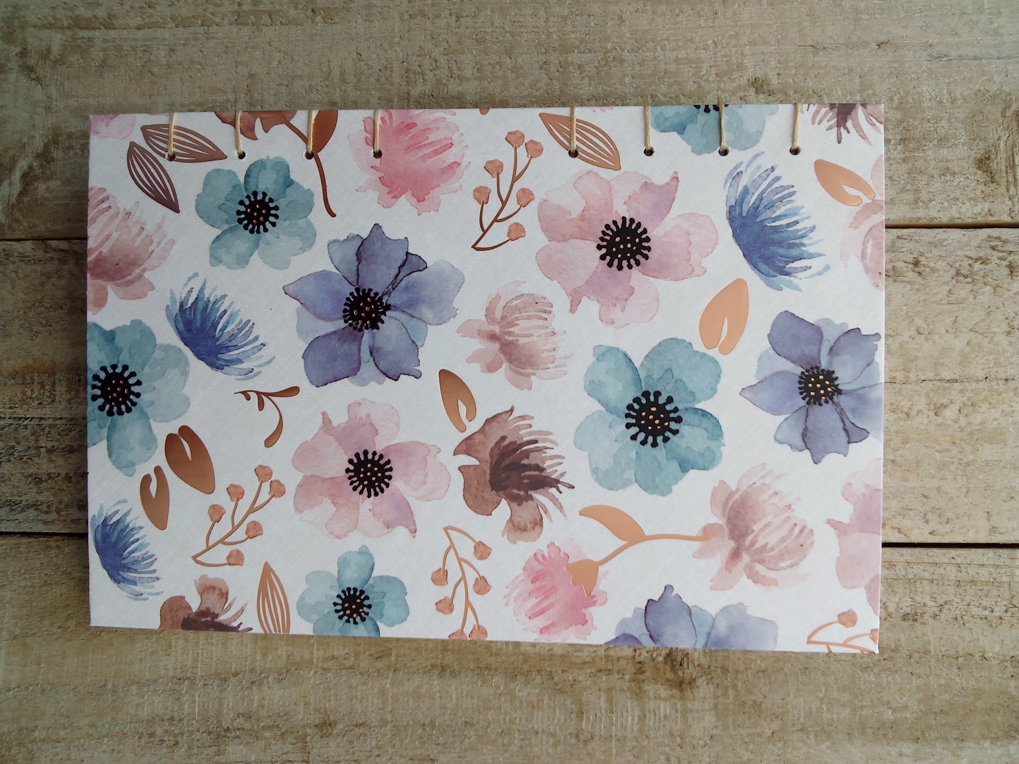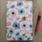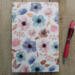 This journal has a front cover with flowers in pink, purple, and blue hues set on a pink background. Back cover is lavender.