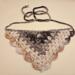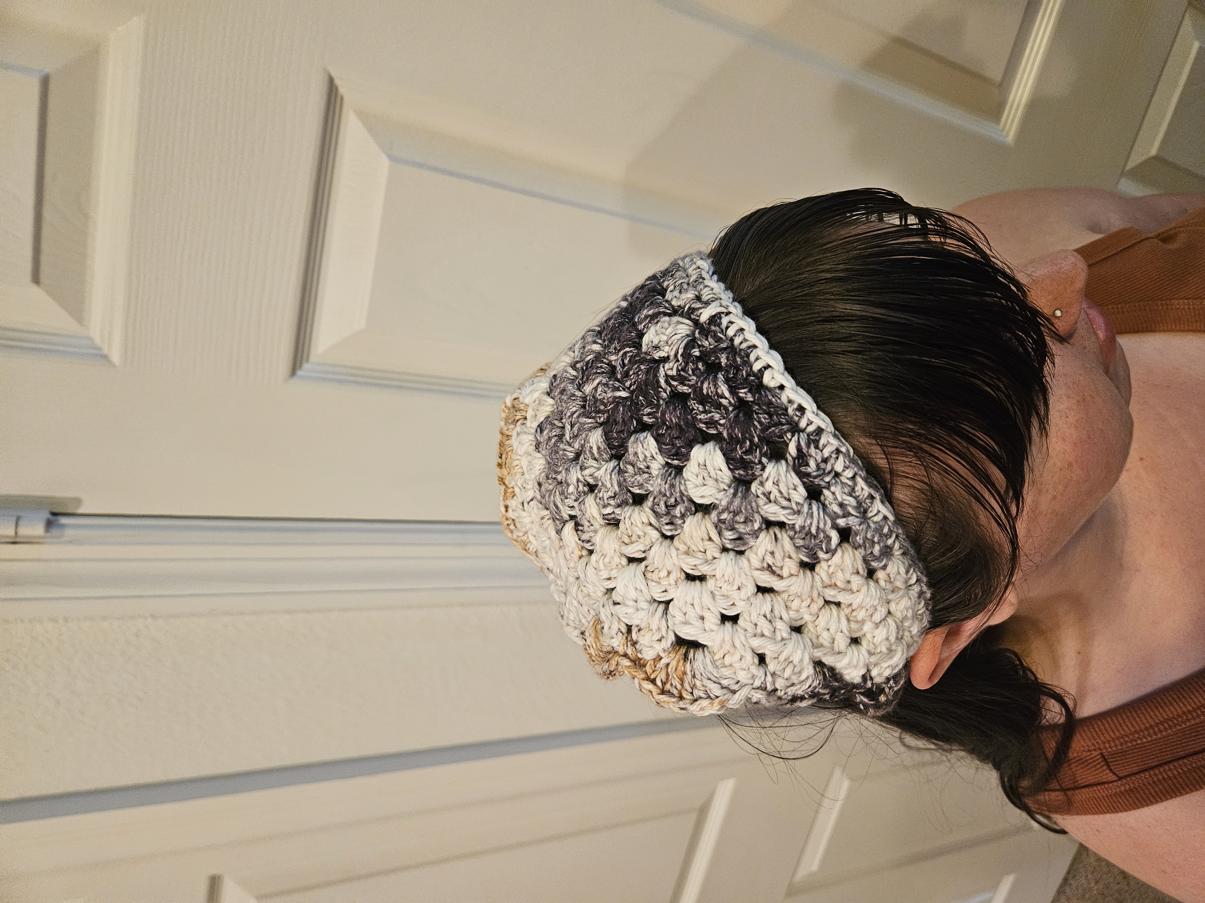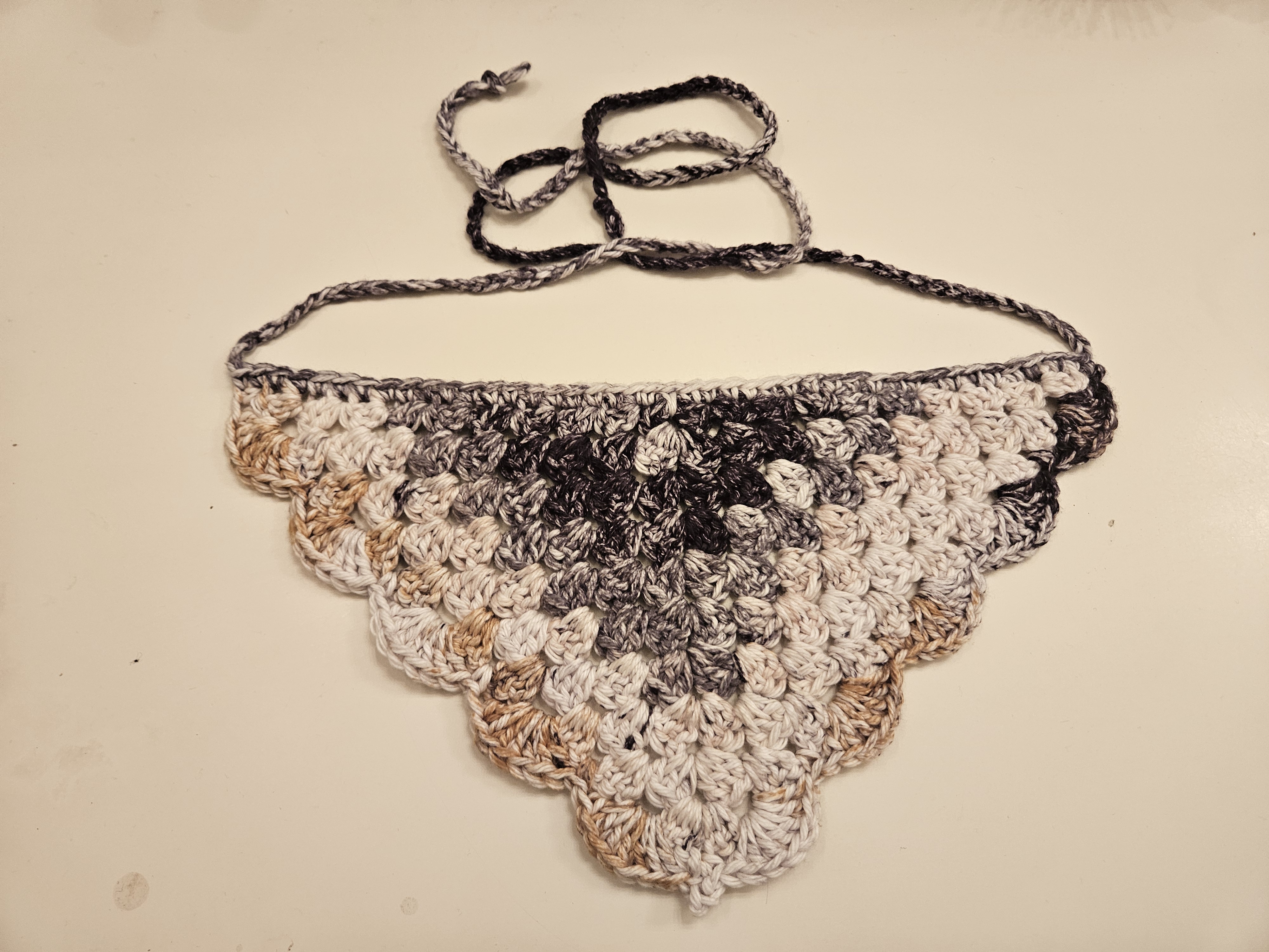 Add a touch of handmade charm to your outfit with this crocheted triangle bandana! Crafted with soft, high-quality yarn, this accessory features a gorgeous neutral ombré gradient of cream, tan, grey, and charcoal, making it versatile for any wardrobe.