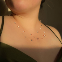 The design tells a story from collar to chest: small, delicate domes gather near the neckline, giving way to gradually larger drops and finishing with a beautifully elongated teardrop pendant that draws the eye downward in the most elegant way. The near-invisible filament line makes the resin pieces appear to float directly on your skin — an illusion so convincing that people will do a double take.