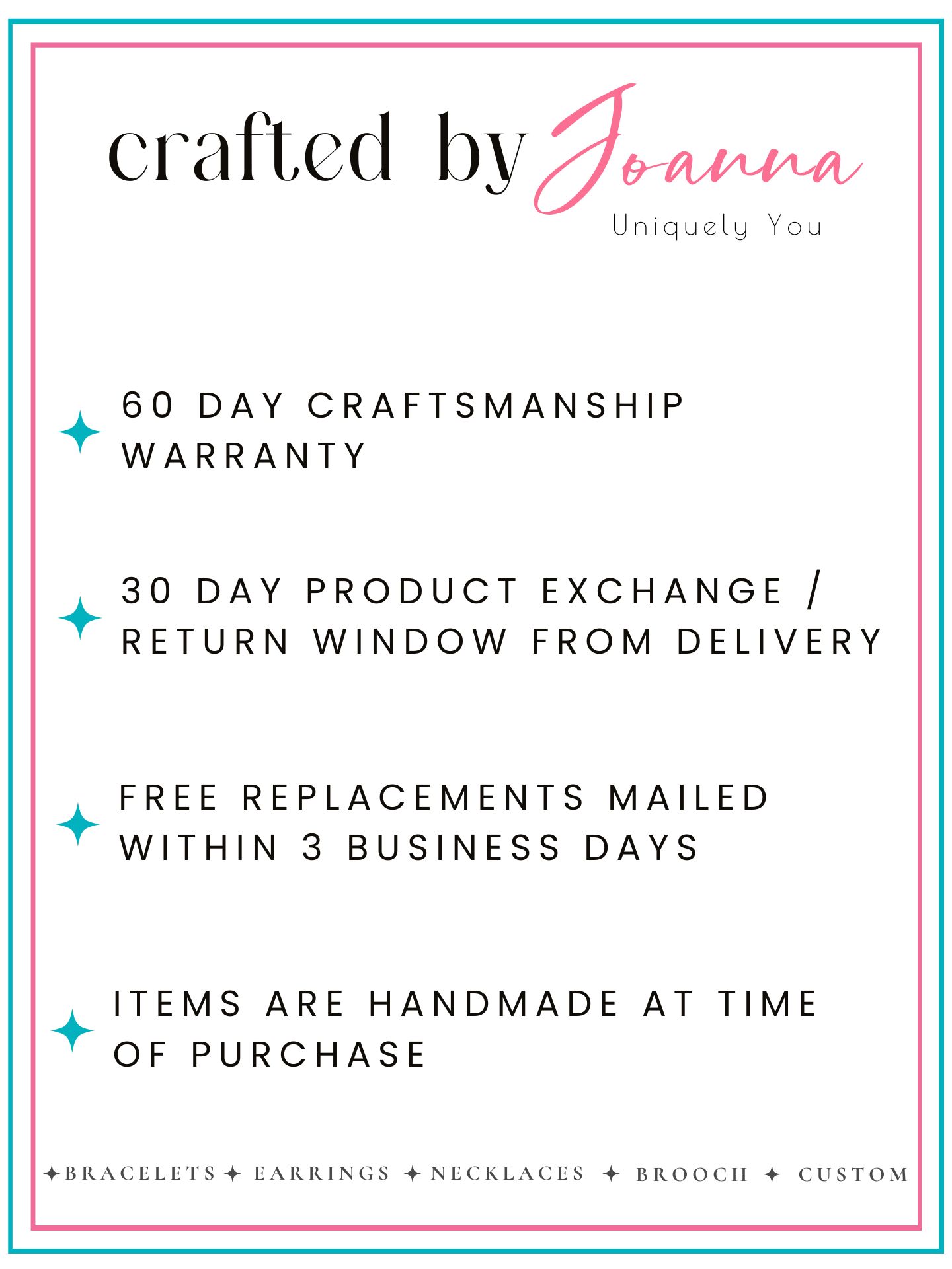 If something happens with your item within 60 days of purchase regarding craftsmanship, contact me and I will have a replacement made and mailed within 3 business days.