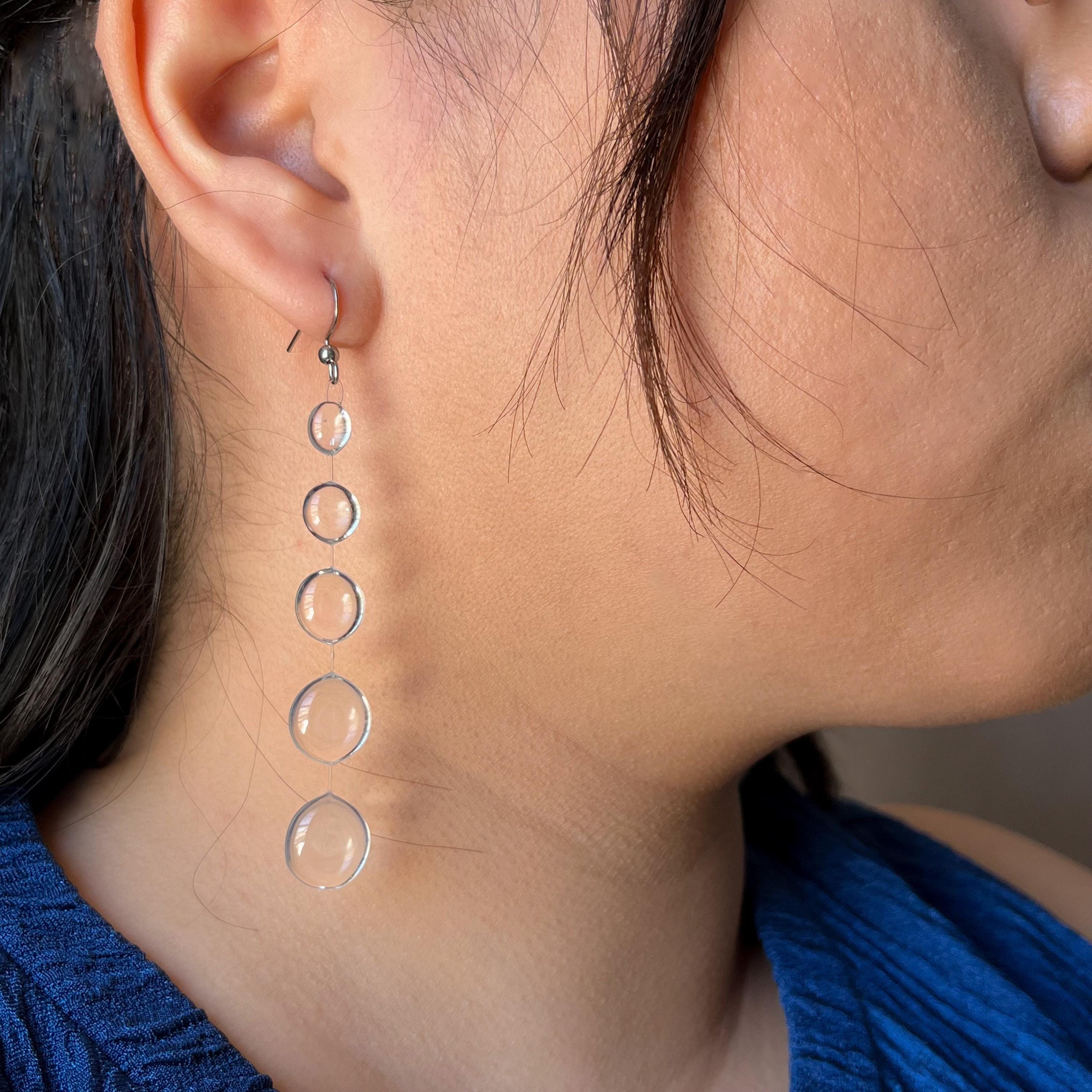 Crafted from crystal-clear UV resin, each earring features a vertical string of droplets, like rain suspended in time. Arranged in descending size, these glossy orbs mimic the delicate descent of water, creating a mesmerizing sense of rhythm and reflection as they dance with every turn of the head.