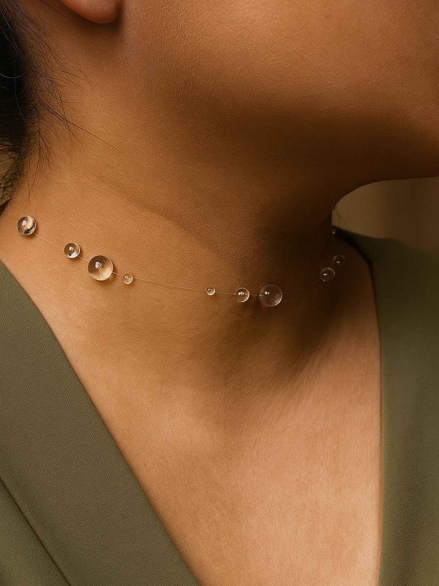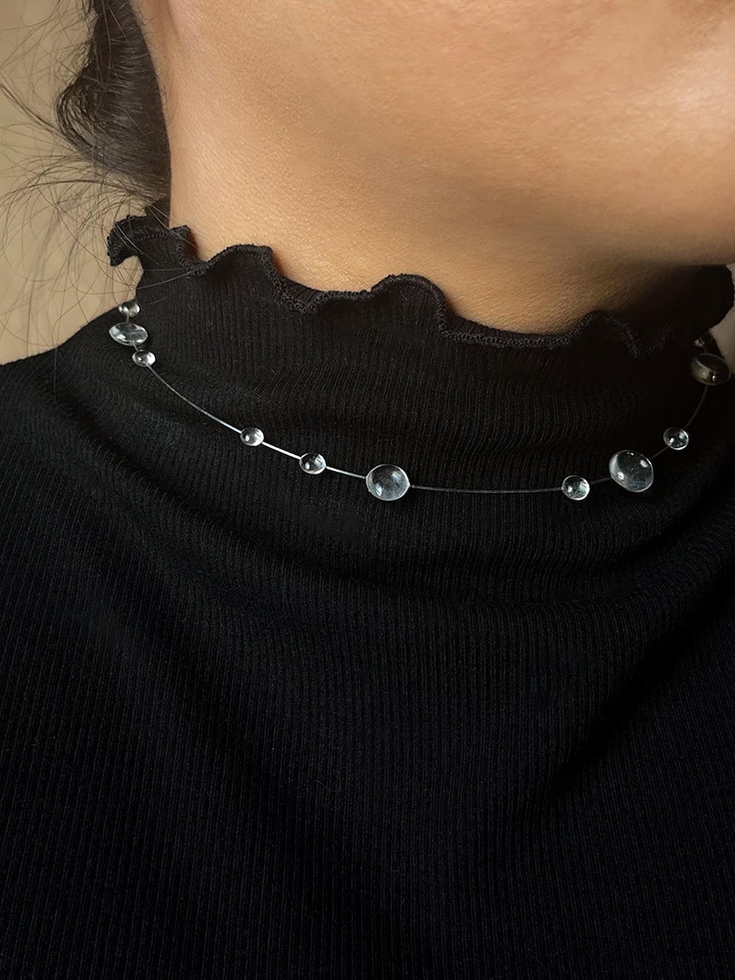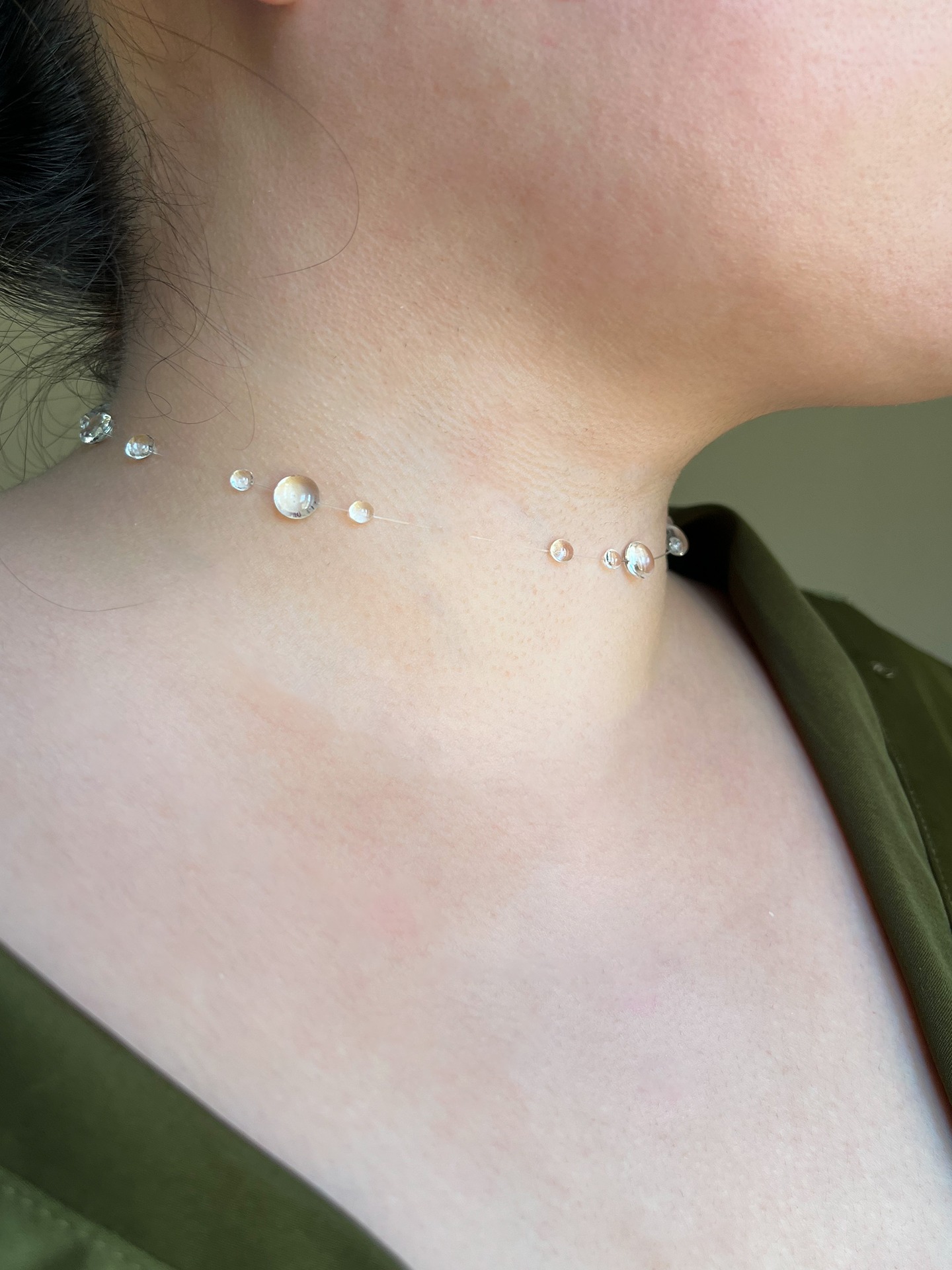 This whisper-light choker is the kind of necklace that makes people look twice — because at first glance, it seems like tiny drops of water are simply resting on your collarbone, suspended by nothing at all. Handcrafted with clear UV resin and nearly invisible filament line, each rounded dewdrop dome is individually formed and placed to create a delicate, scattered constellation of light around your neck.