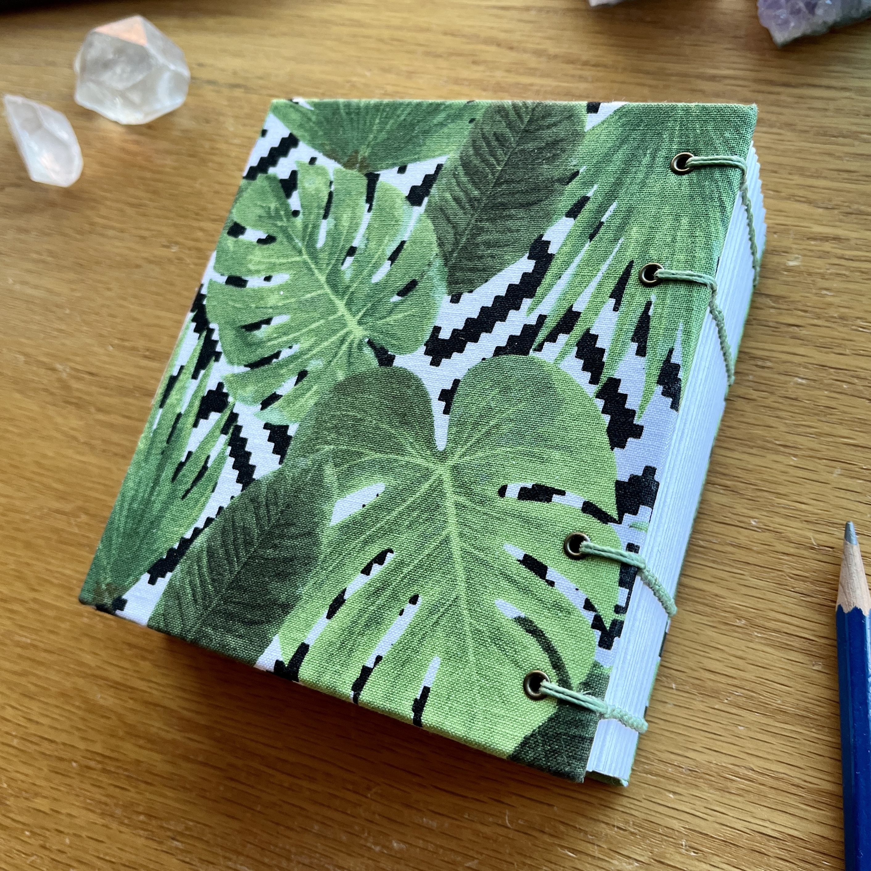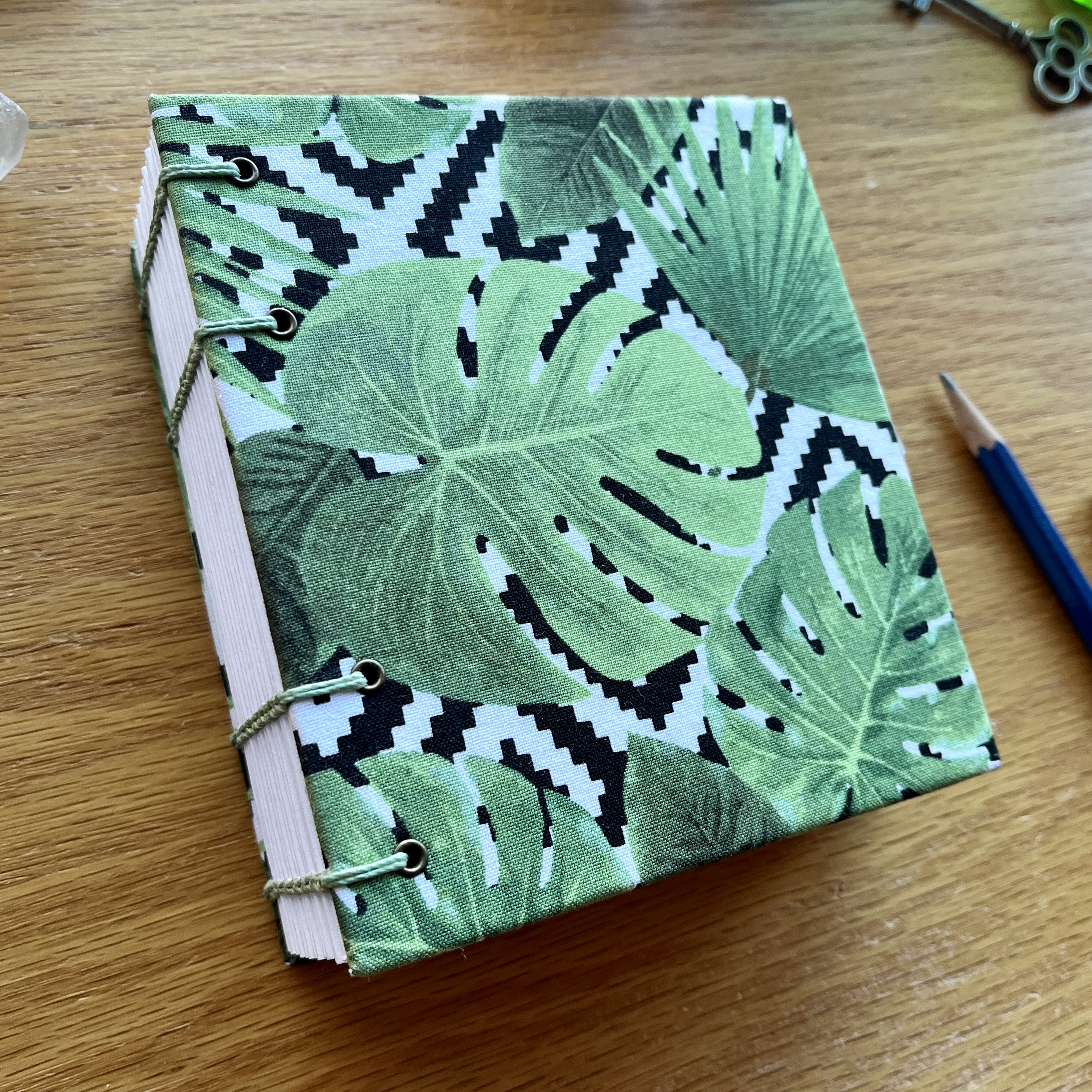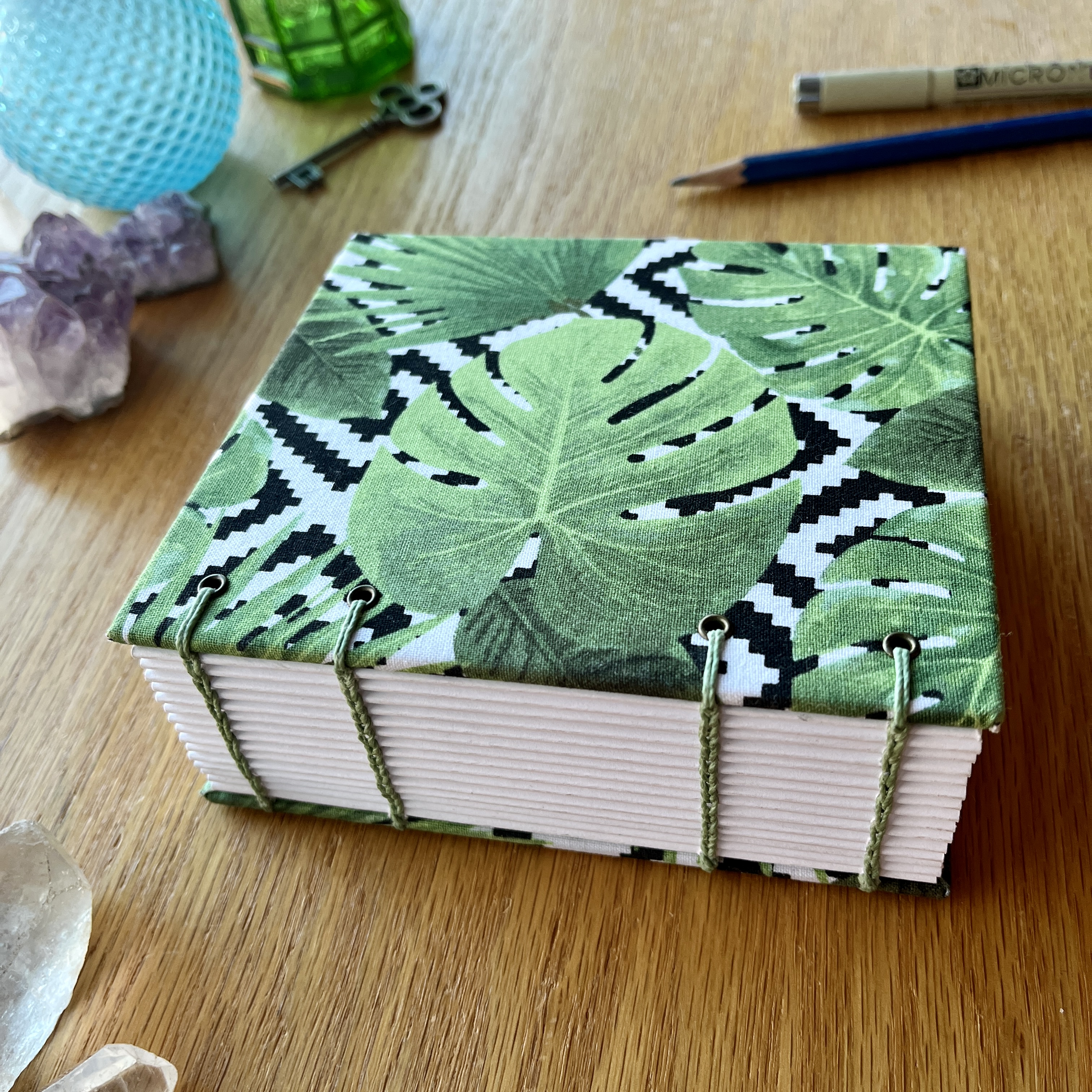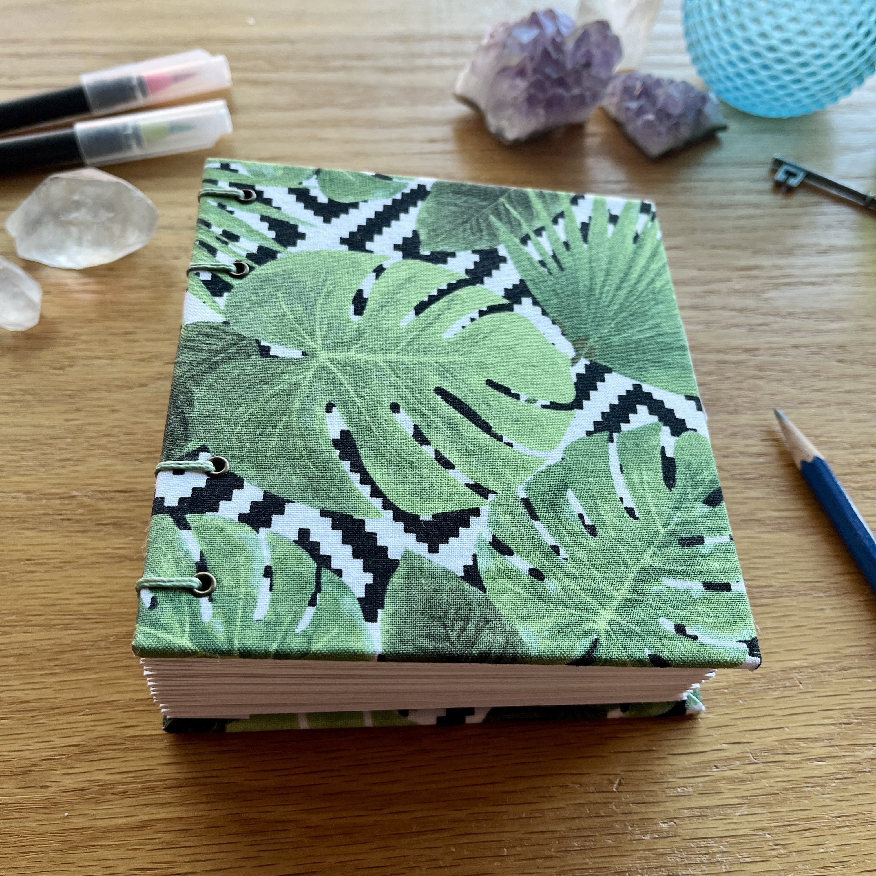 I've created the hardcovers in a monstera leaves pattern book cloth and meticulously handbound using the coptic binding technique which allows the book to lay perfectly flat when open for ease of use.