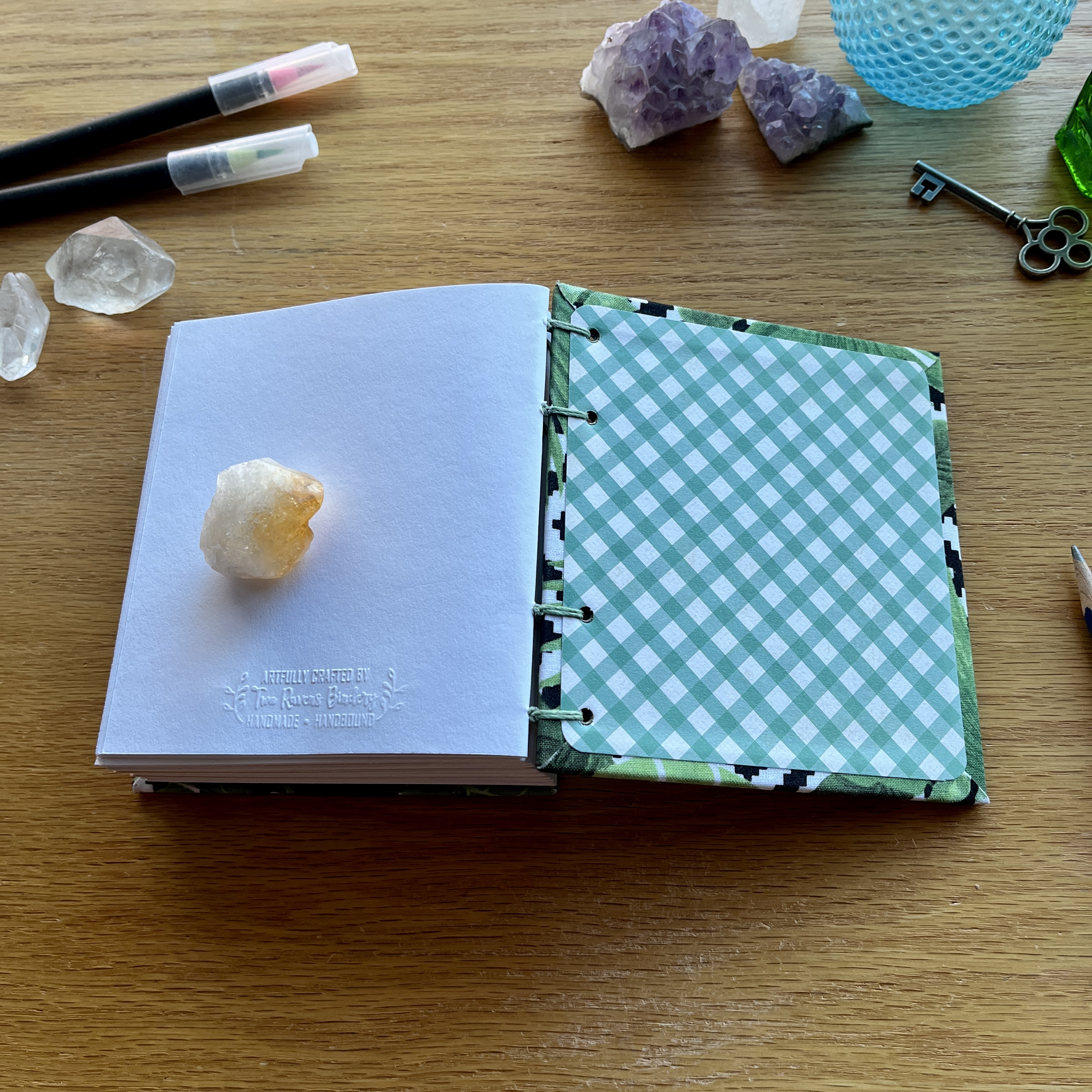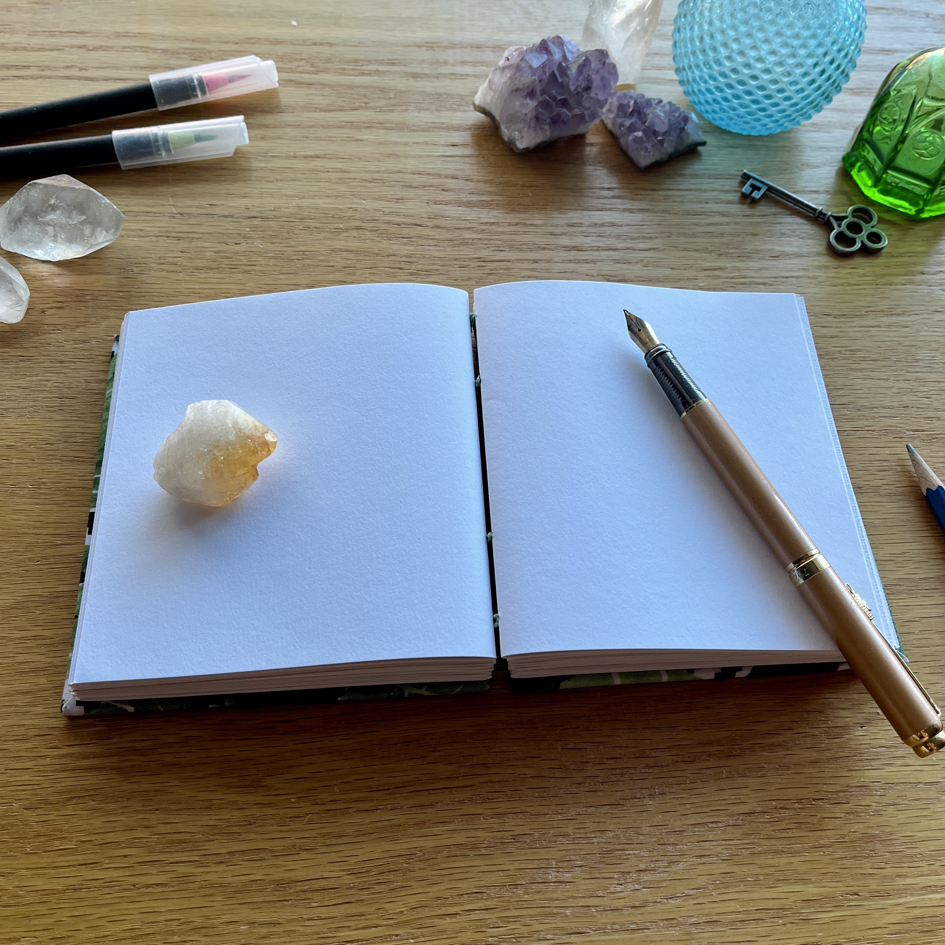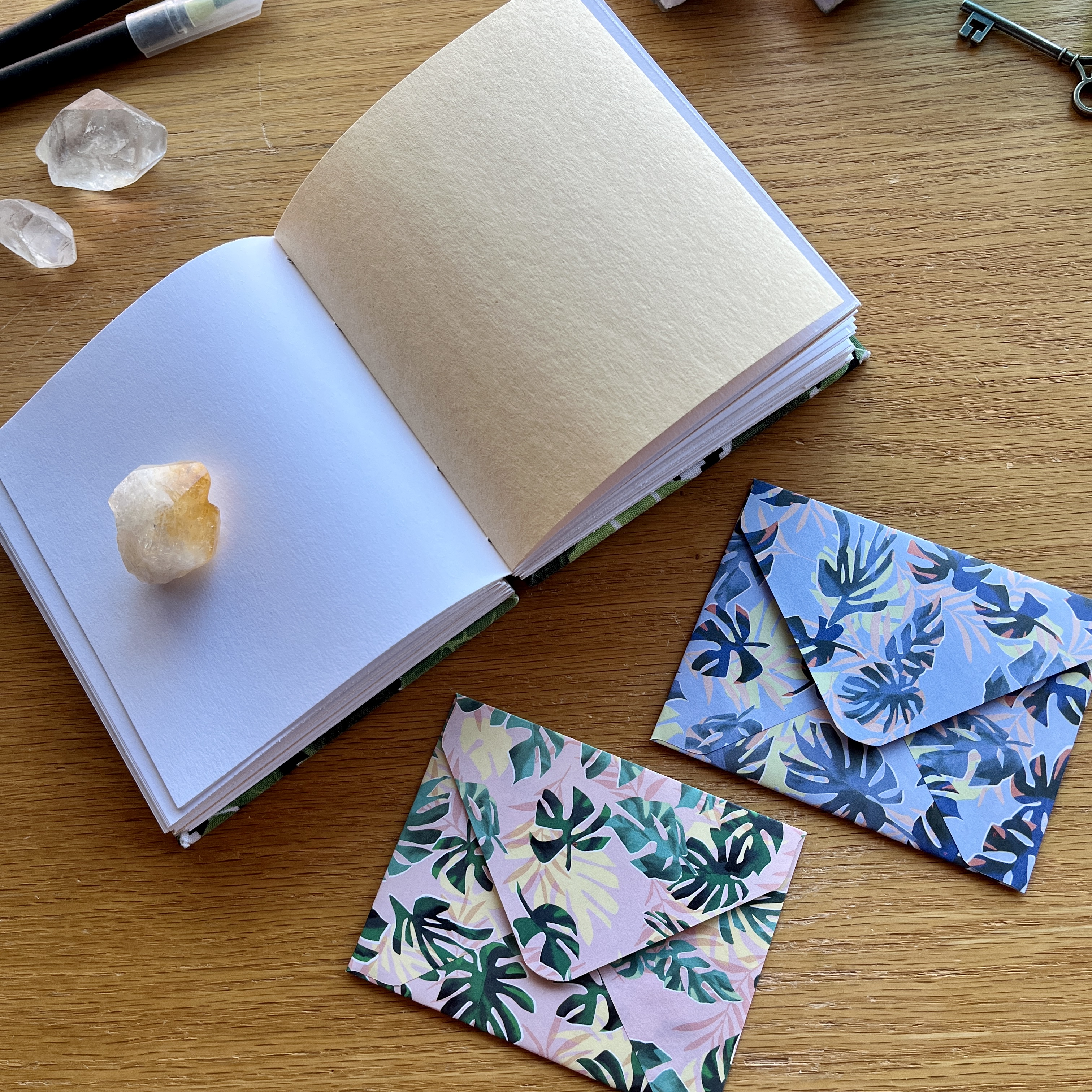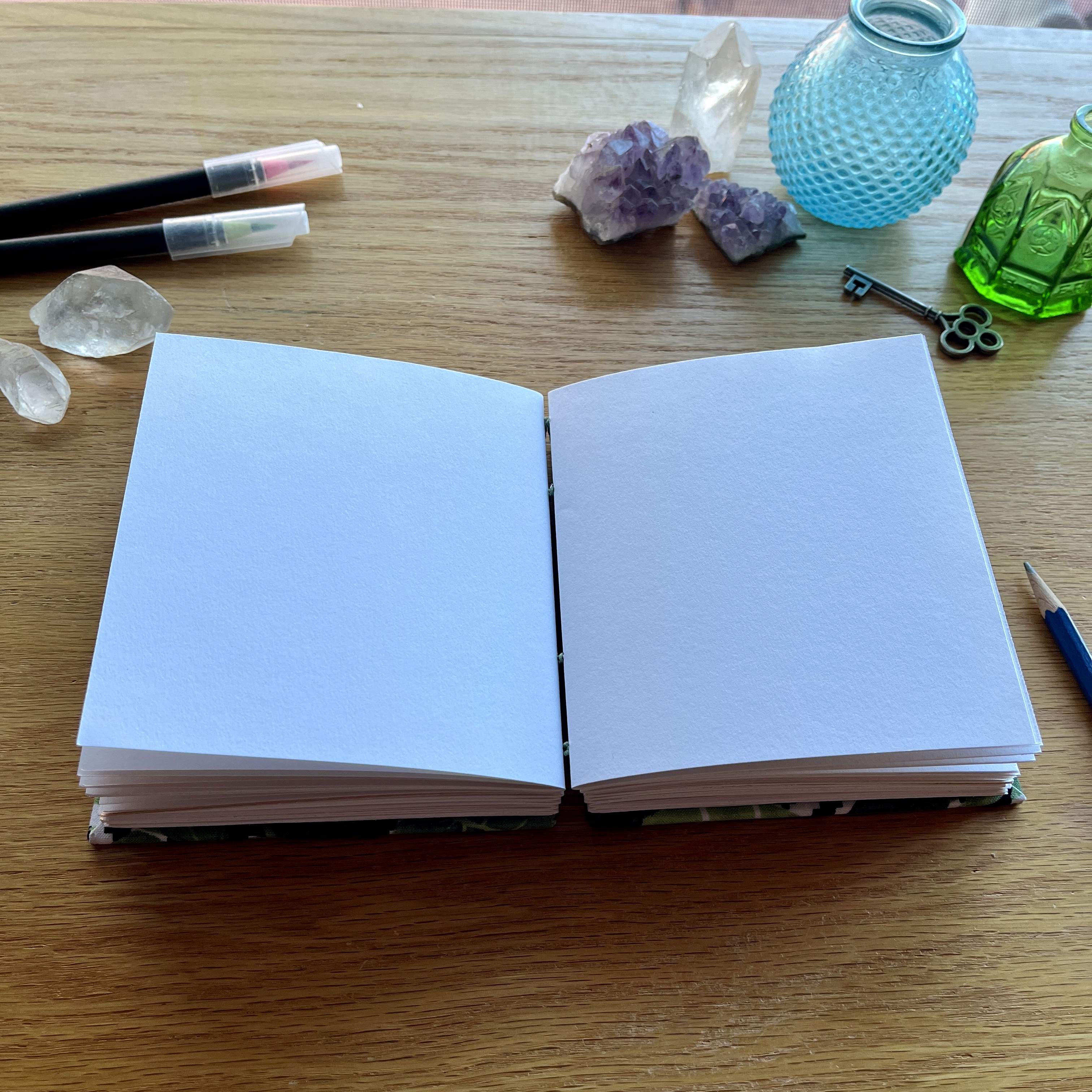 I've created the hardcovers in a monstera leaves pattern book cloth and meticulously handbound using the coptic binding technique which allows the book to lay perfectly flat when open for ease of use.