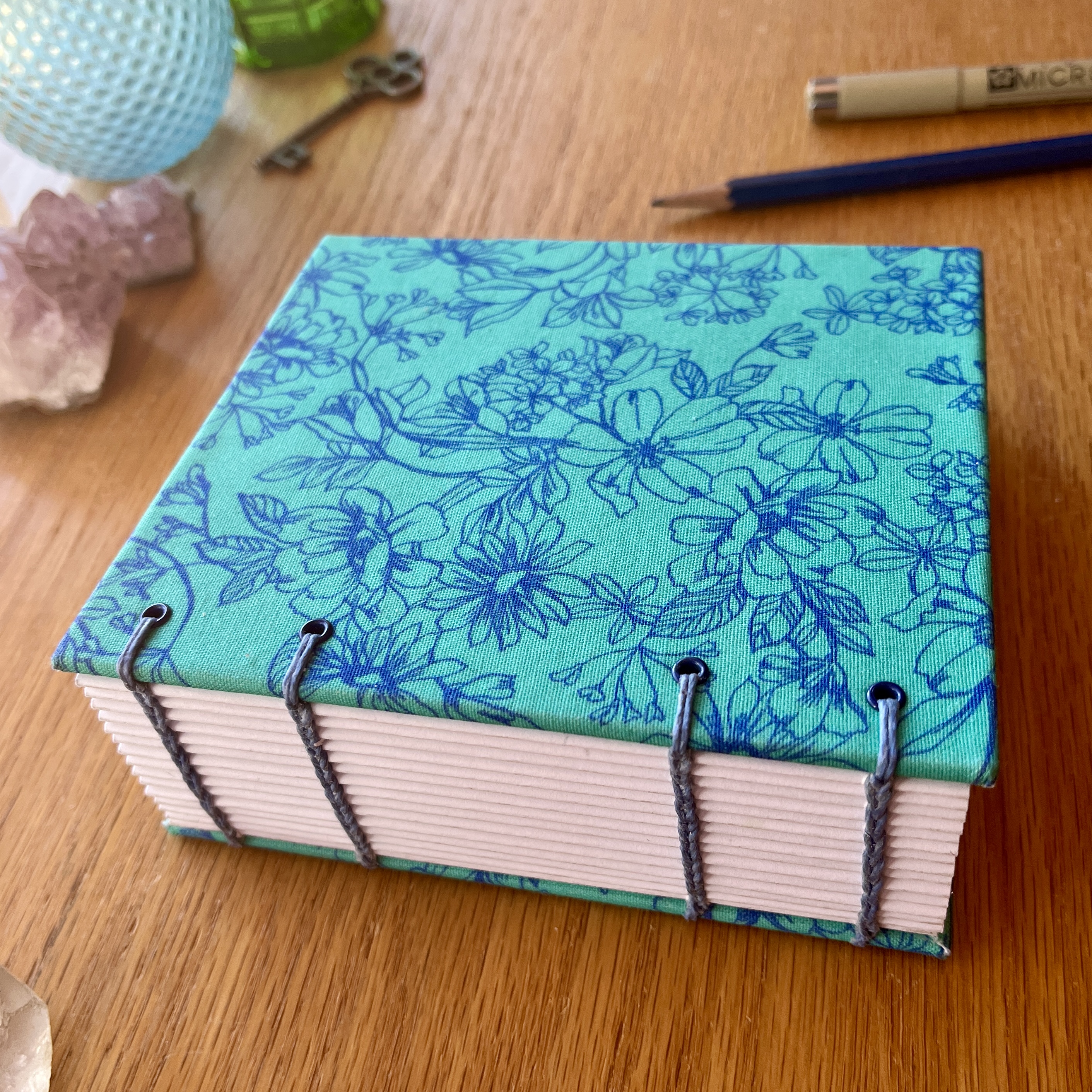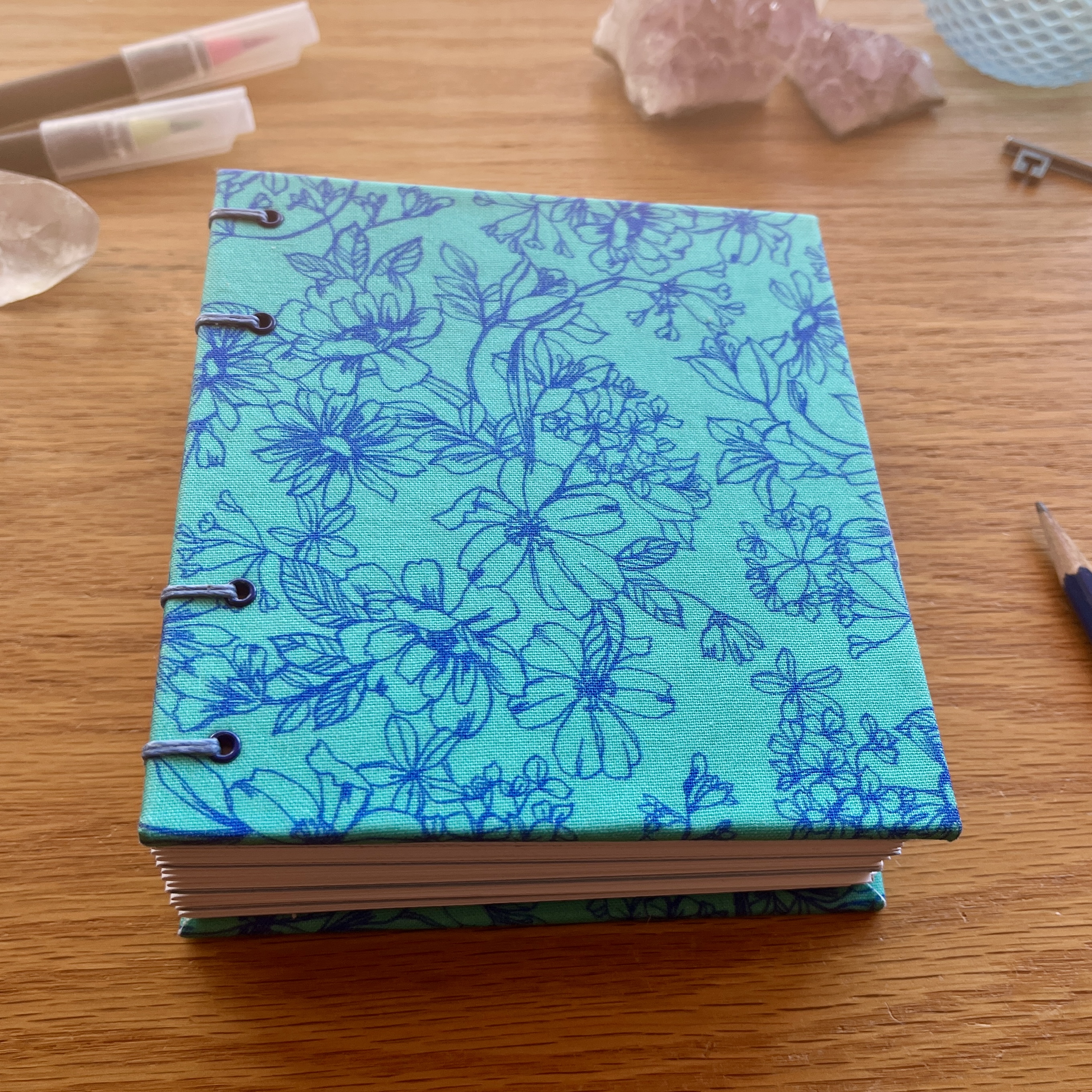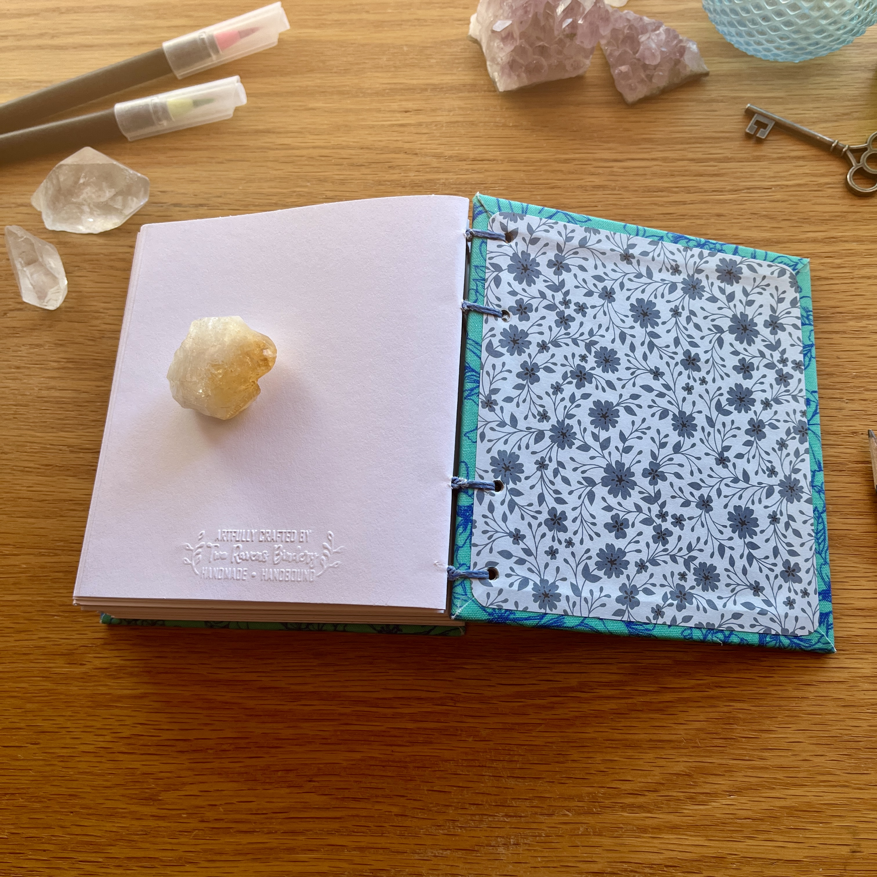 I've created the hardcovers in a stunning blue floral book cloth and meticulously handbound using the coptic binding technique which allows the book to lay perfectly flat when open for ease of use.