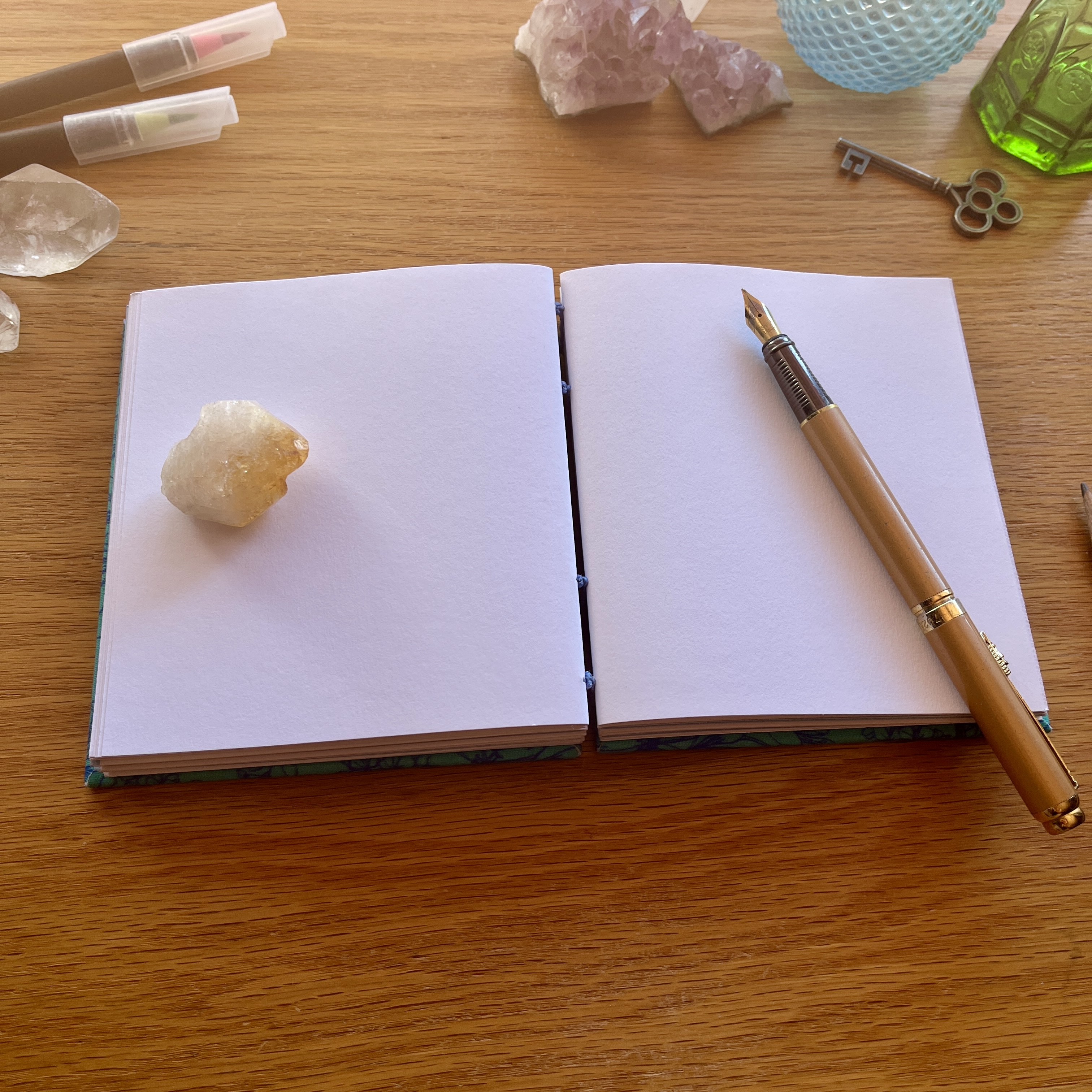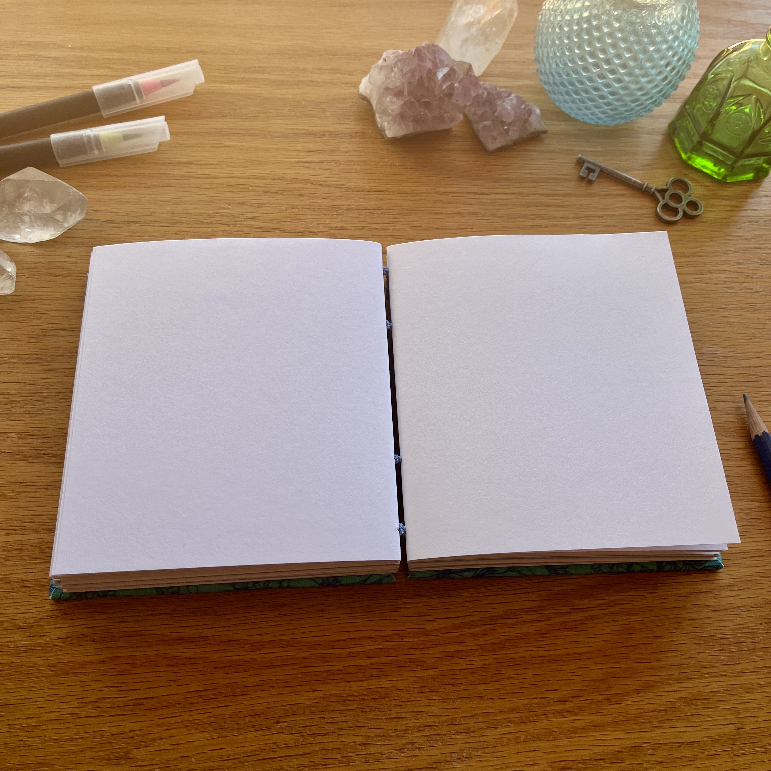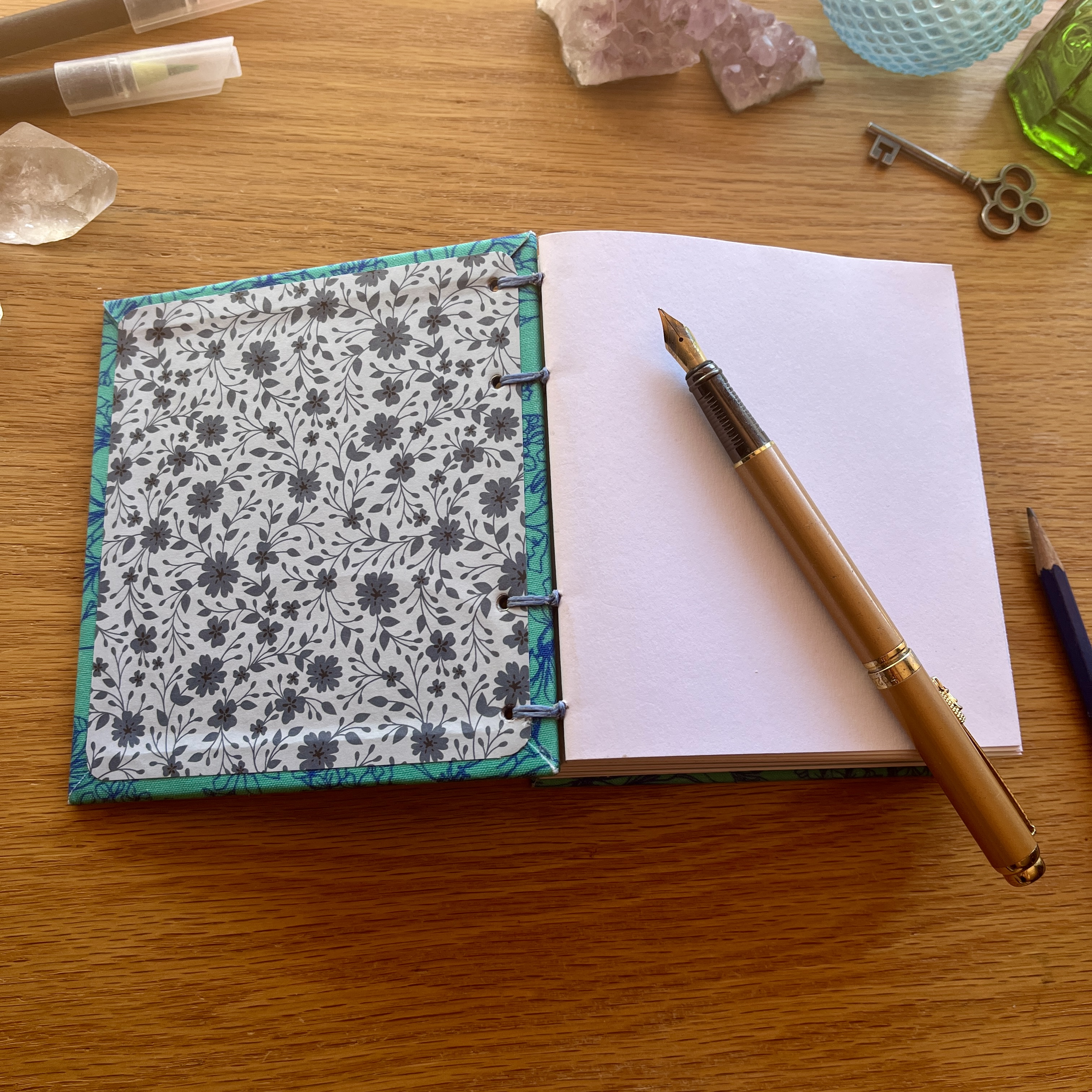 I've created the hardcovers in a stunning blue floral book cloth and meticulously handbound using the coptic binding technique which allows the book to lay perfectly flat when open for ease of use.