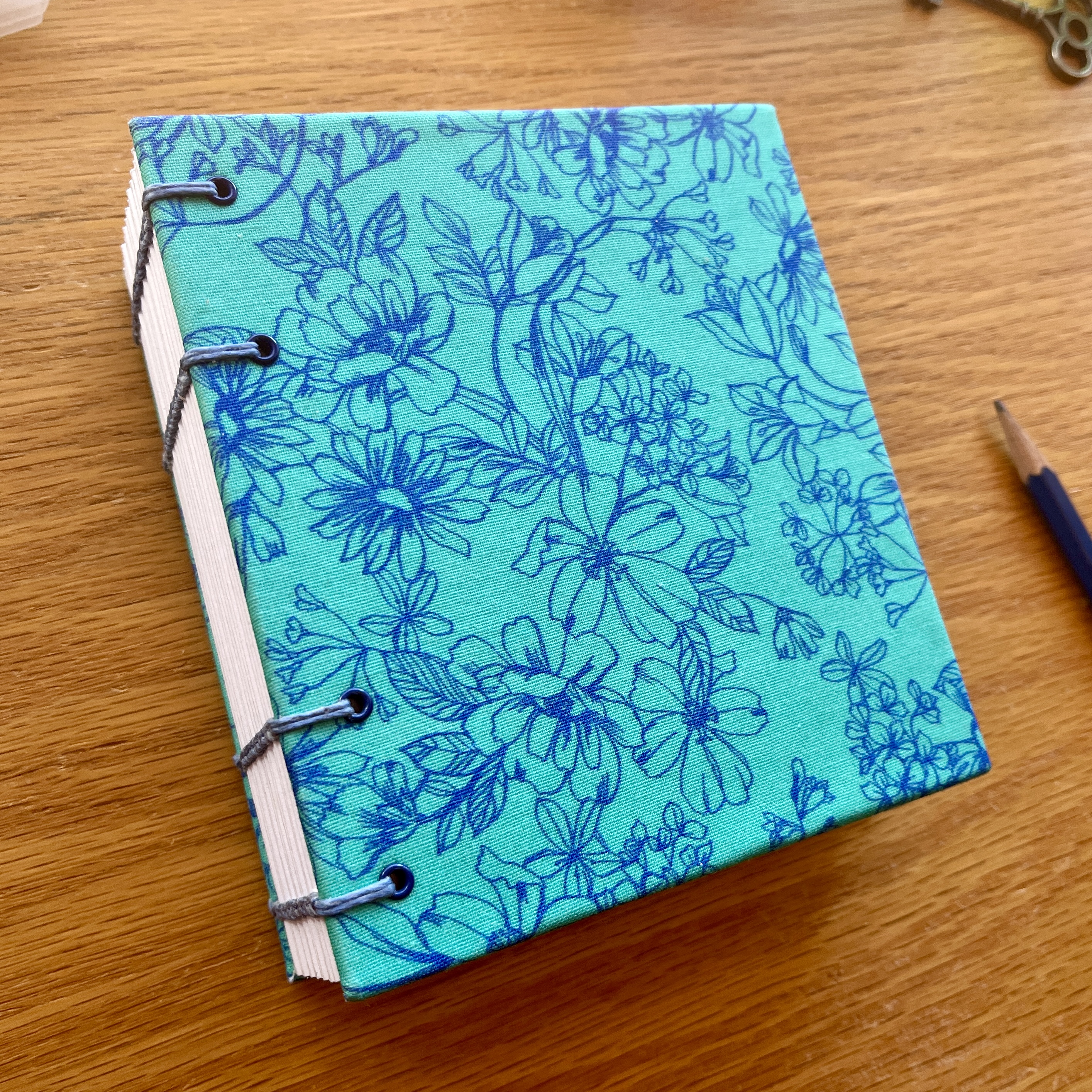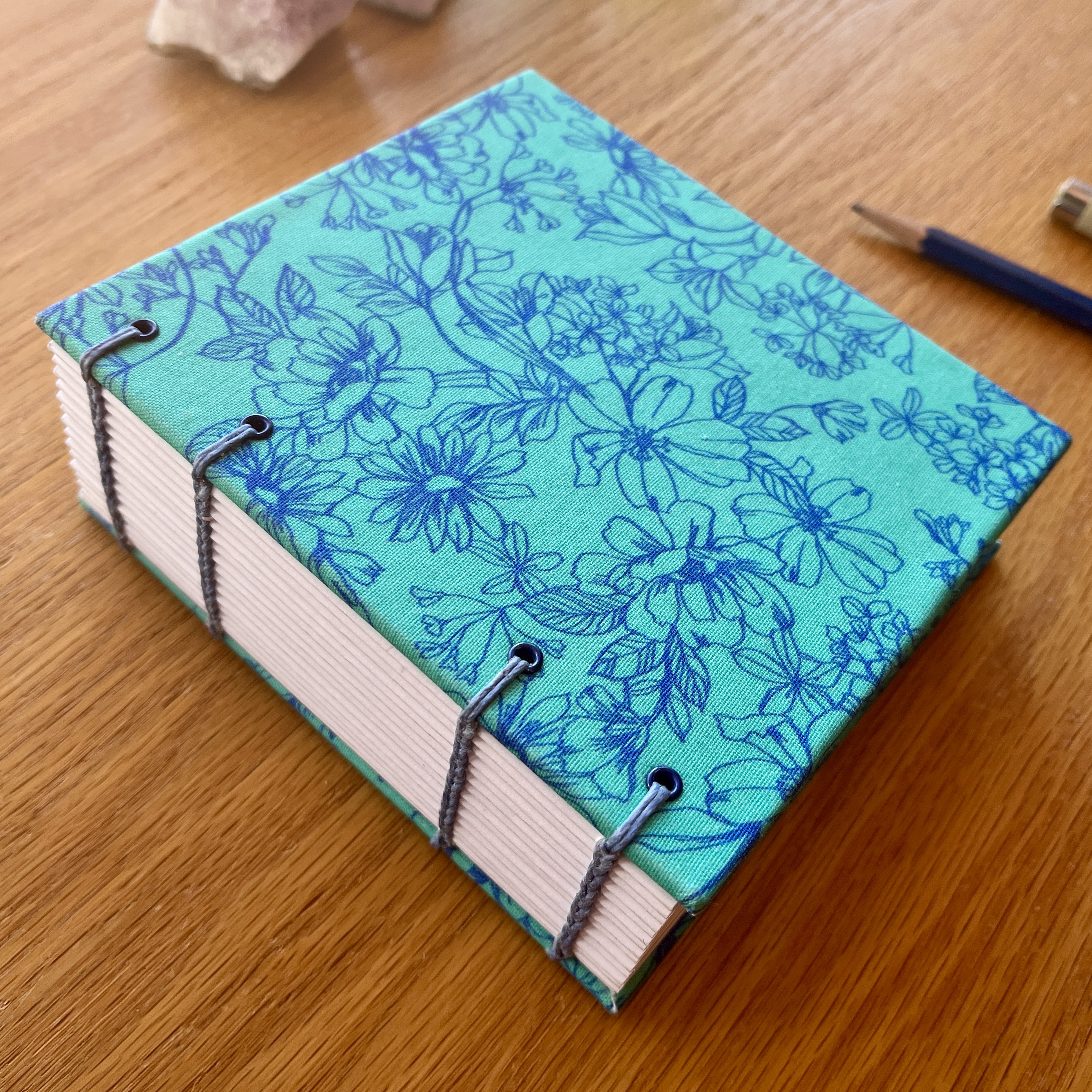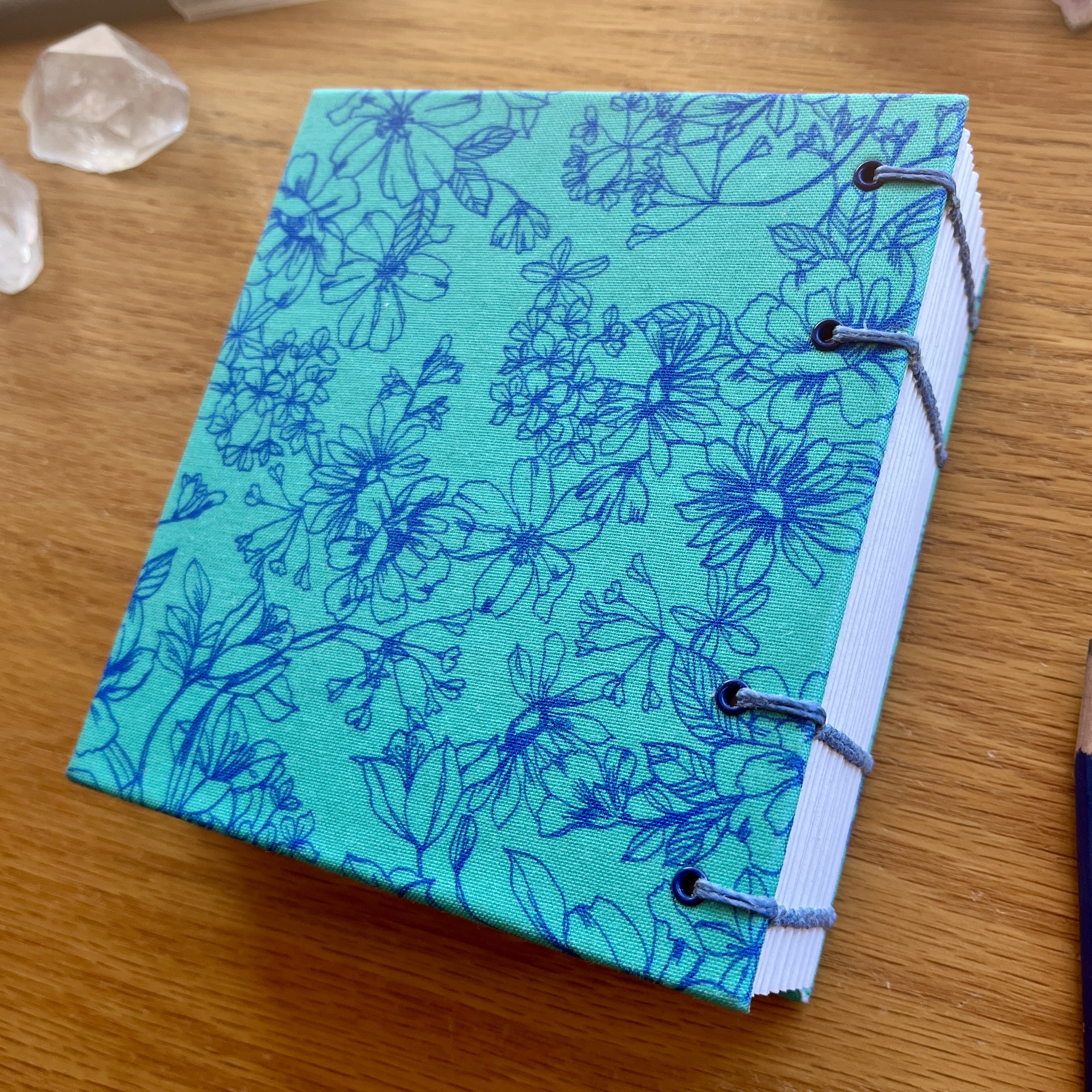 - handbound with waxed cornflower blue binding thread