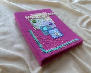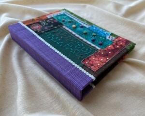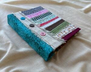 Each journal cover begins with a base of scrap quilting cotton, slow-stitched and machine-stitched with decorative thread and embroidery floss.
