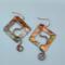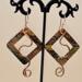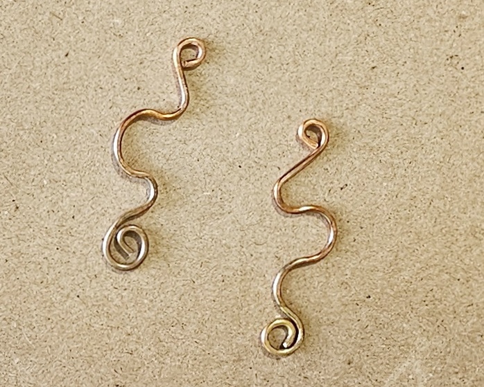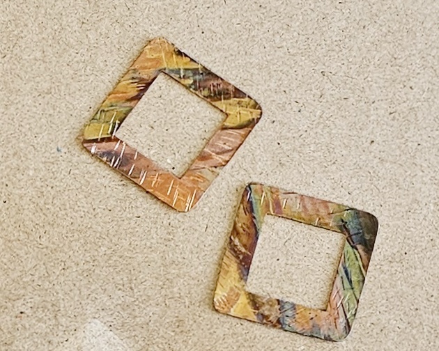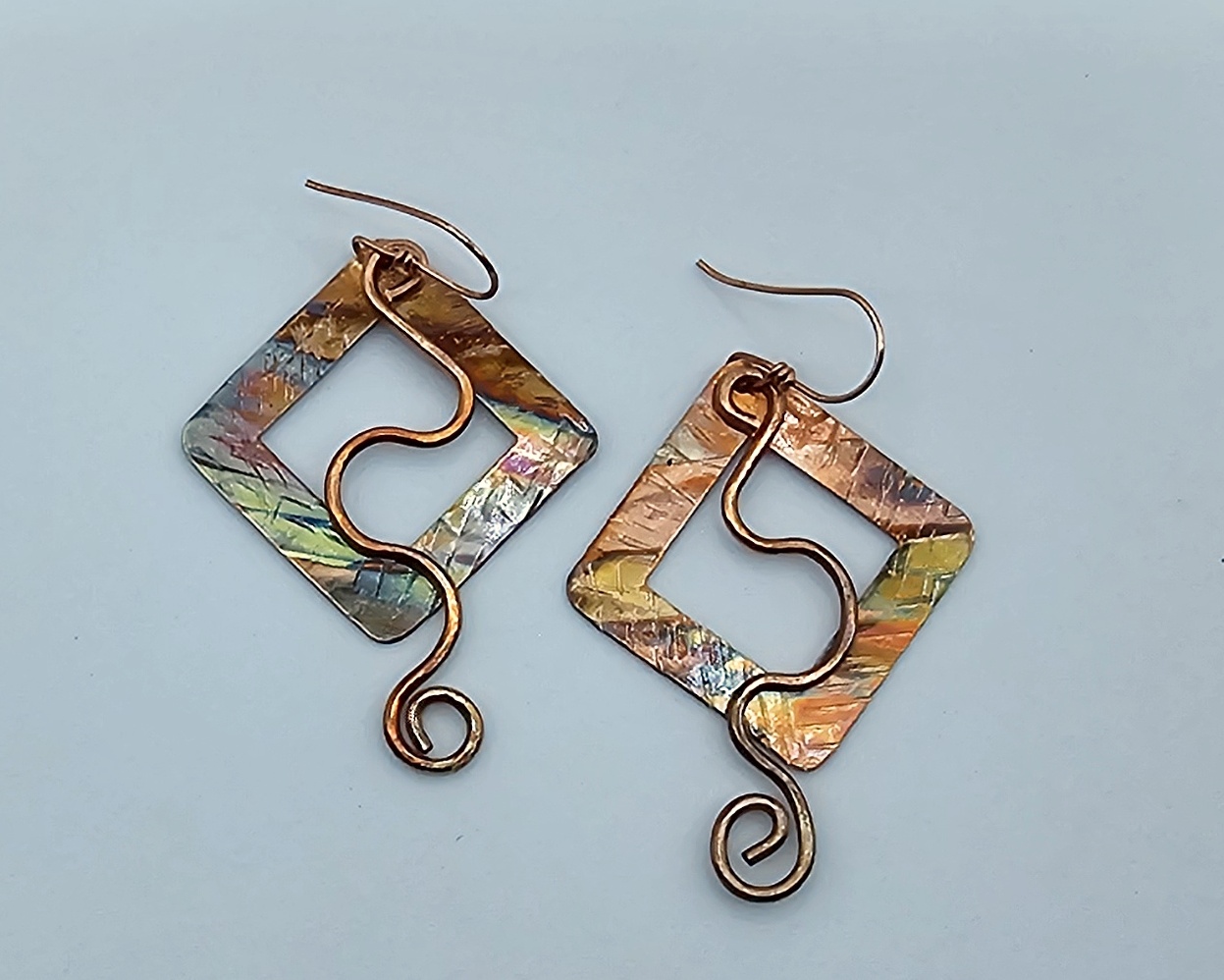 These earrings began as 24 gauge copper squares. Using a torch, I brought out all of the beautiful colors, then added a copper wire swirl and hung them on copper earring wires. I hand make all of my earring wires using 21 gauge Argentium silver, 14kt gold filled, or bare copper. Not only does this add more of a unique design element, it gives me complete control over the products that I use, ensuring quality and hypoallergenic properties. Once I have completed the design, I use a cup burr to round the end that goes in the ear so that it is smooth and comfortable to wear.