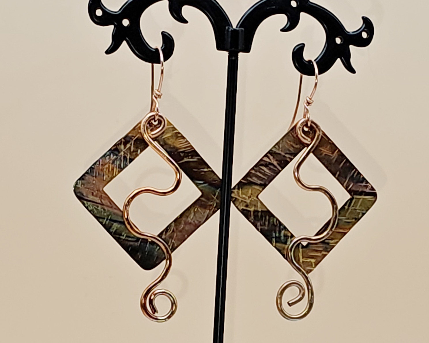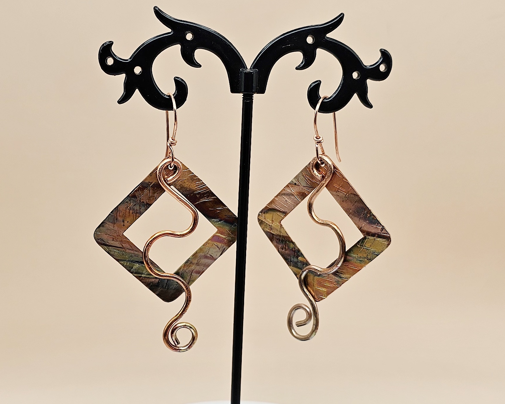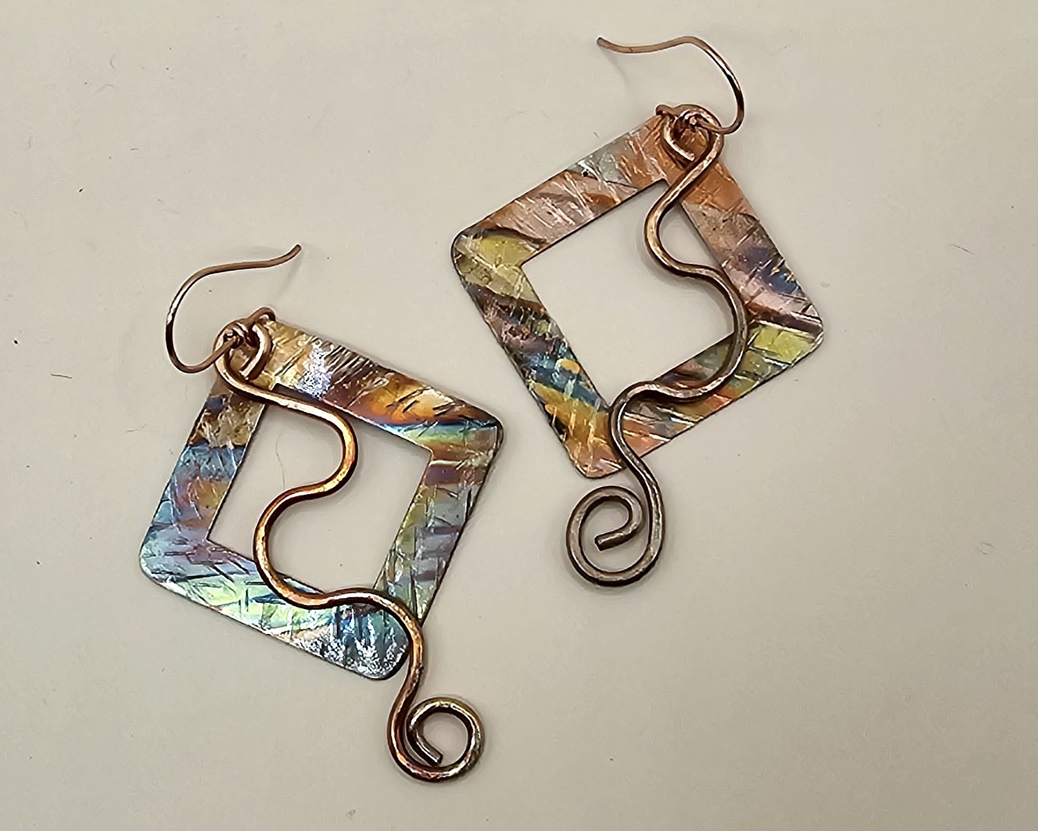 Capture the energy of fire and metal wearing these statement earrings. Carefully crafted beginning with bare copper squares, then using flame to create a shimmering spectrum of gold, rose, and blue tones, these works of art shift and change with each turn in the light. The geometric open diamond shape is accented by a hand-formed copper swirl, adding movement and artistry to every pair.