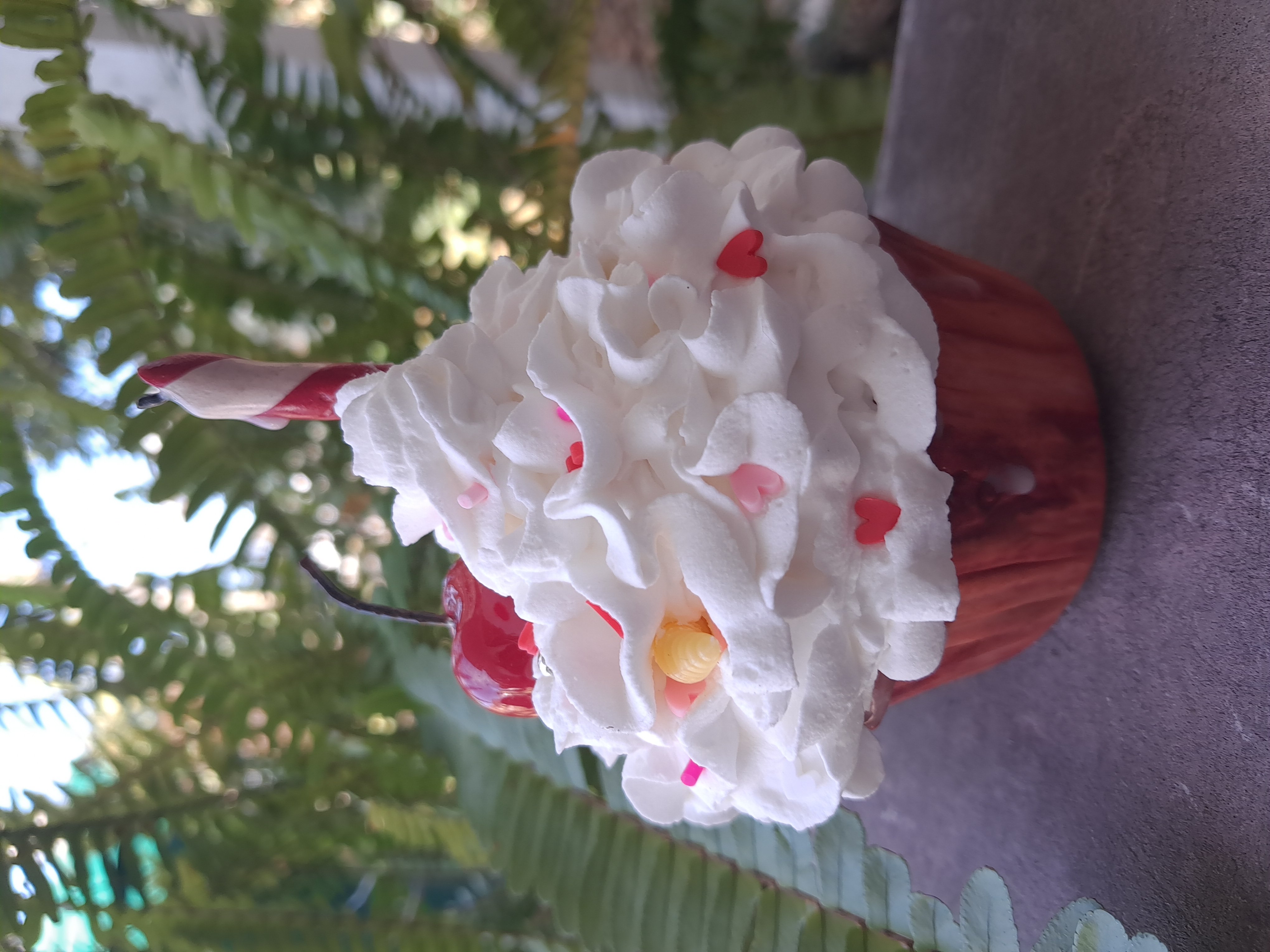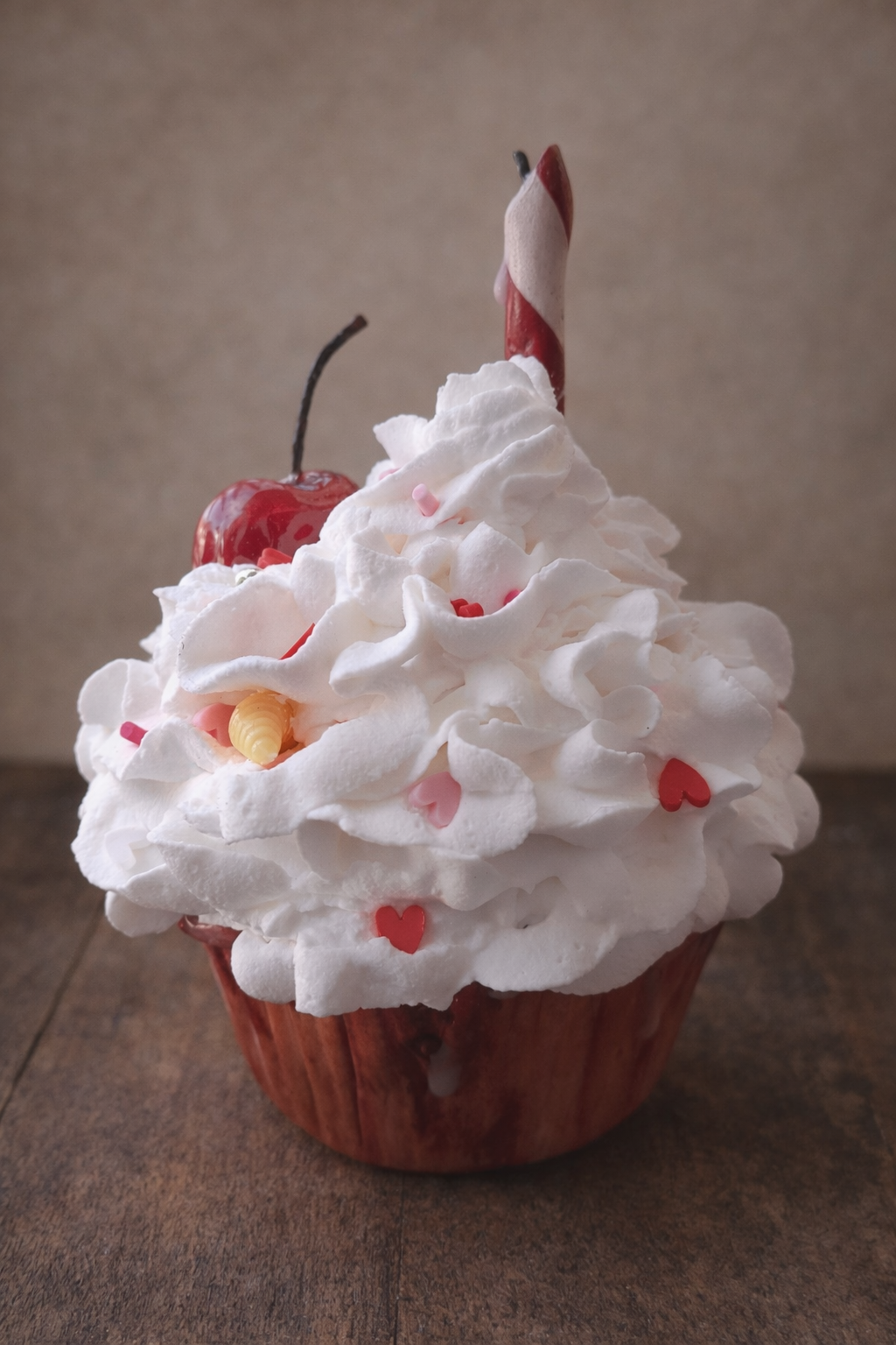 Every element is handmade, including the cupcake base, whipped topping, cherry, and candle. No plastic toppings or mass-produced parts are used. Each piece is created slowly by hand, making every “specimen” one of a kind.