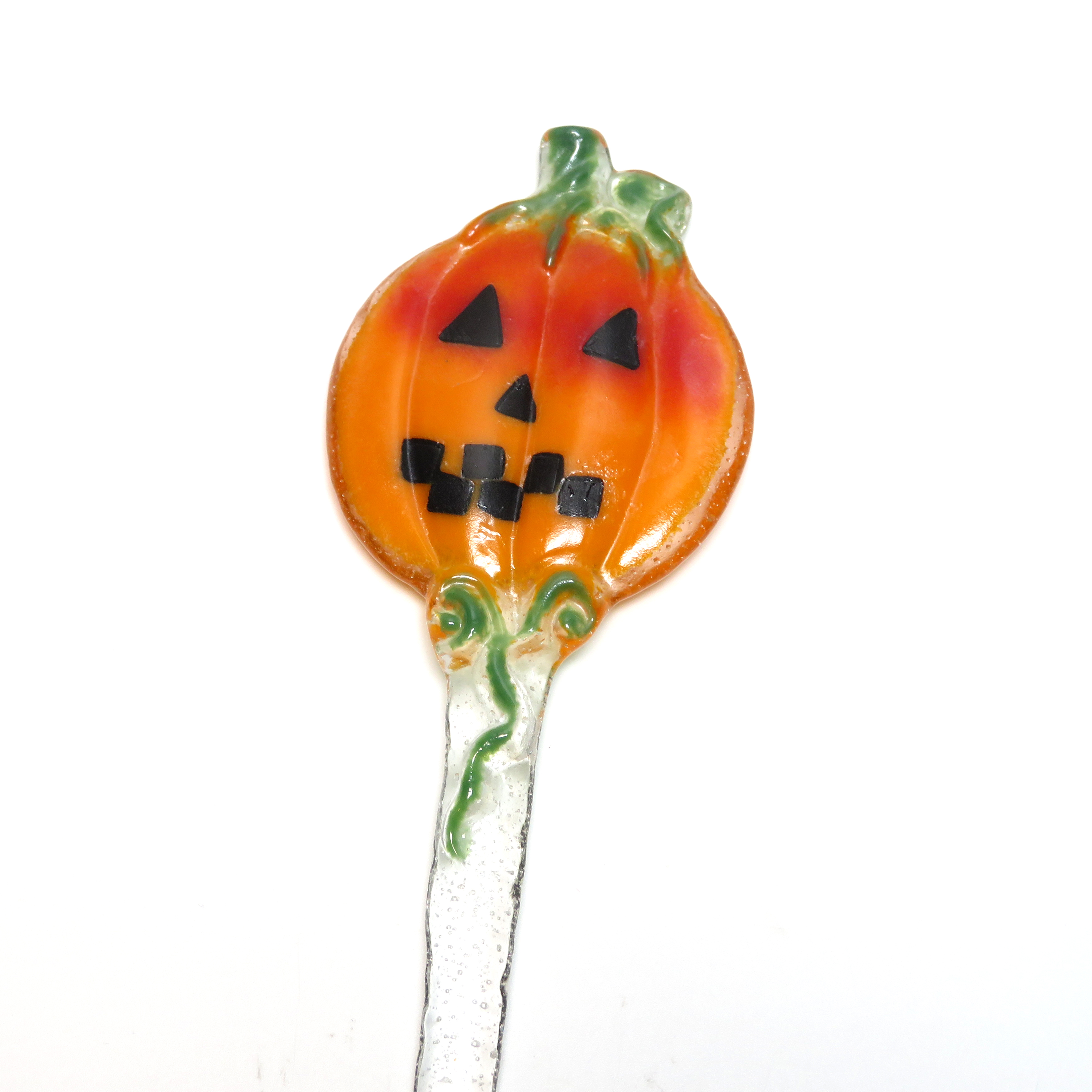 Add a touch of spooky charm to your plants with this handcrafted fused glass pumpkin planter stake! Featuring a cheerful jack-o’-lantern face with bright orange and green details, this unique Halloween decoration is perfect for flower pots or the garden. A fun way to dress up your plants for fall, or give as a thoughtful seasonal gift.