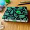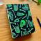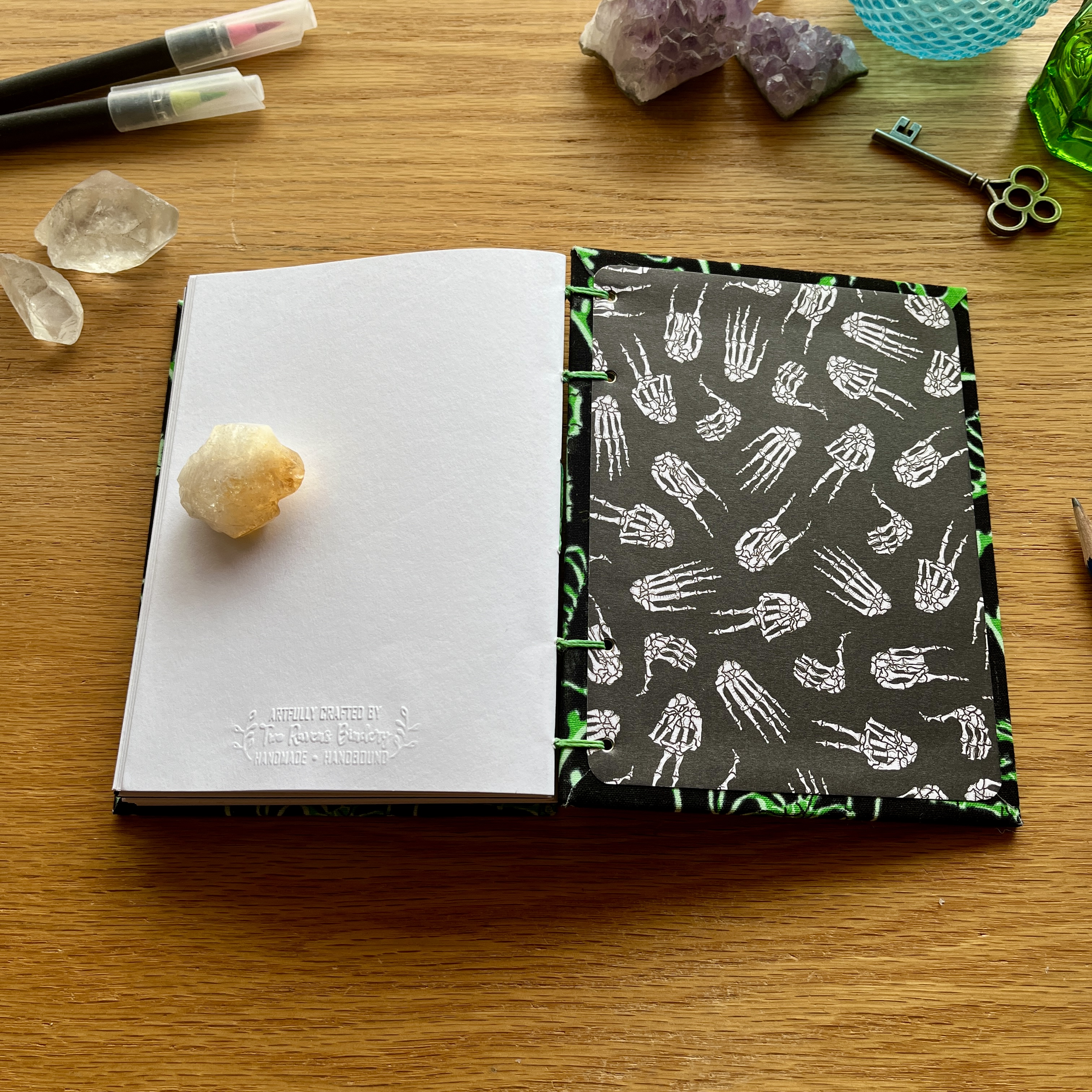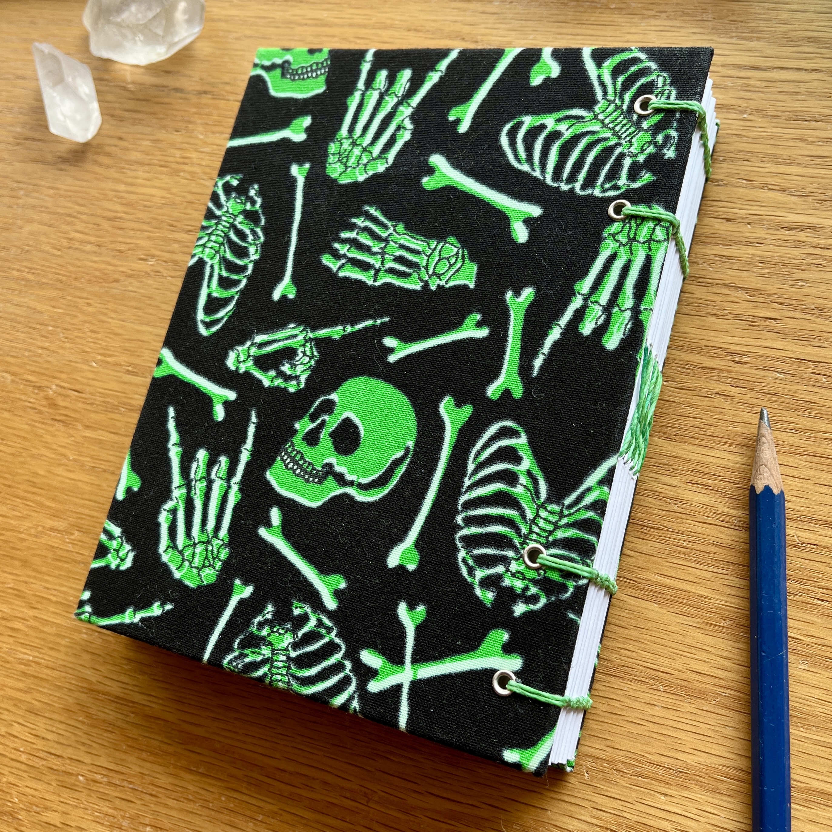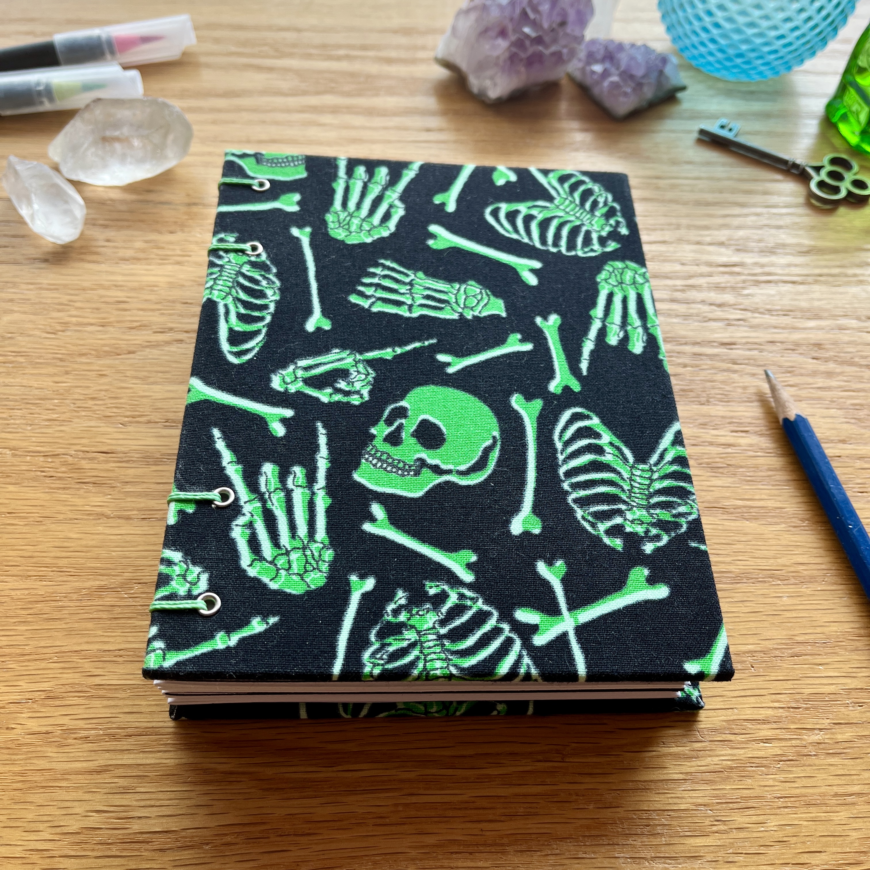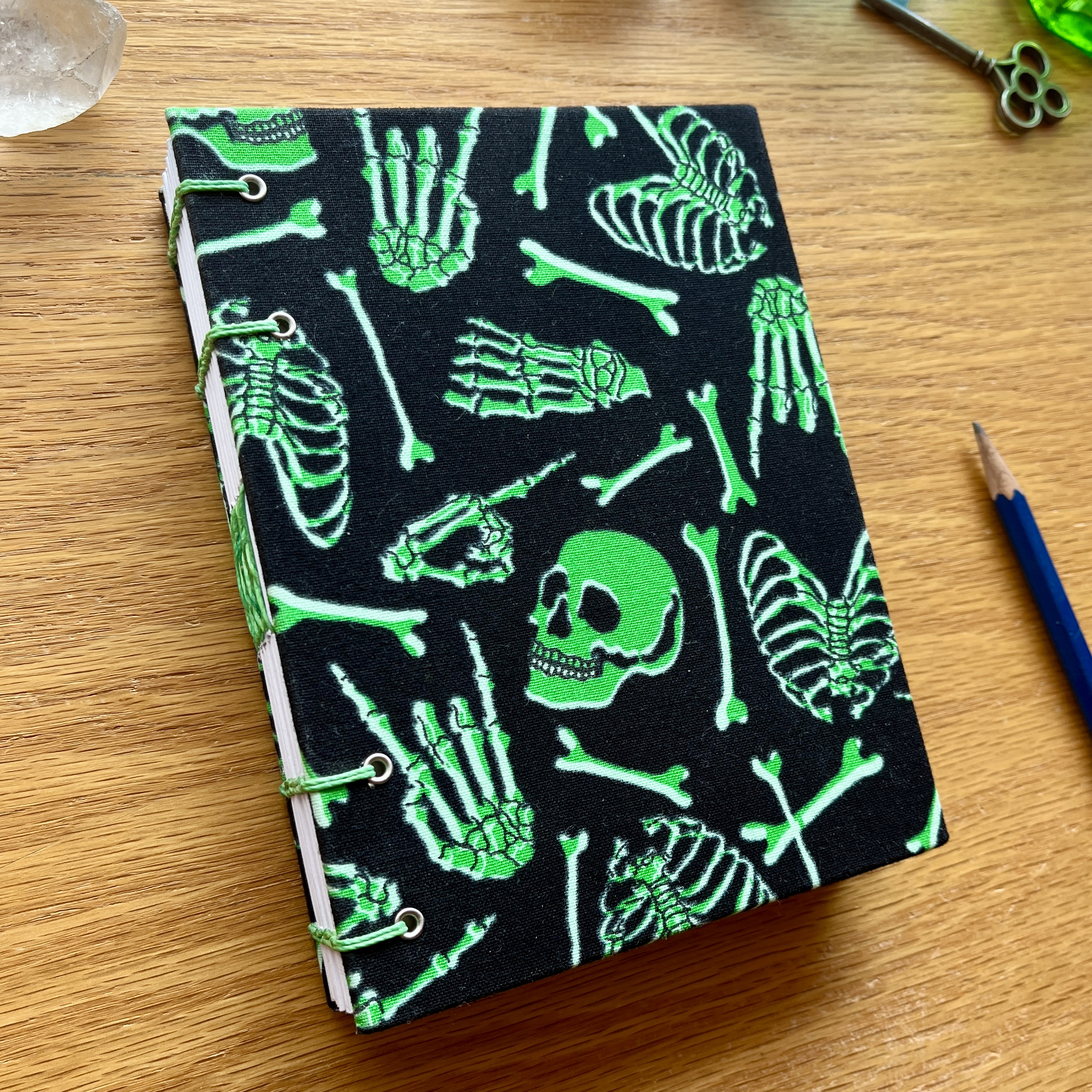 I've created the covers with glow in the dark skulls and bones book cloth and meticulously handbound using a coptic french link binding technique which allows the book to lay perfectly flat when open for ease of use.