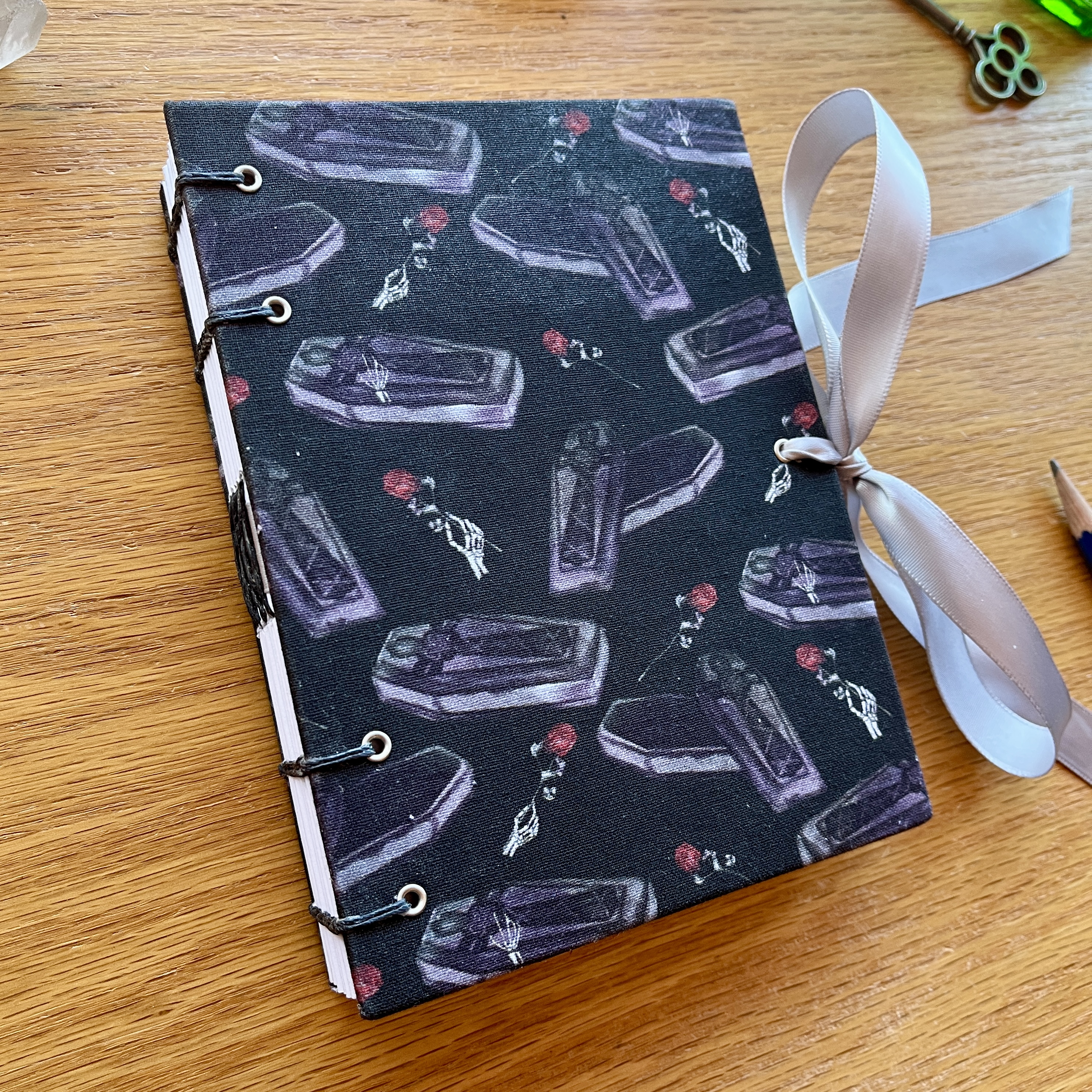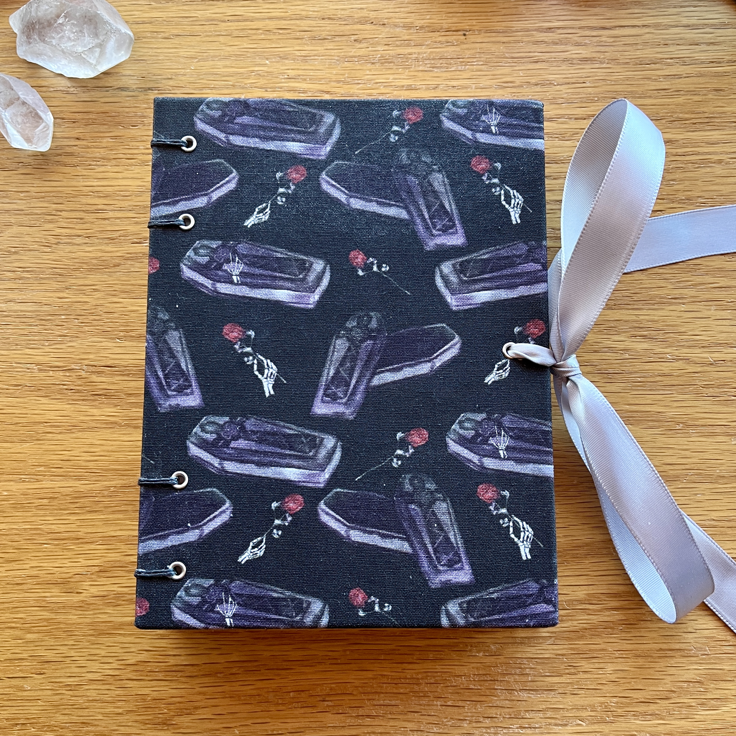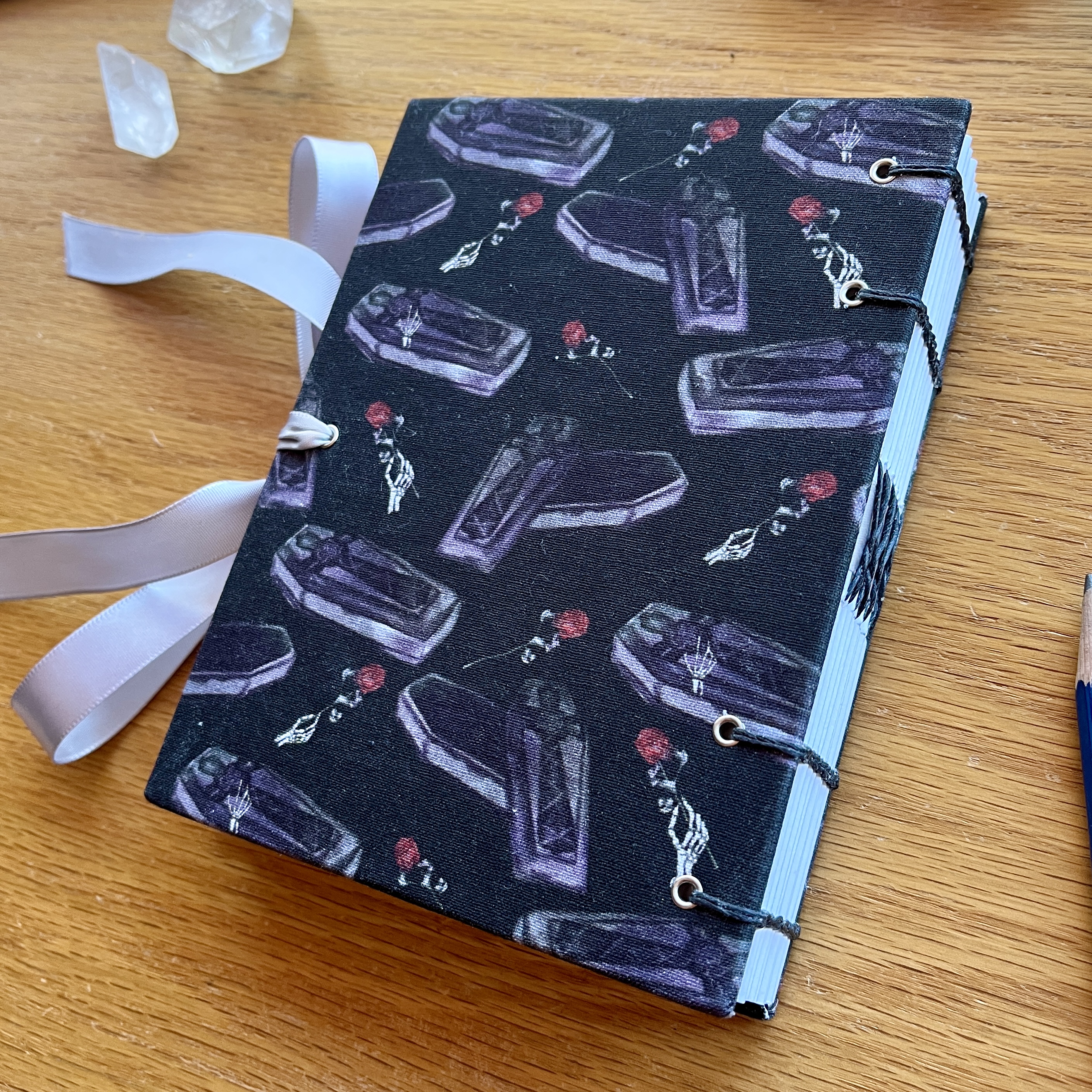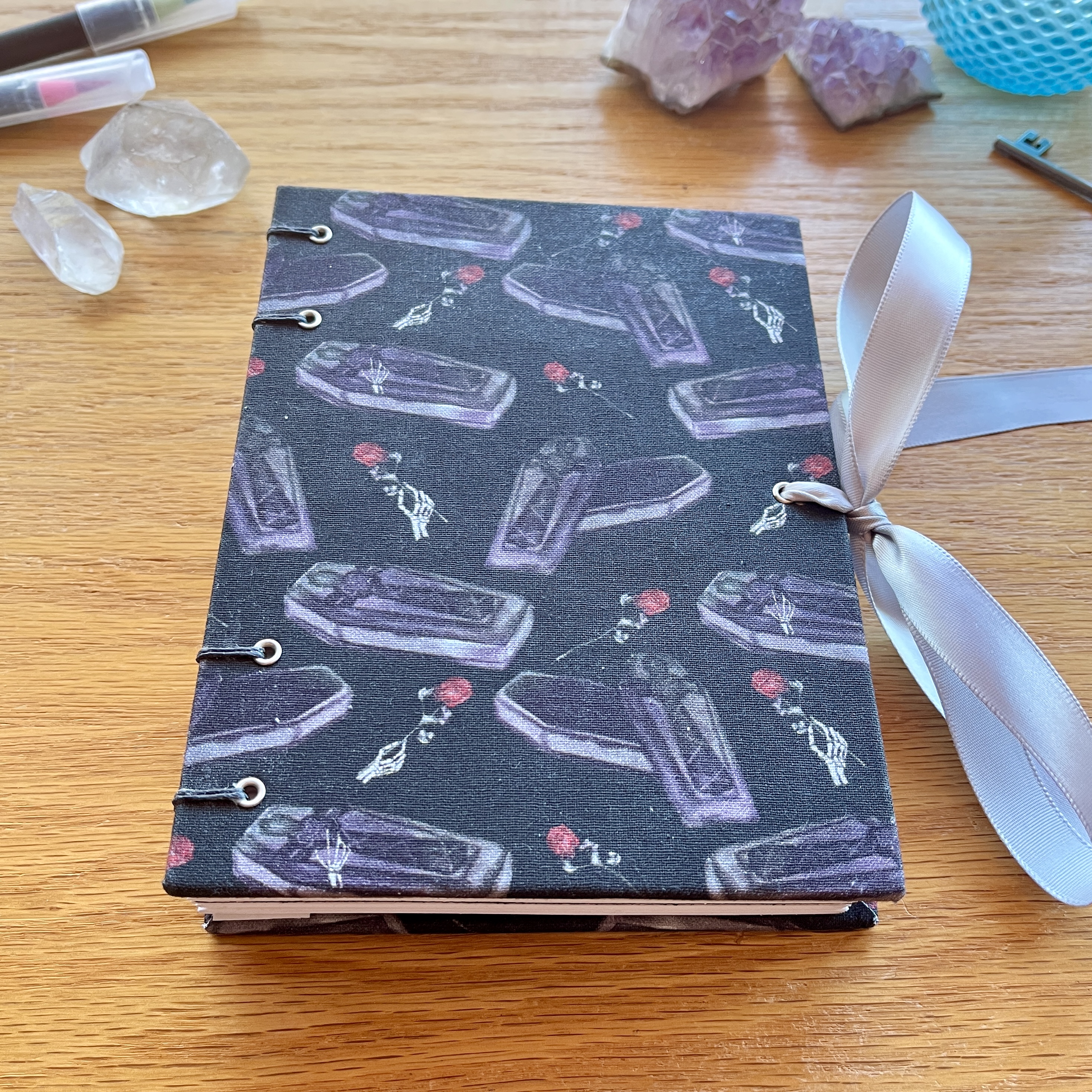 Covered in a spooky coffins and roses themed book cloth and meticulously handbound using a coptic french link binding technique which allows the book to lay perfectly flat when open for ease of use. Plus I wove through the binding a convenient charcoal grey satin ribbon closure to keep the book nicely secured. :)