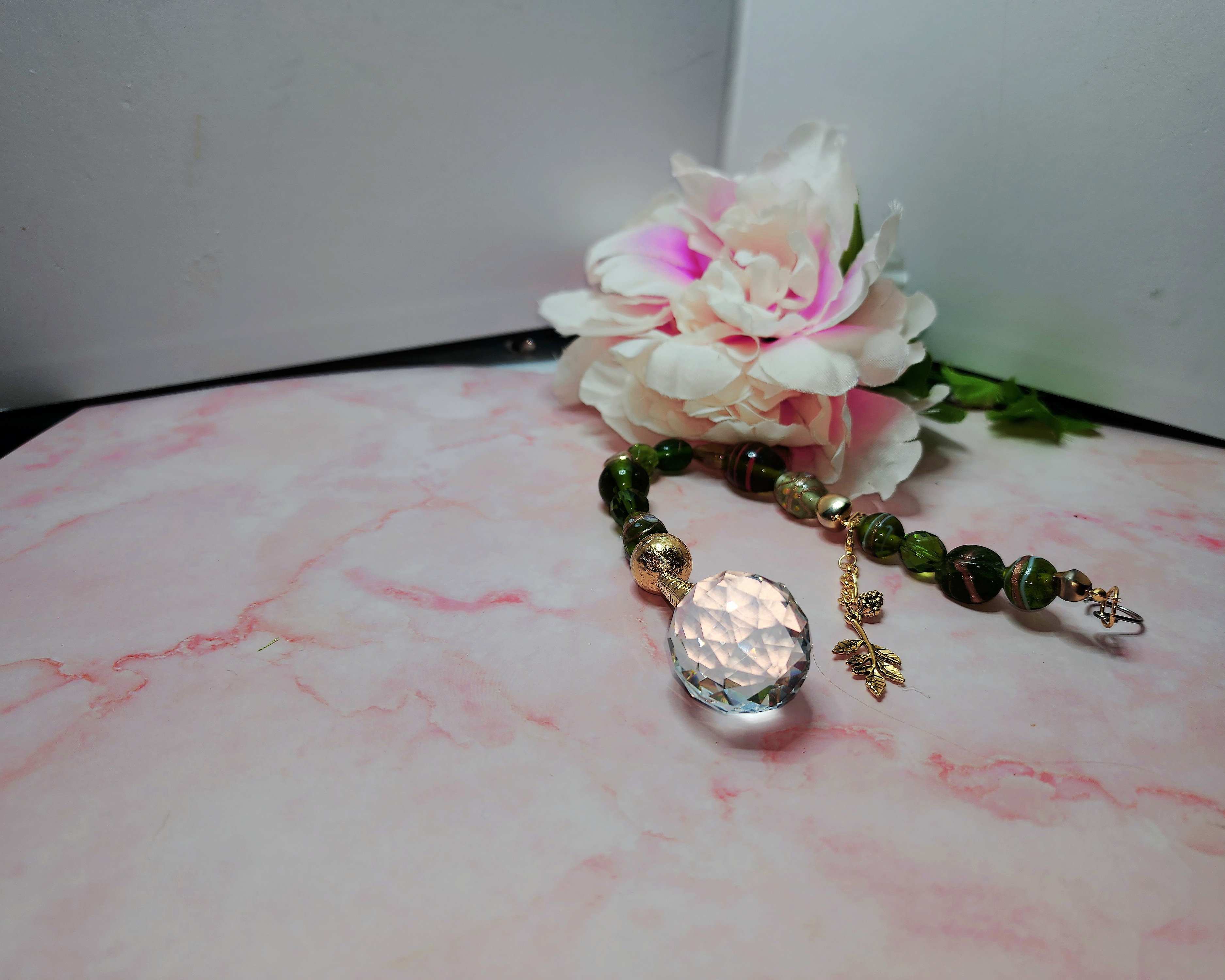 Add a touch of nature to your space with this stunning suncatcher! Handcrafted from green glass and stone, featuring a 30mm crystal prism ball that sparkles beautifully in the sunlight. Accented with gold tone leaf and acorn charms and a gold tone bead cone for extra charm. Perfect for adding a pop of color and positive energy to any room. Somebody you know just bought a new home? This stunning piece of home decor would be the perfect housewarming gift.