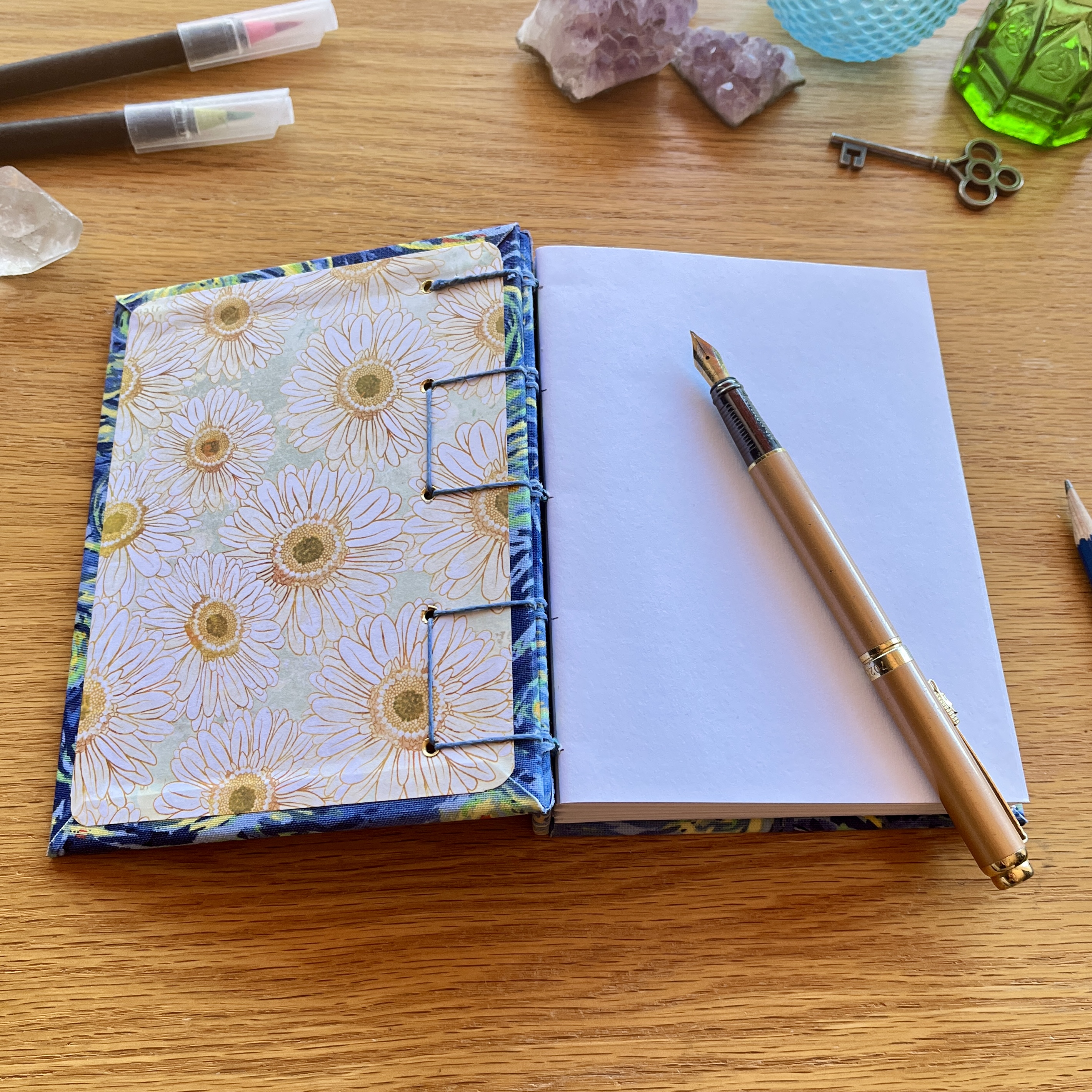 - handbound with waxed cornflower blue binding thread on the outside and waxed teal blue binding thread inside