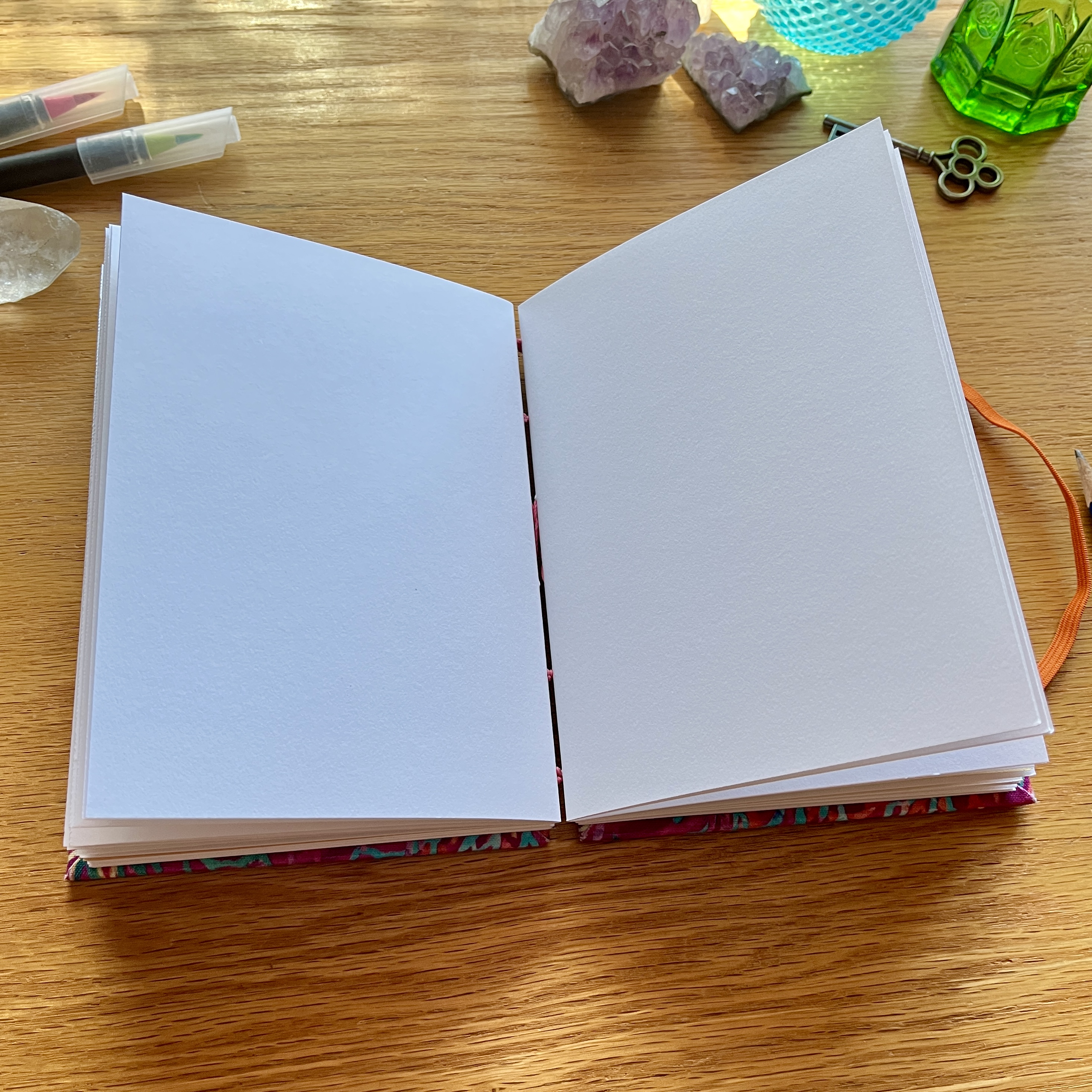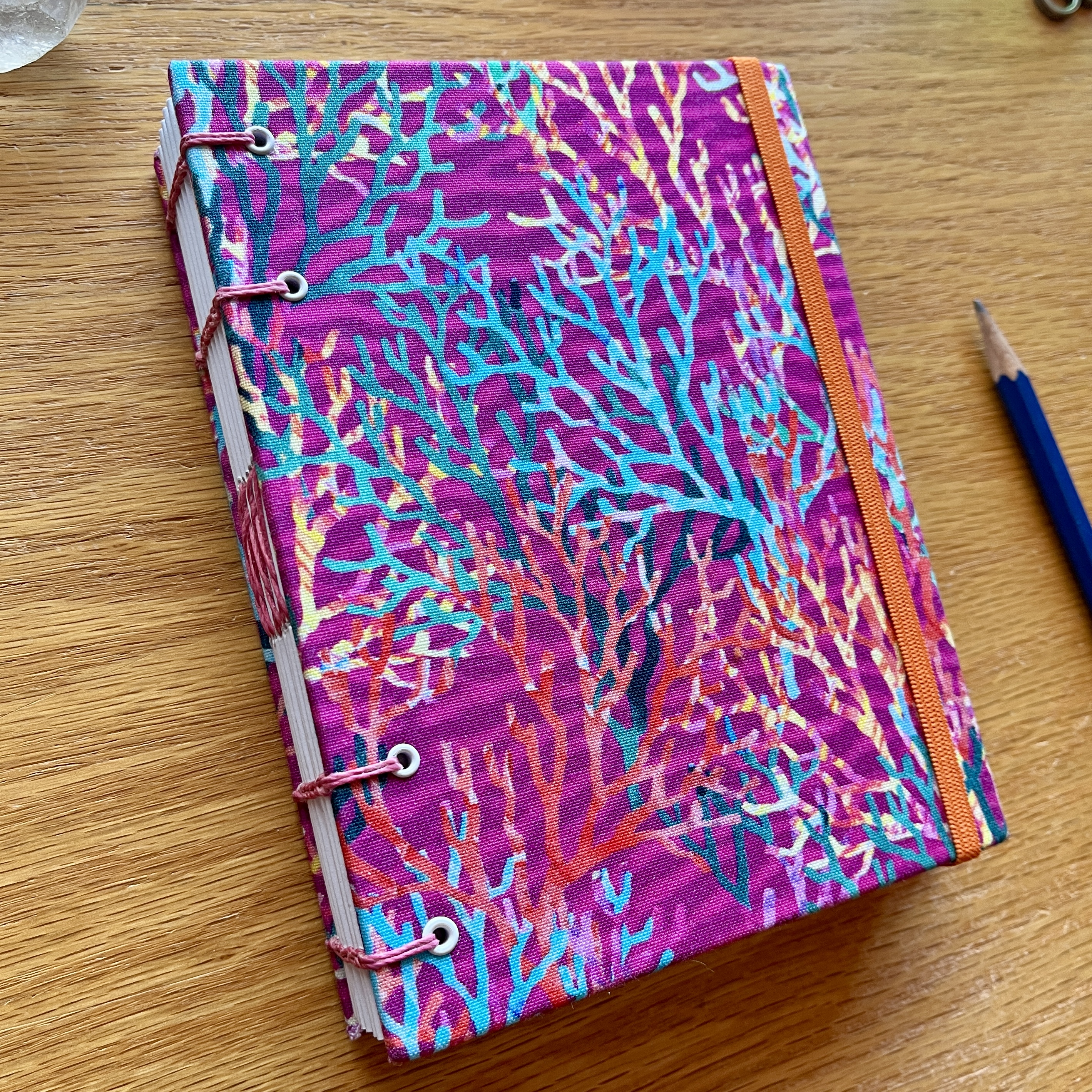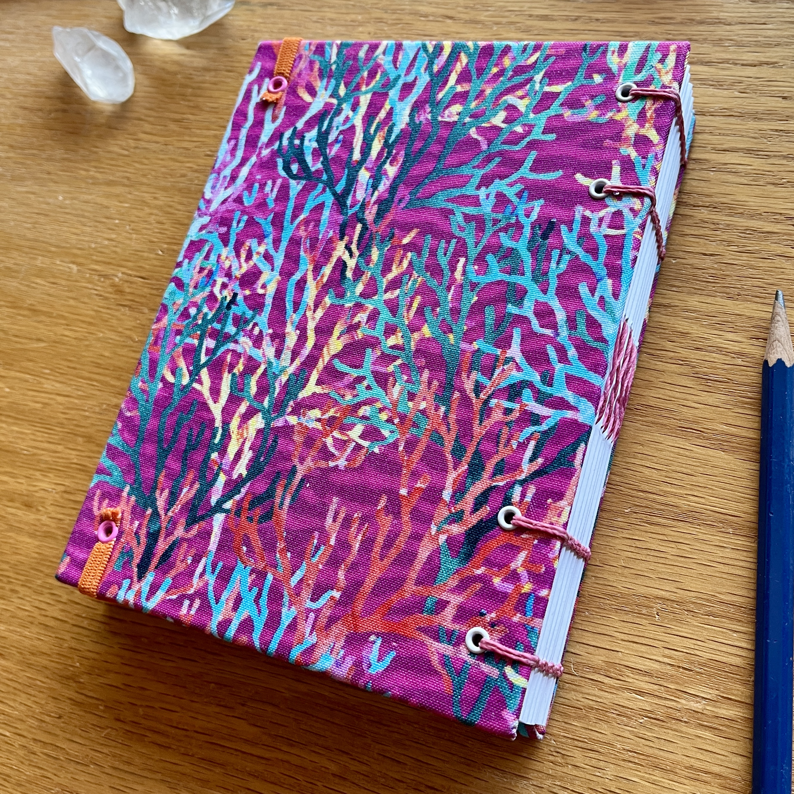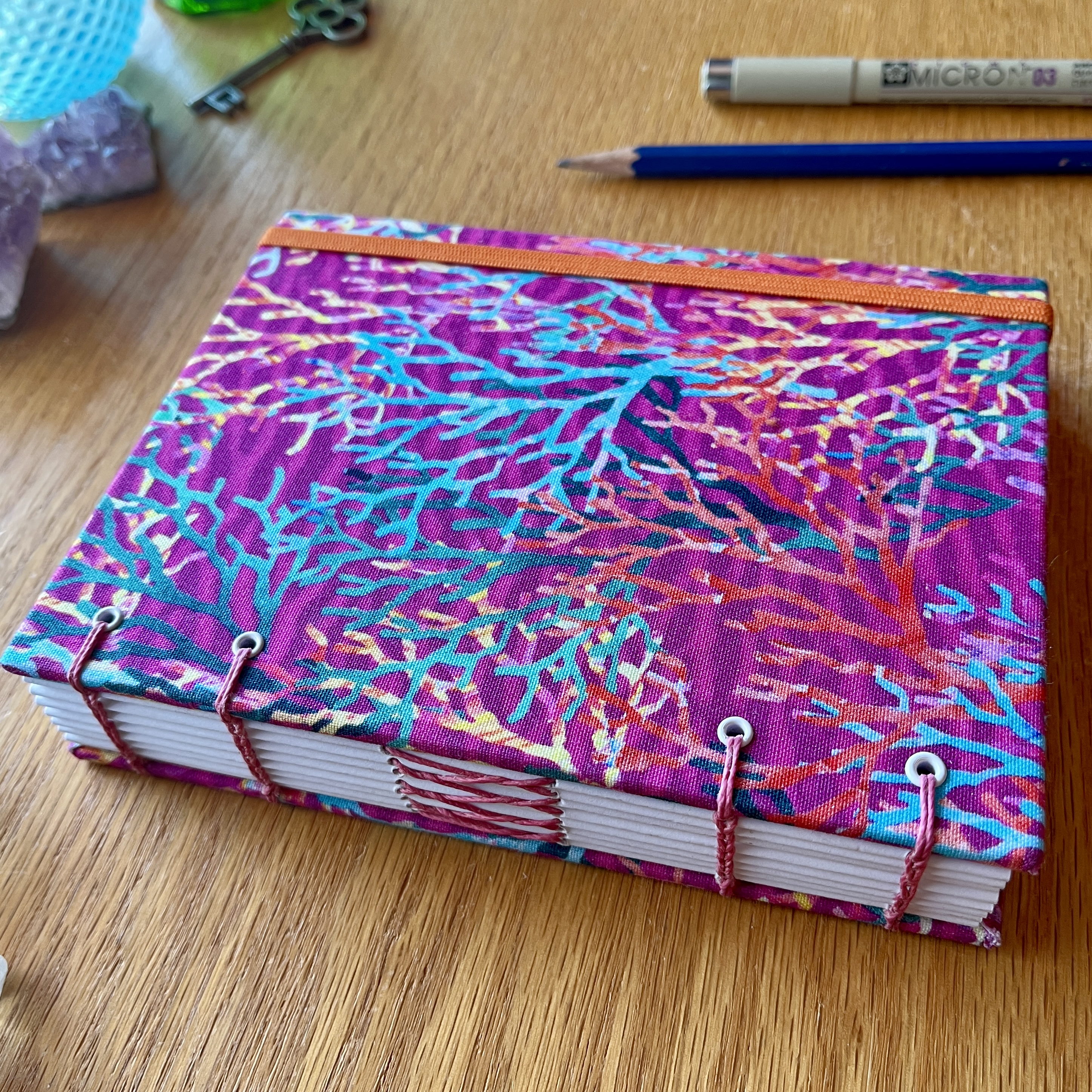I've created the covers using an eye-catching coral patterned book cloth. Then meticulously handbound it using the coptic french link technique which allows the book to lay perfectly flat when open for ease of use.