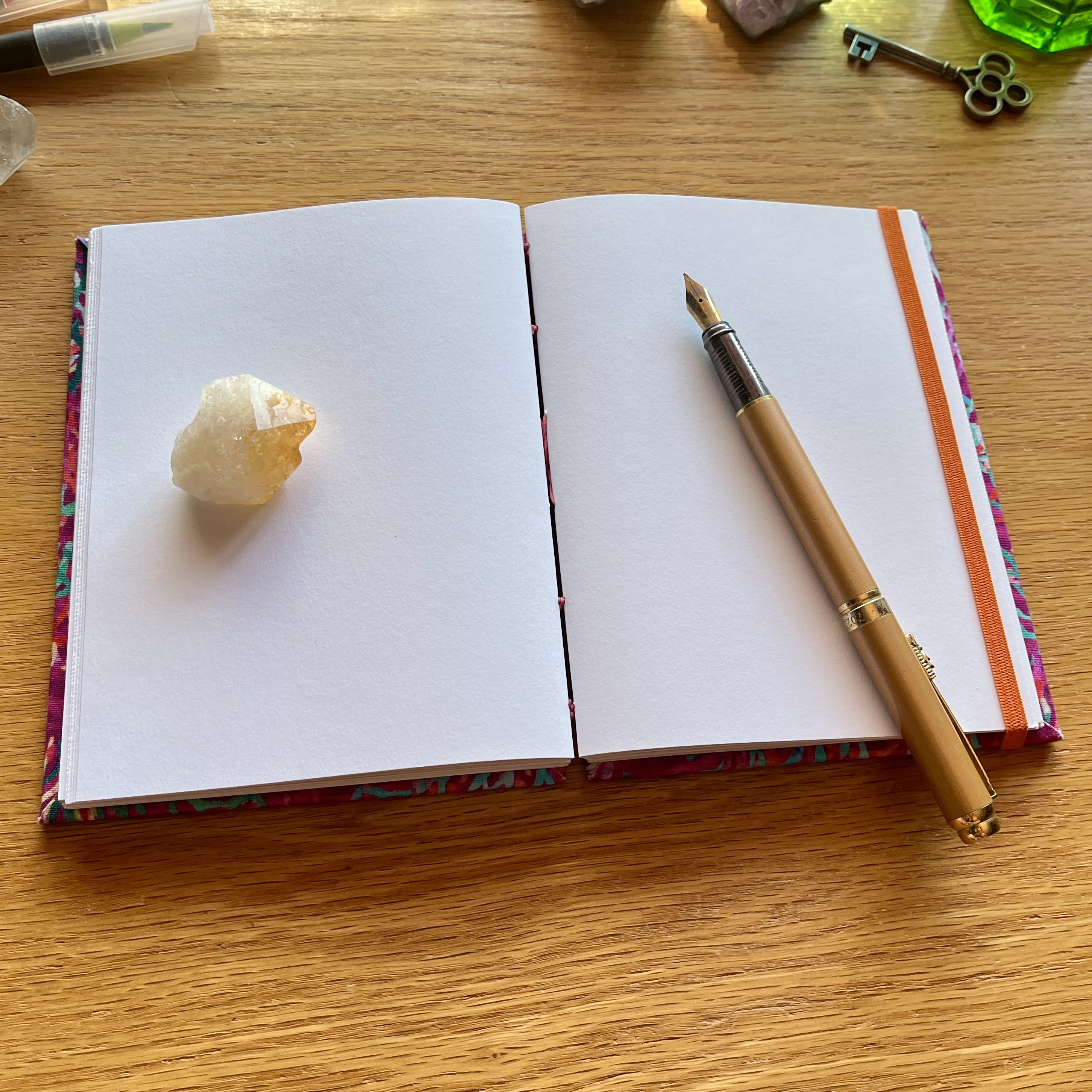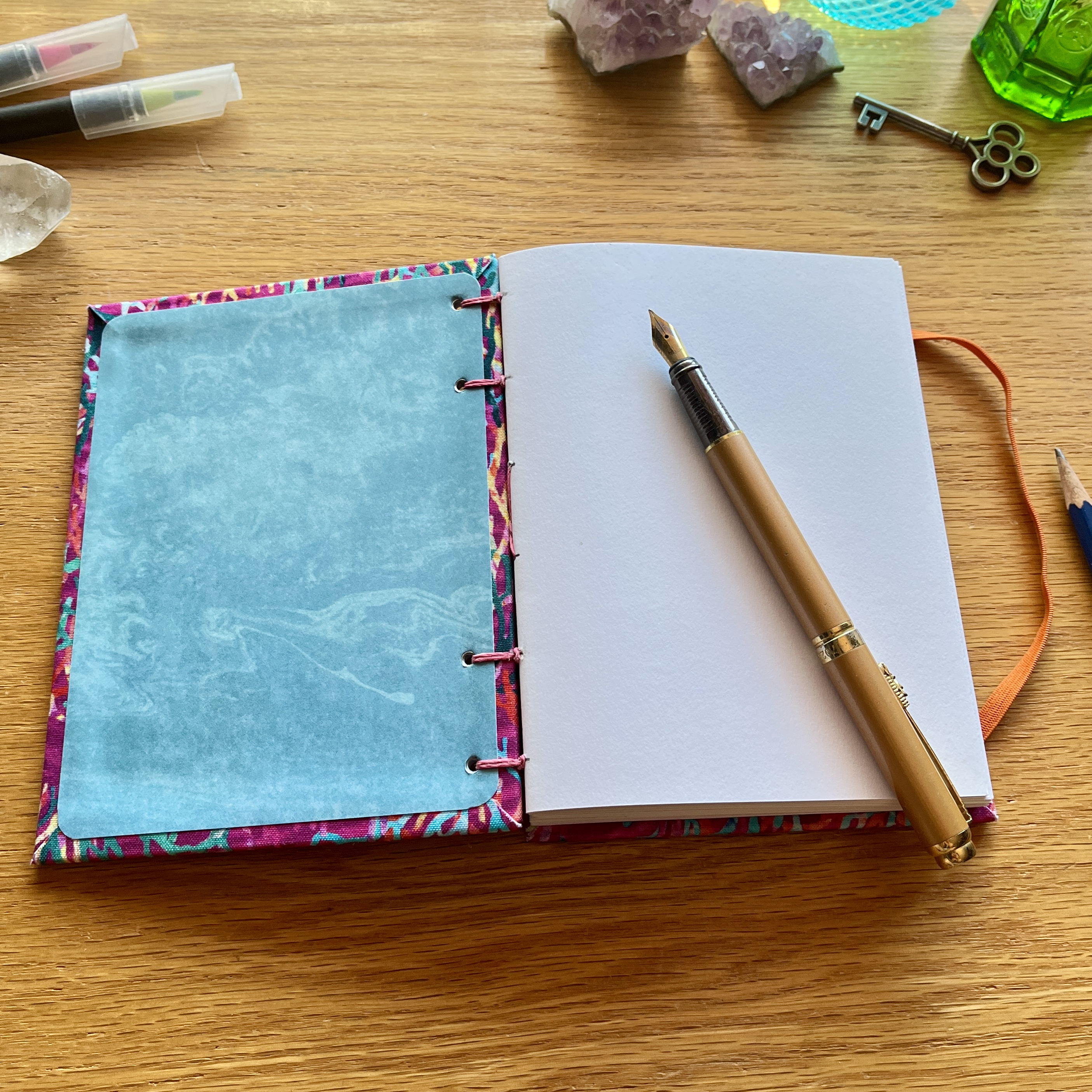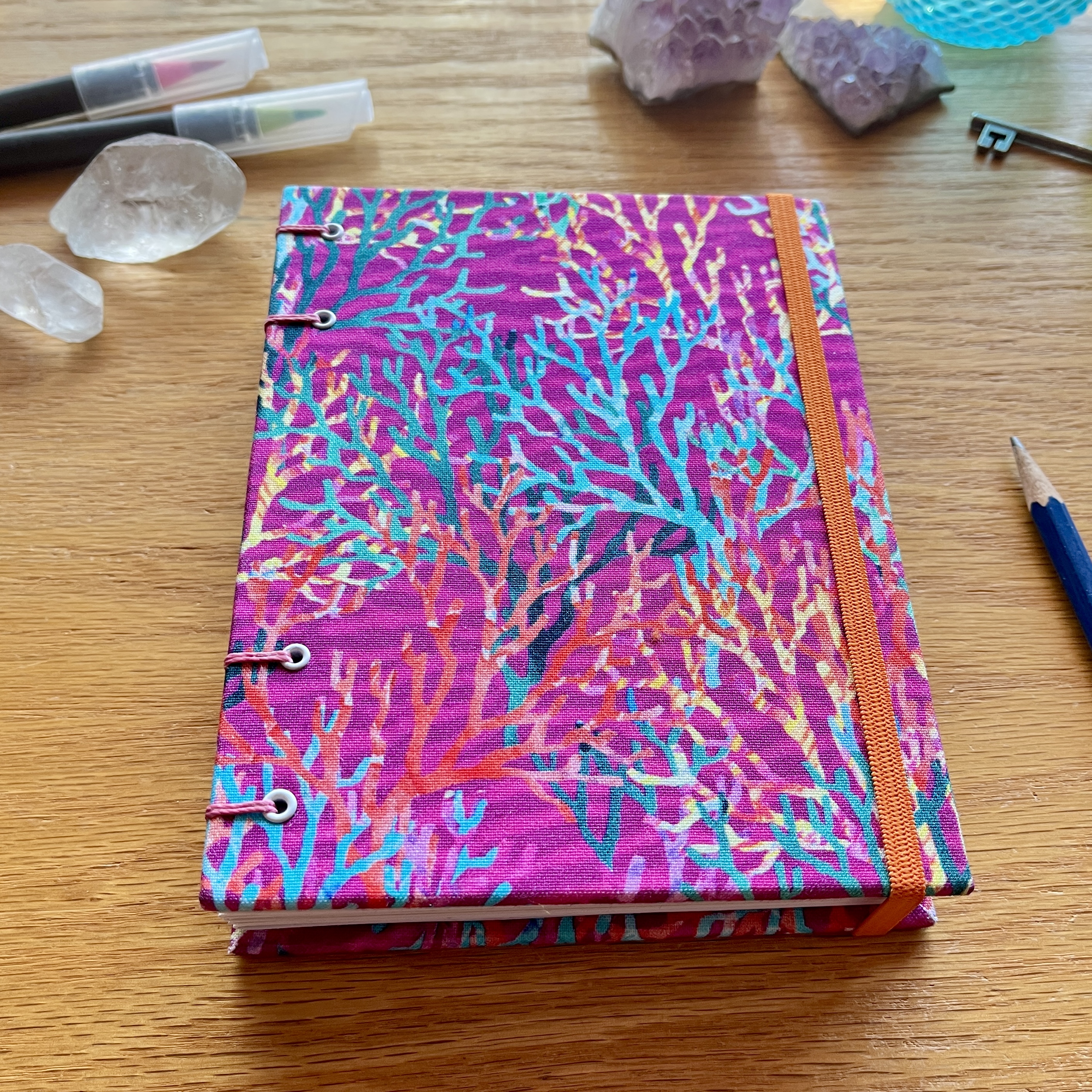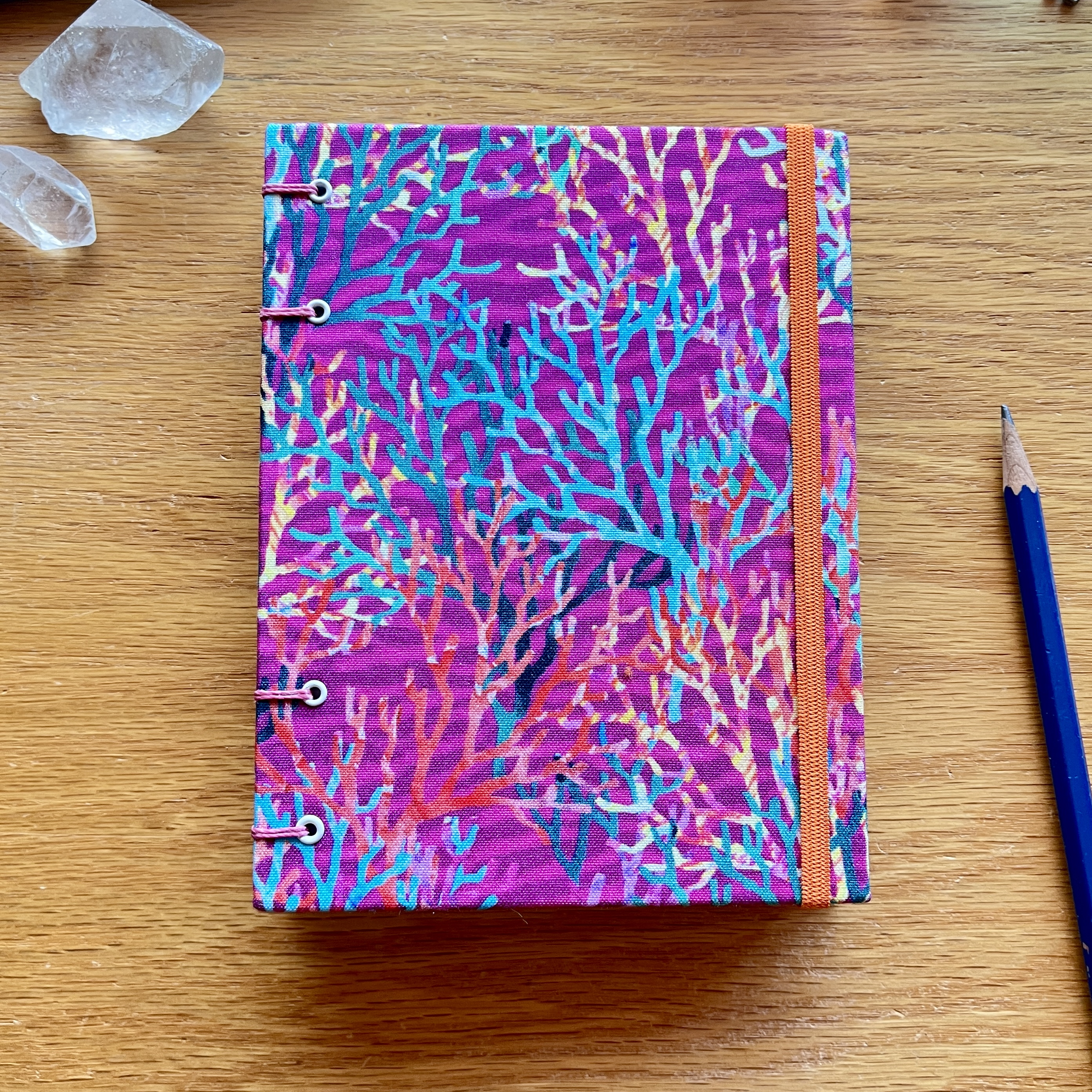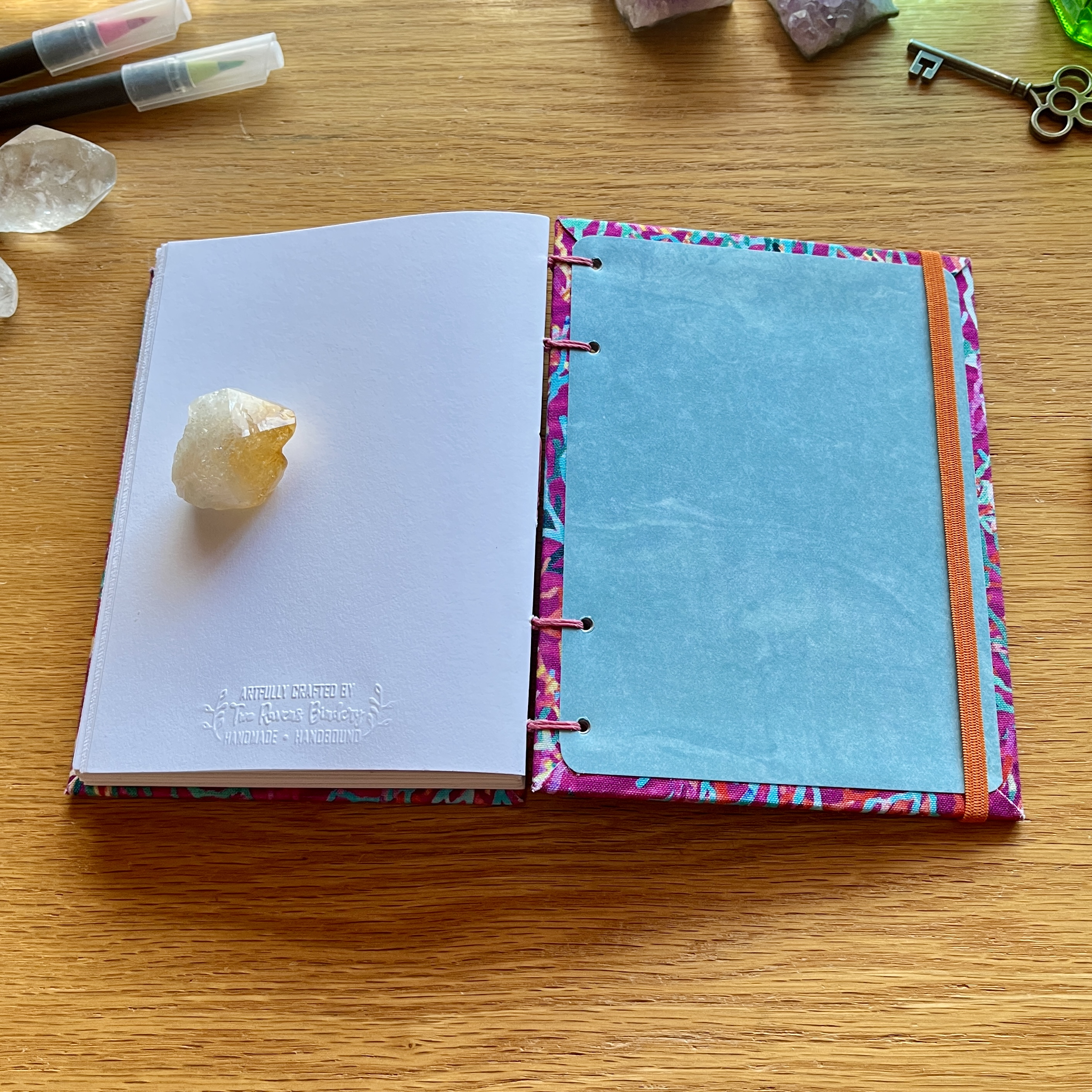 I've created the covers using an eye-catching coral patterned book cloth. Then meticulously handbound it using the coptic french link technique which allows the book to lay perfectly flat when open for ease of use.