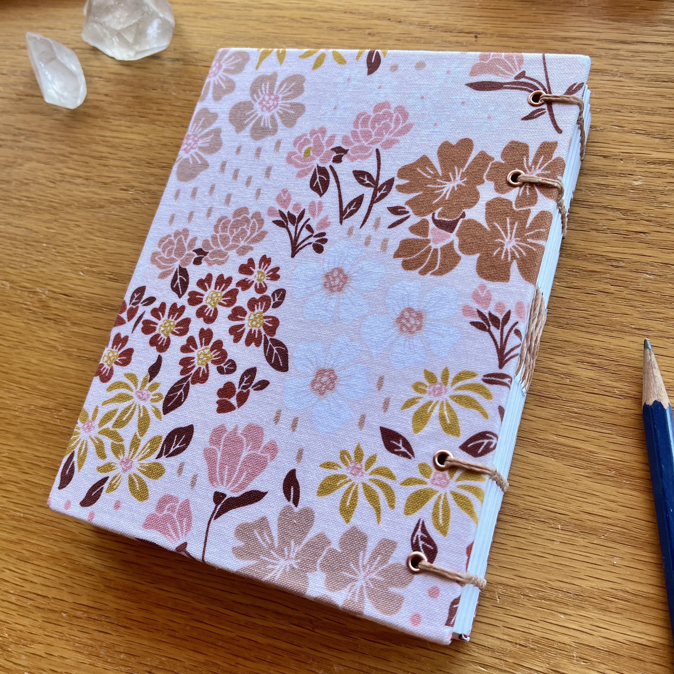 I've created the covers in a floral themed book cloth. Then meticulously handbound it using the coptic french link technique which allows the book to lay perfectly flat when open for ease of use.