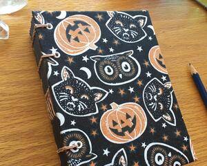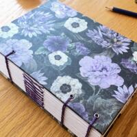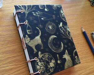 I've created the covers for this book using a durable foral skulls book cloth and meticulously handbound it using the coptic french link binding technique which allows the book to lay perfectly flat when open for ease of use.