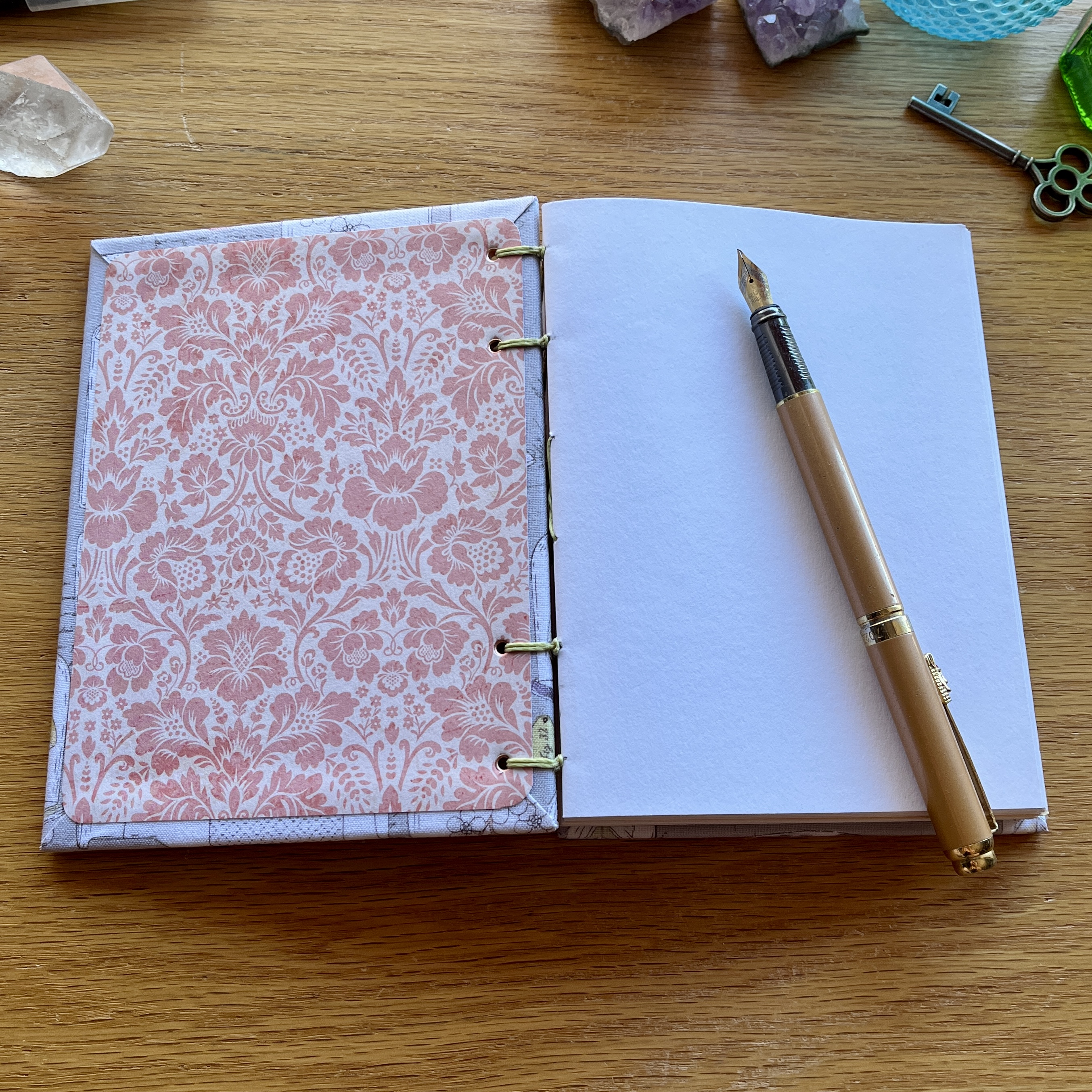 - finished with coordinating vintage style floral pattern endpapers and copper metal eyelets